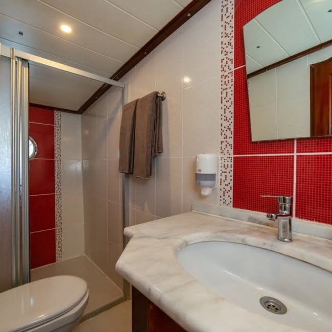 She has a shower cabin, toilet and air conditioning in every cabin.