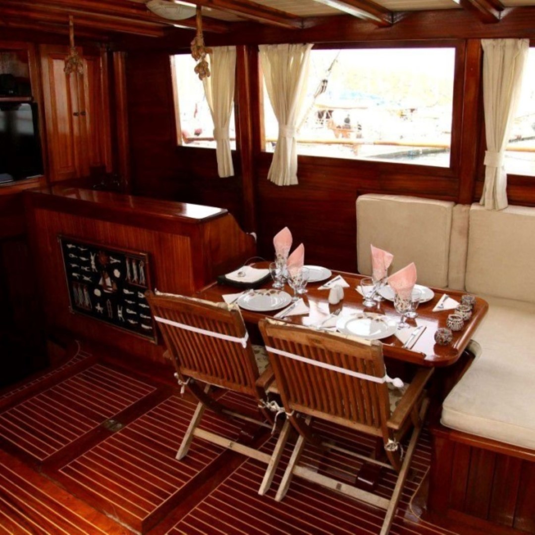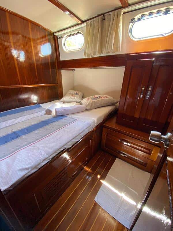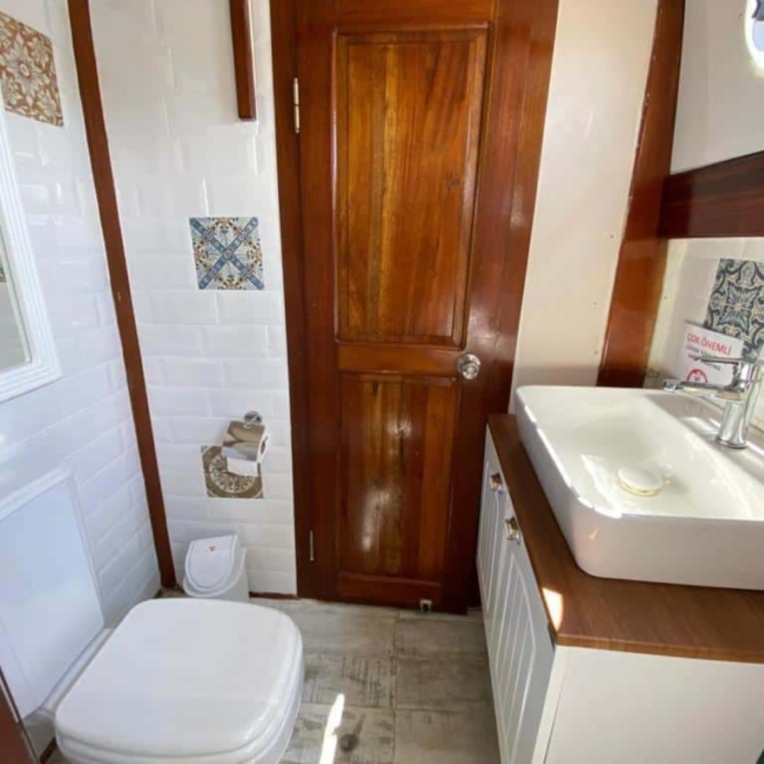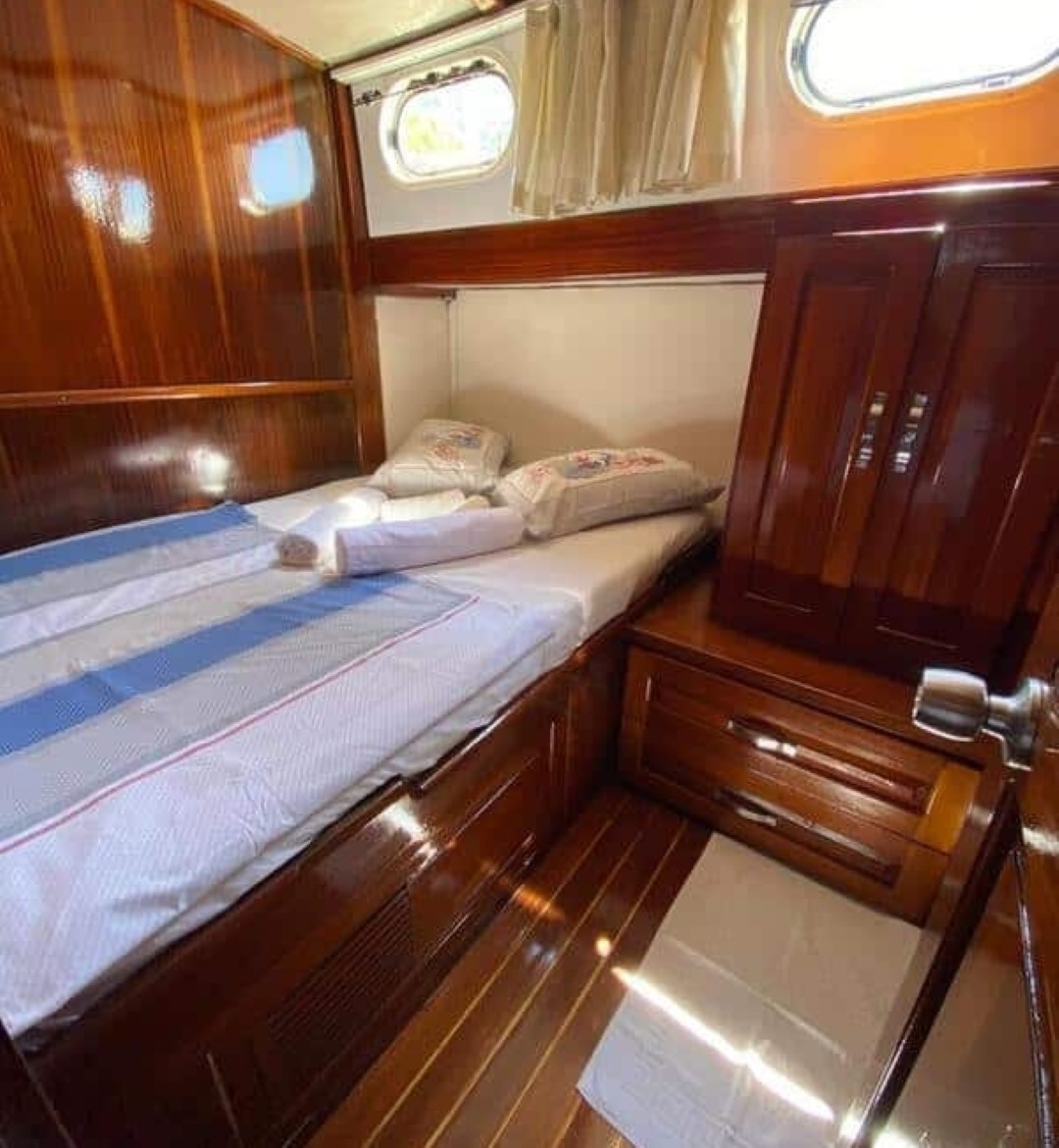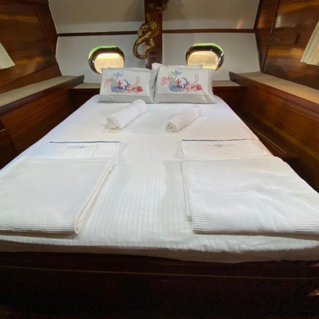 Gulet Aria has a total of 4 cabins, 2 masters and 2 doubles. Passenger capacity is a maximum of 8 people. All cabins have air conditioning, bathrooms with shower cabin, WC, bath and hand towels. There is a TV, music system and sitting group in the living room. fishing equipment, mask, fins, snorkel, backgammon, okey and playing cards are on board.