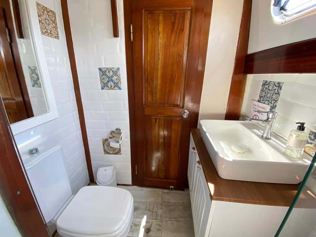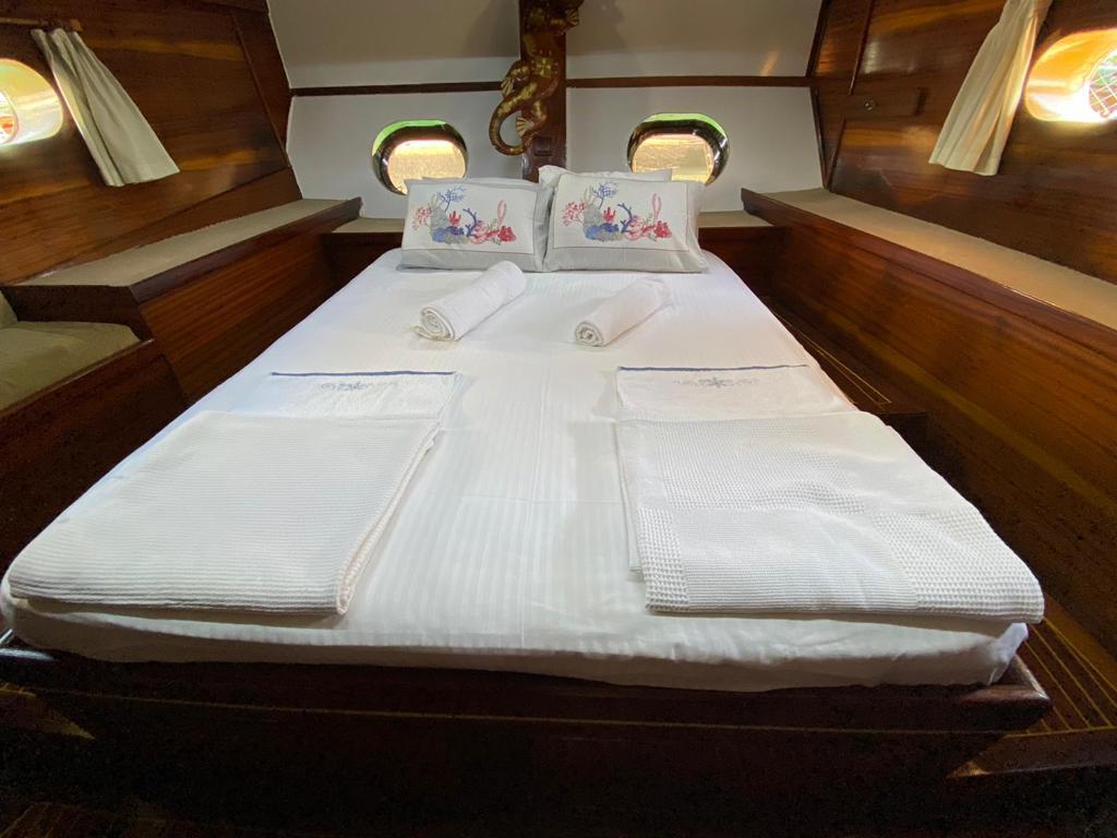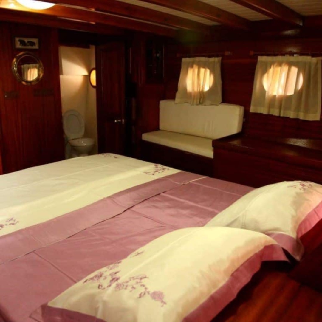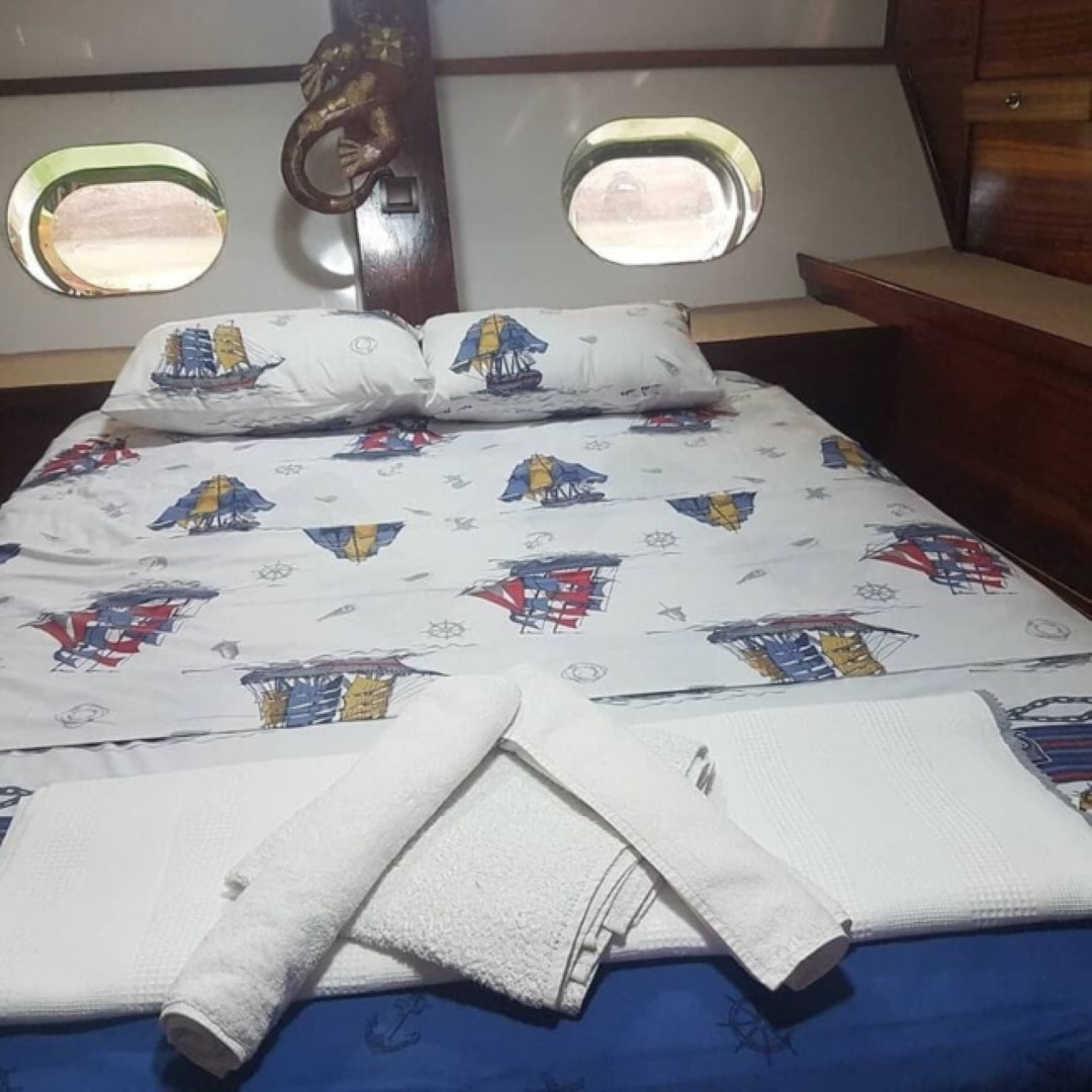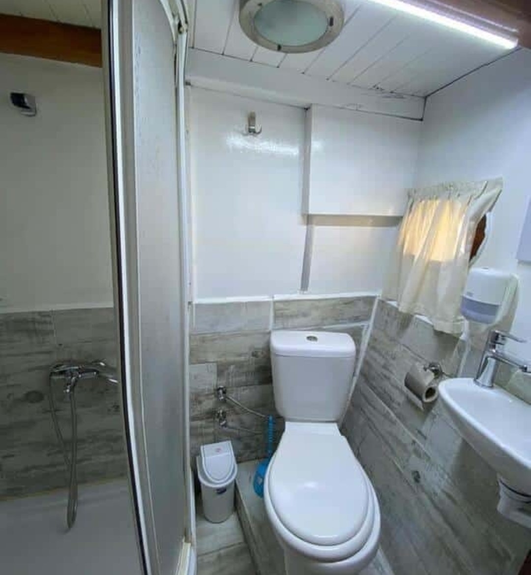 Gulet Aria has a total of 4 cabins, 2 masters and 2 doubles. Passenger capacity is a maximum of 8 people. All cabins have air conditioning, bathrooms with shower cabin, WC, bath and hand towels. There is a TV, music system and sitting group in the living room. fishing equipment, mask, fins, snorkel, backgammon, okey and playing cards are on board.