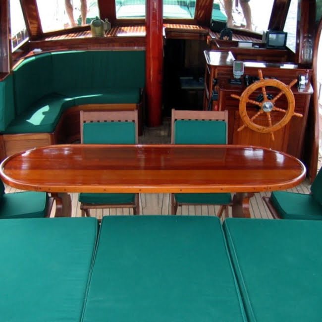 The main deck features a large cushioned seating area, dining table, and dining area.