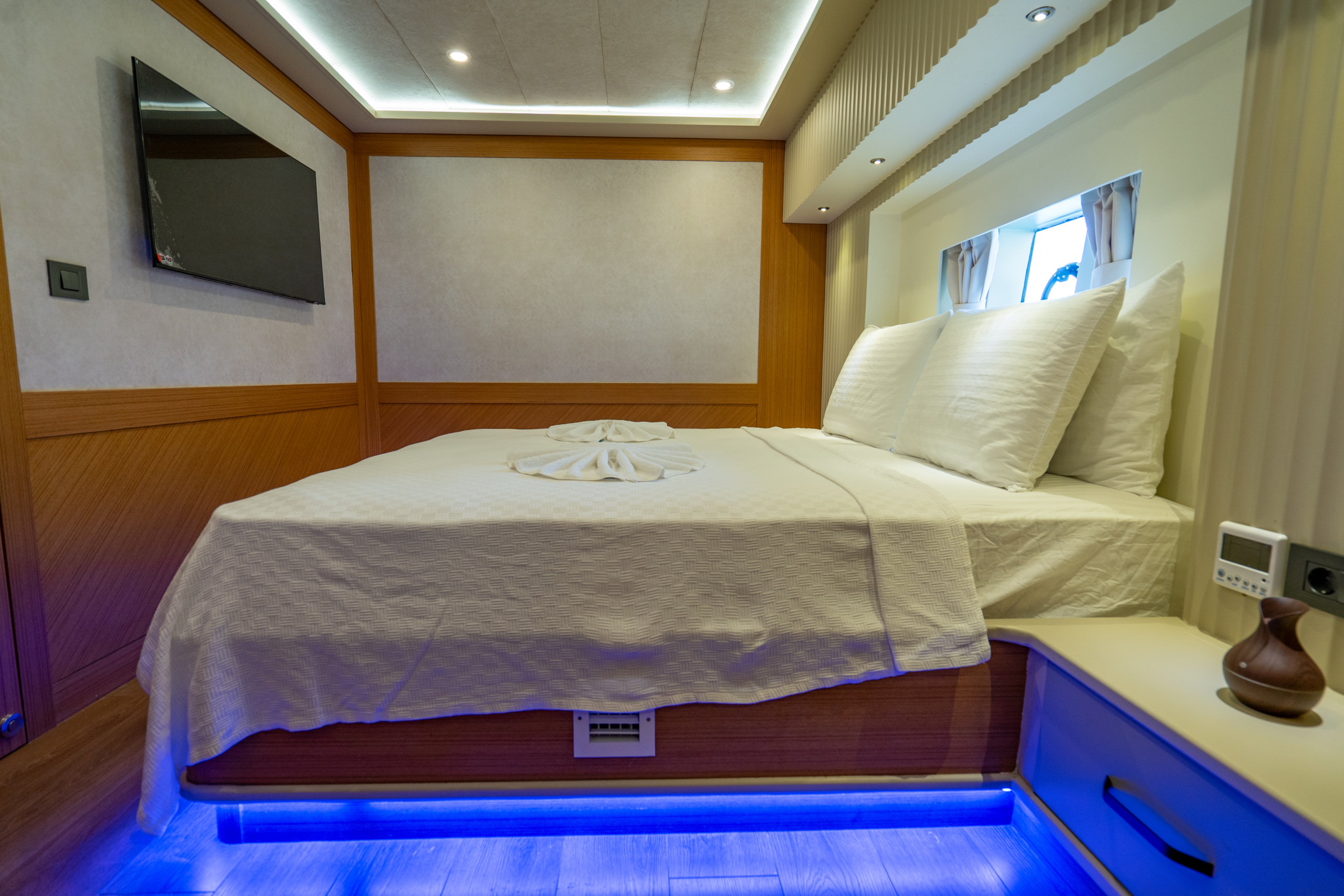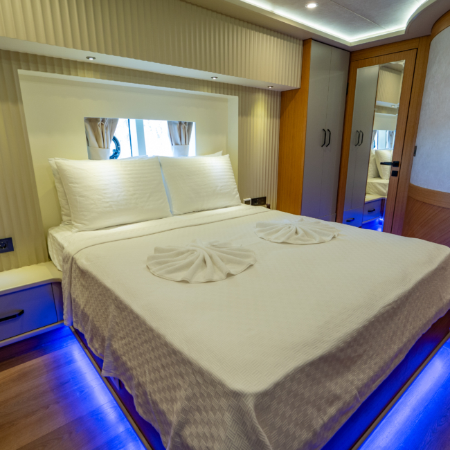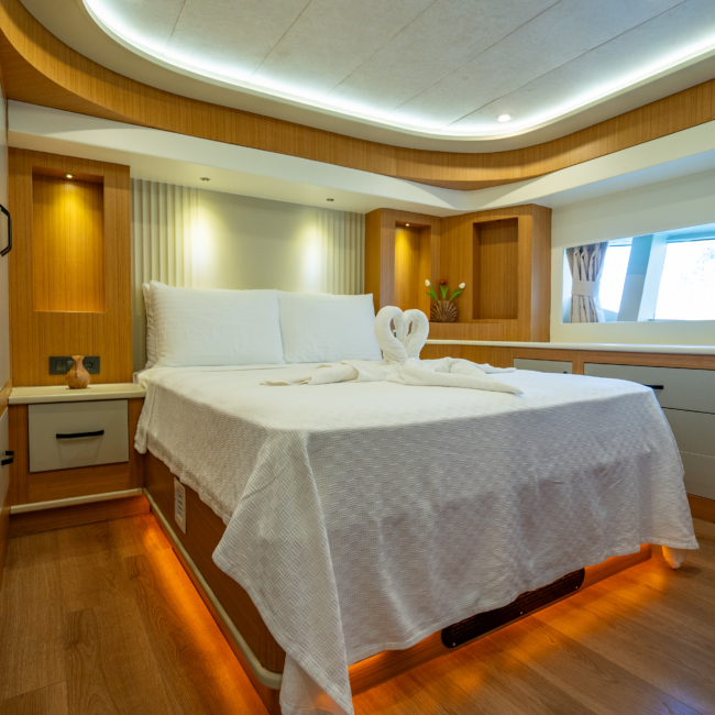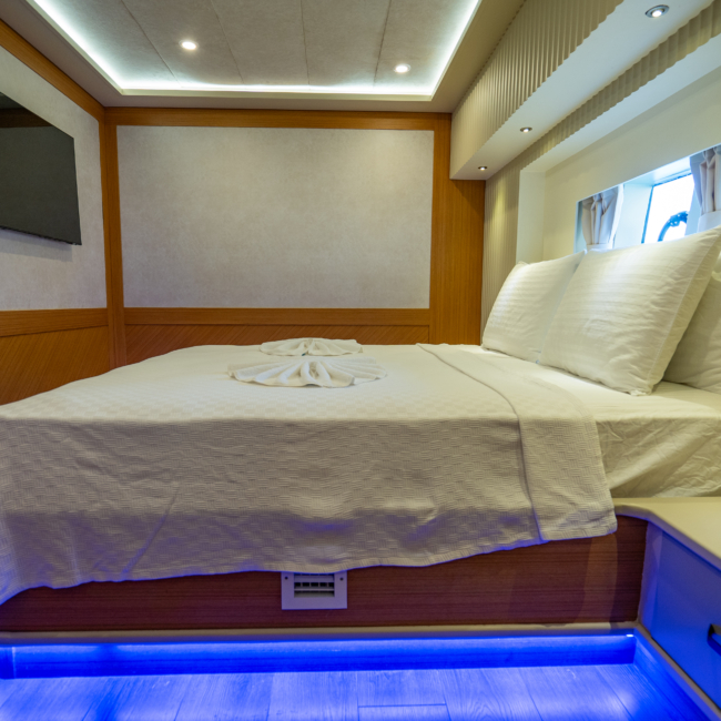 The yacht accommodates up to 6 guests for weekly charters