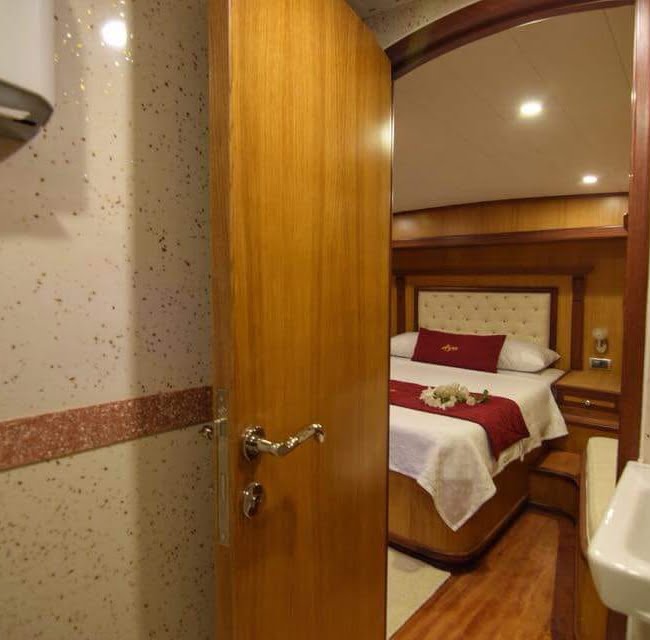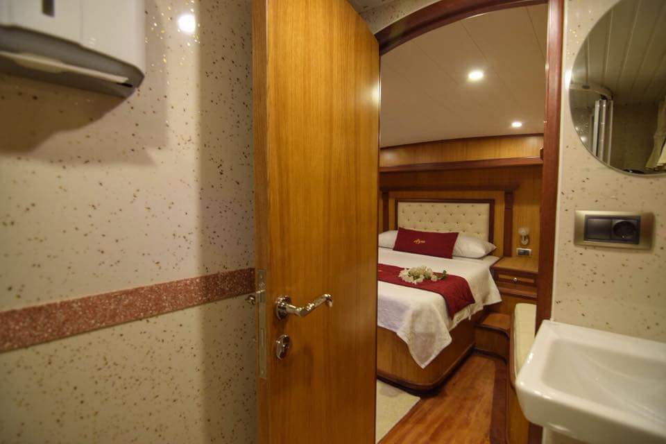 Built in 2018, gulet Ayna is 15 m in length and has 2 cabins, 1 master and 1 double catering for up to 4 guests. Both cabins have private bathrooms and air conditioning. 2 crew are on board to serve you appetising meals prepared in the fully equipped kitchen. Relax with a drink on the comfortable seats on the top deck.