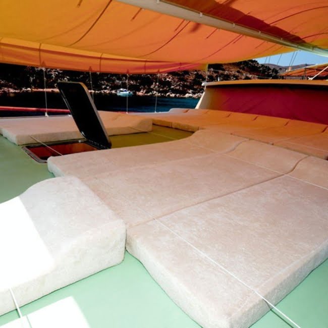 A large cushioned seating area, sunbathing area, and sunbathing cushions are available on the deck in sufficient quantity.