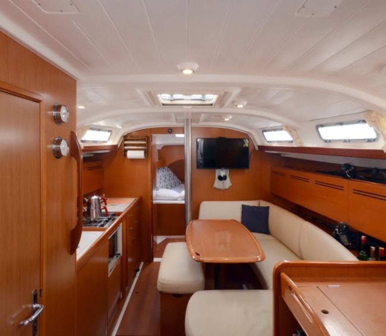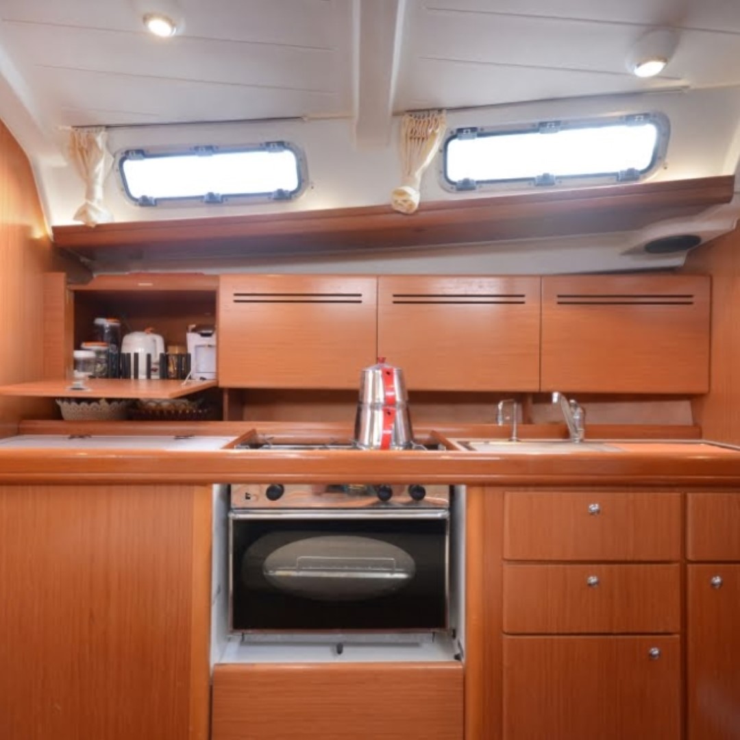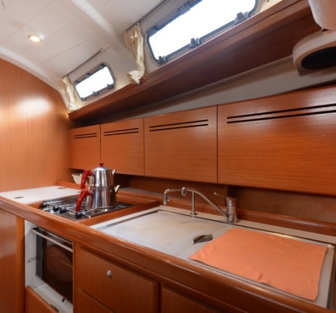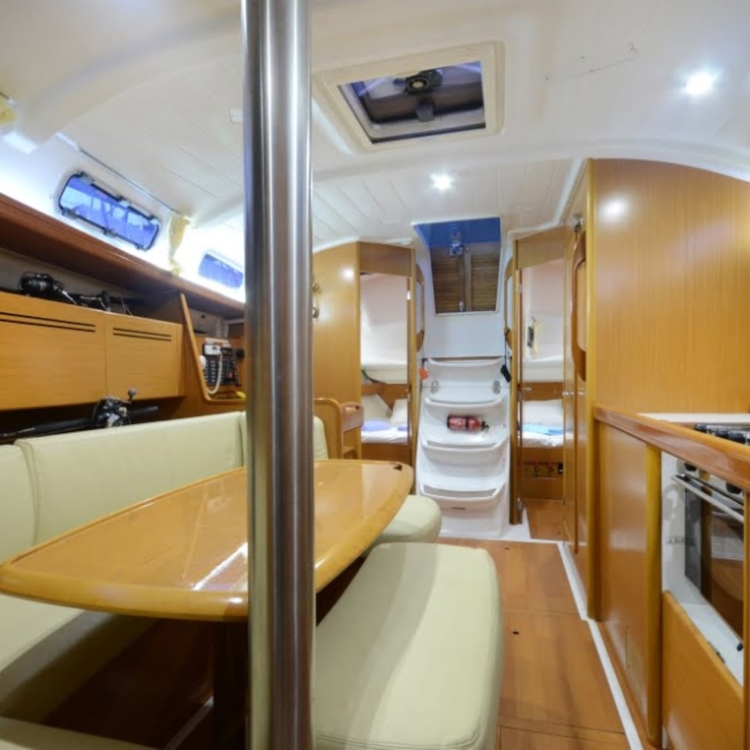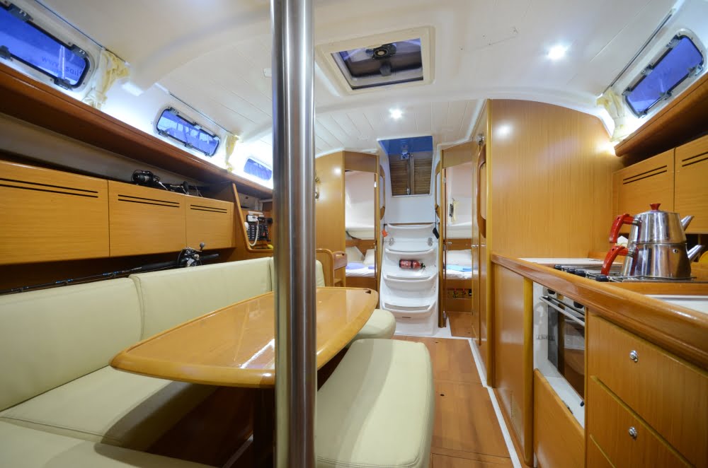 Cyclades 39.3 sailing yacht is available to rent from Fethiye to take you on the adventure of a lifetime. With 3 double cabins, she can host up to 6 guests comfortably. Inside is a comfortable seating area with a galley kitchen and two bathrooms. The sofa converts to provide 2 extra beds in the lounge. Additional features include a shower on deck, a stereo and CD / MP3 player.