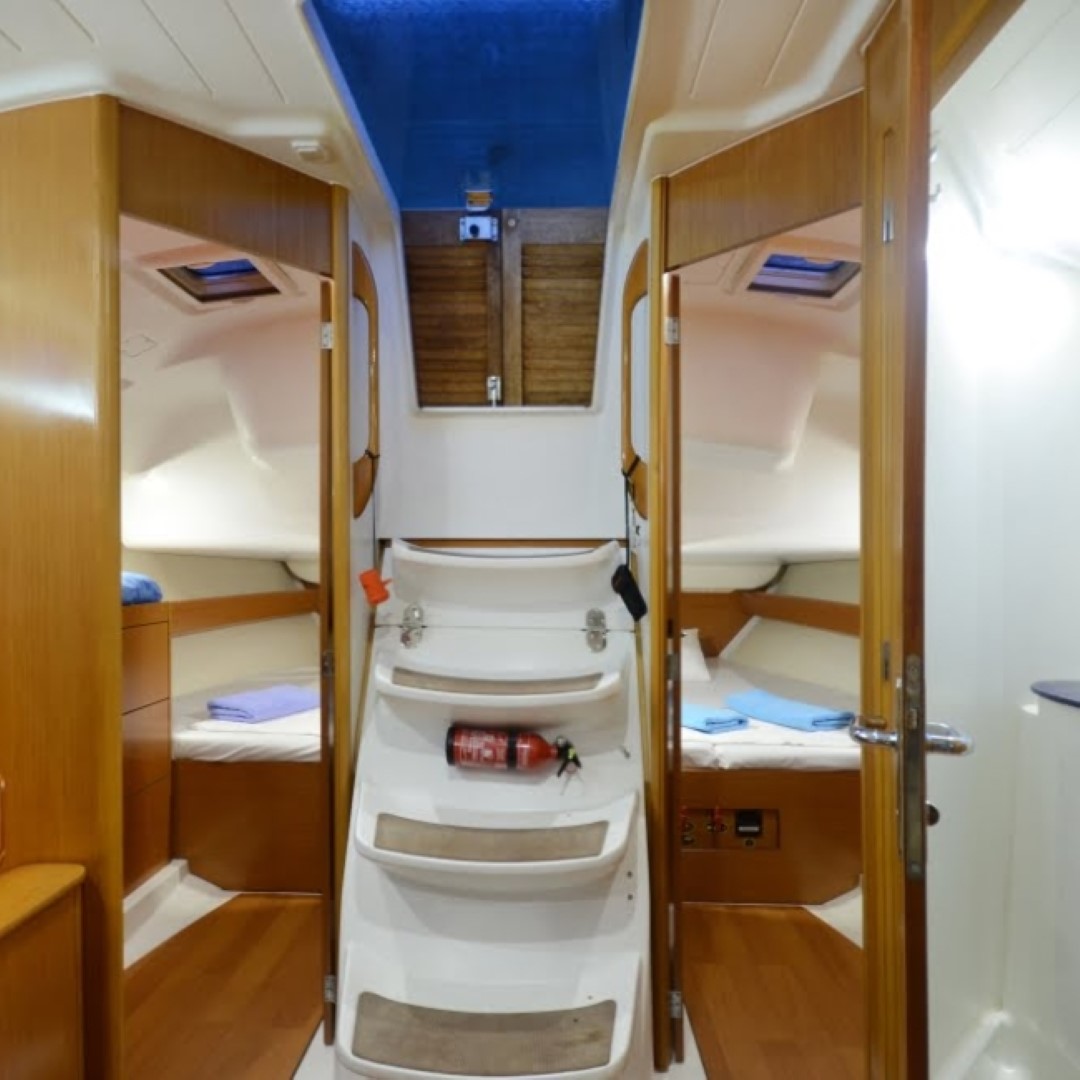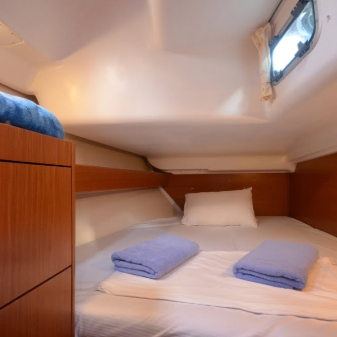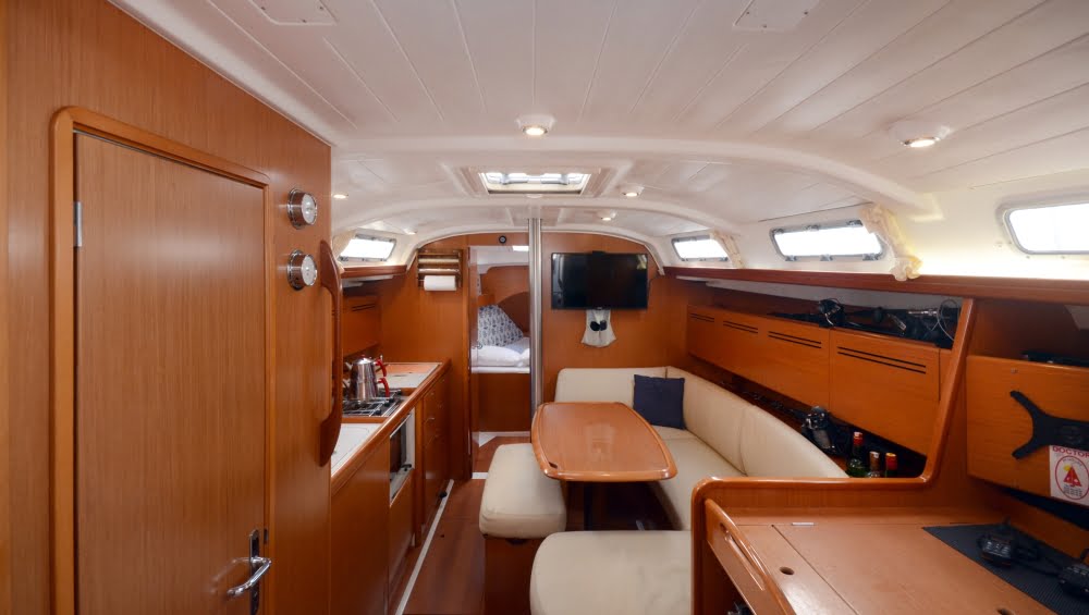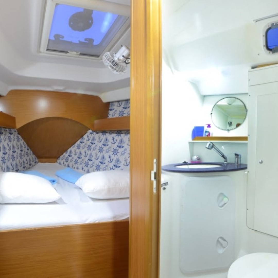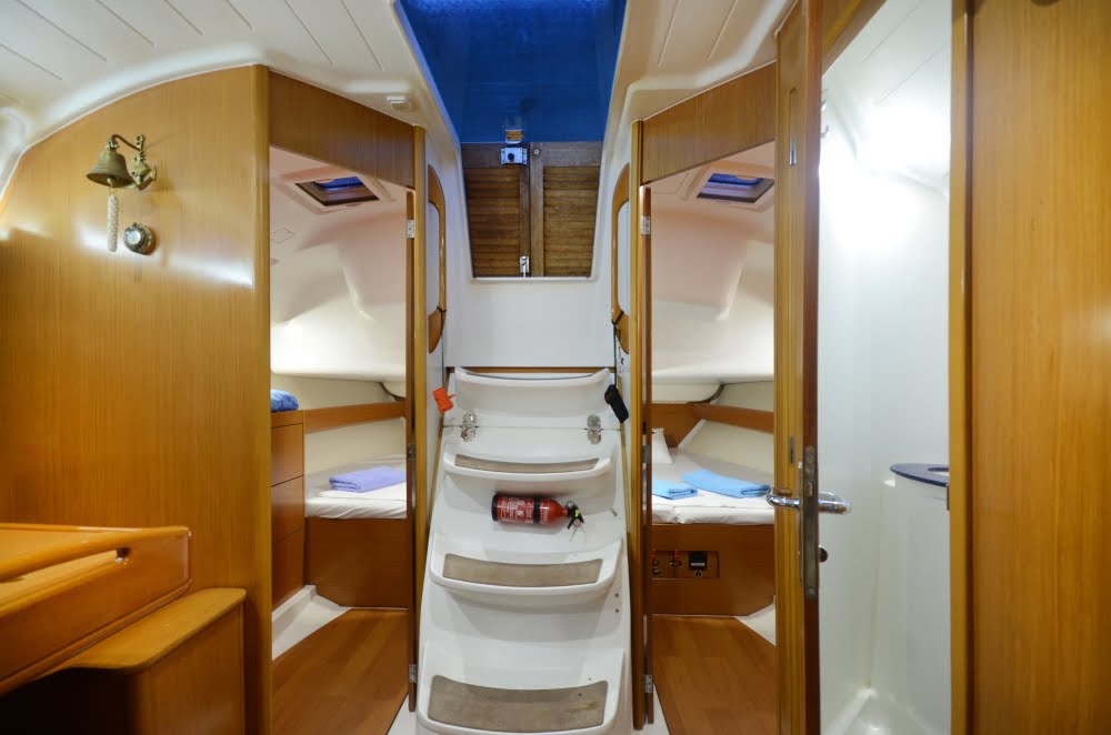 Cyclades 39.3 sailing yacht is available to rent from Fethiye to take you on the adventure of a lifetime. With 3 double cabins, she can host up to 6 guests comfortably. Inside is a comfortable seating area with a galley kitchen and two bathrooms. The sofa converts to provide 2 extra beds in the lounge. Additional features include a shower on deck, a stereo and CD / MP3 player.