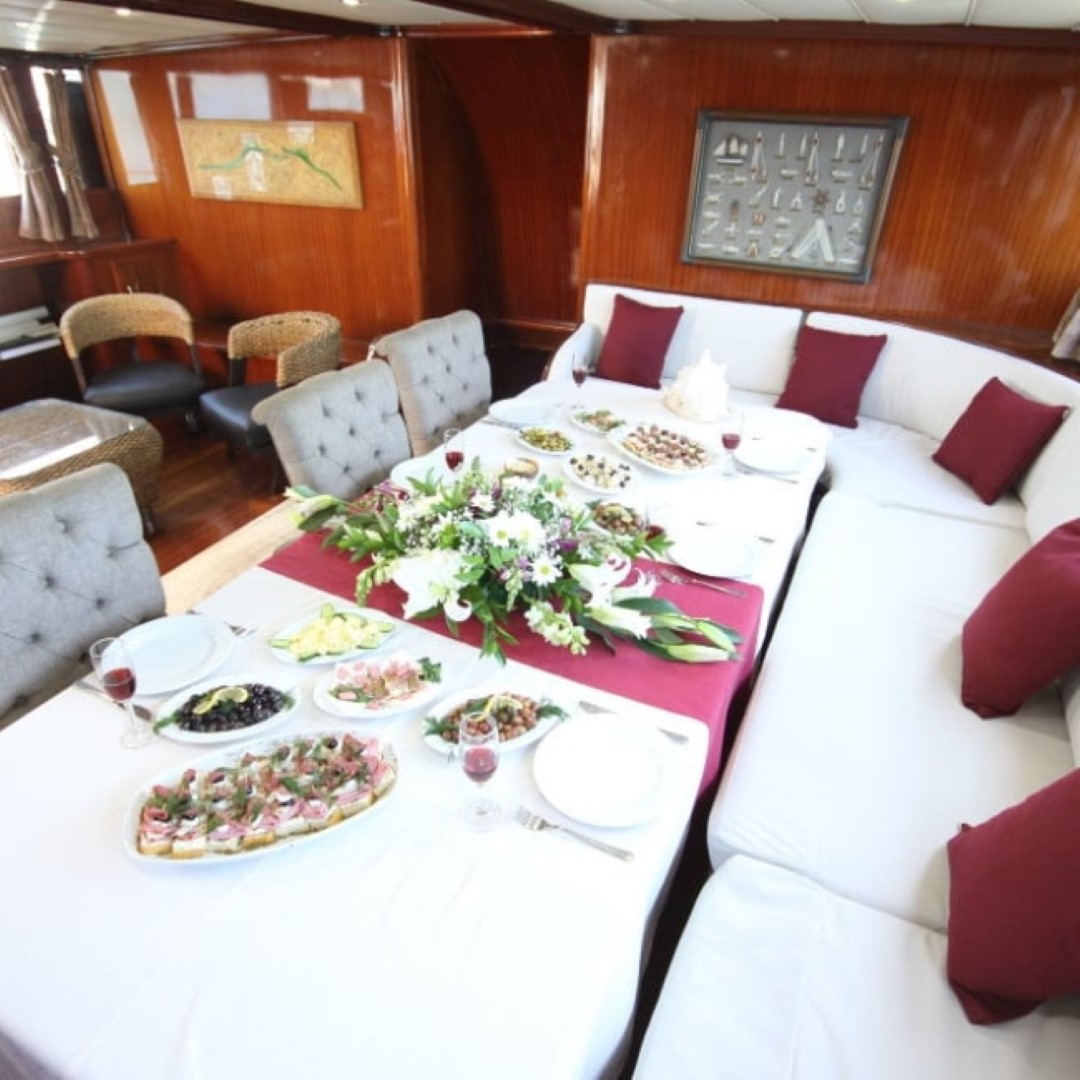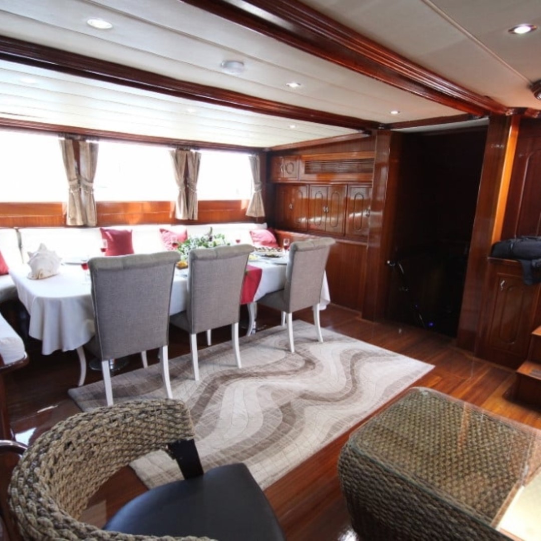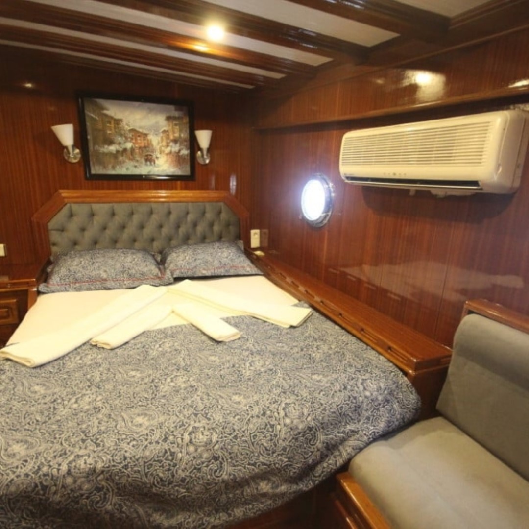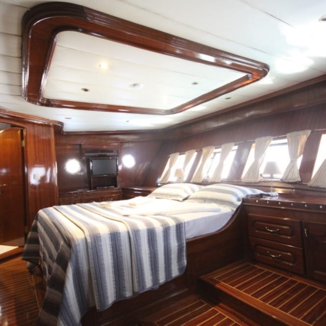 She has been designed to serve groups of up to 12 people in her 1 masters, 4 doubles and 1 twin cabins, each with 24-hour air conditioning
