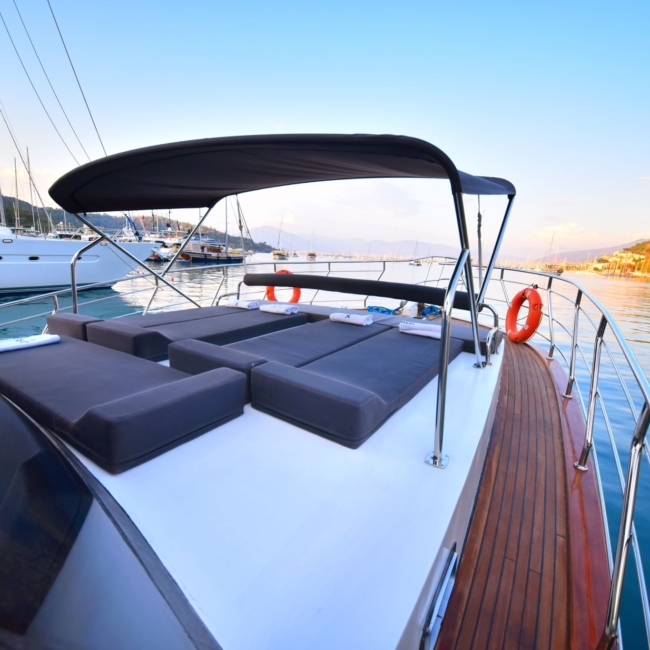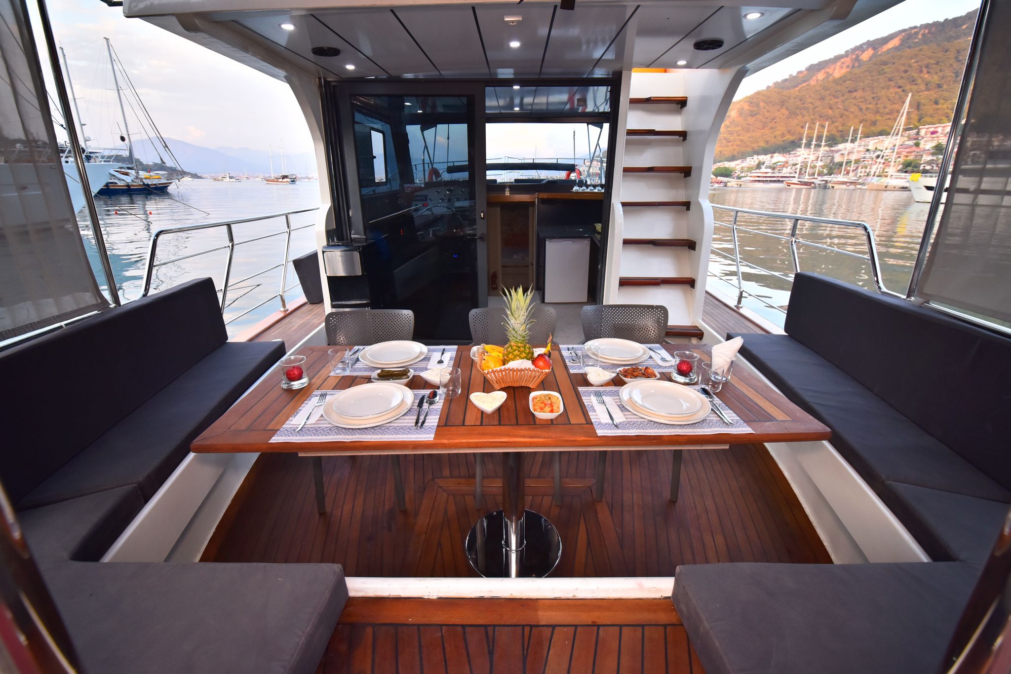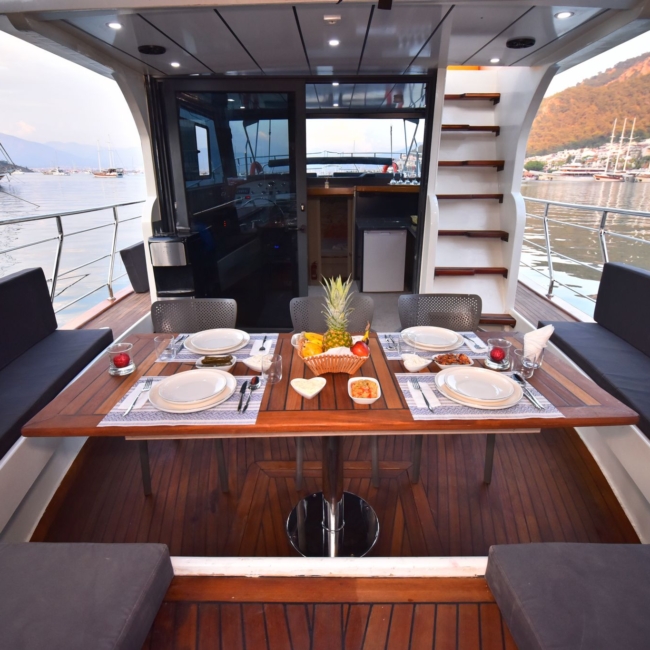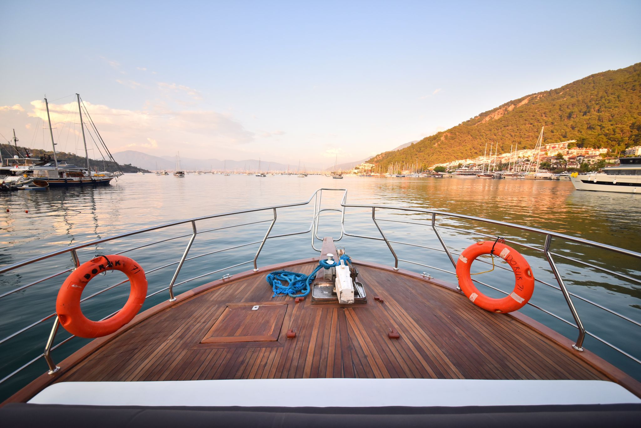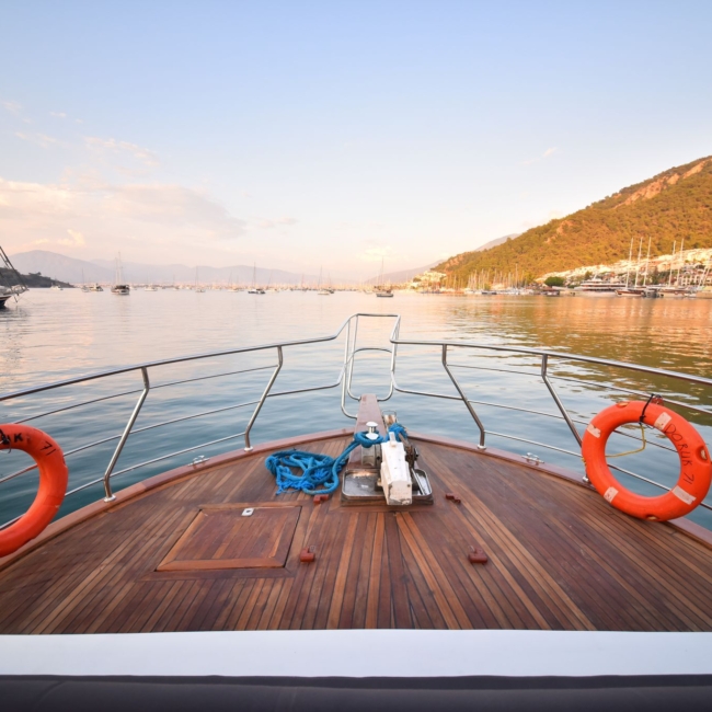 An experienced two-person crew (captain and chef) accompanies guests on unforgettable blue cruises along the Fethiye–Göcek islands route.