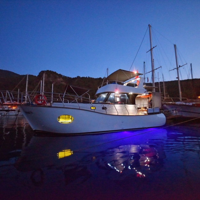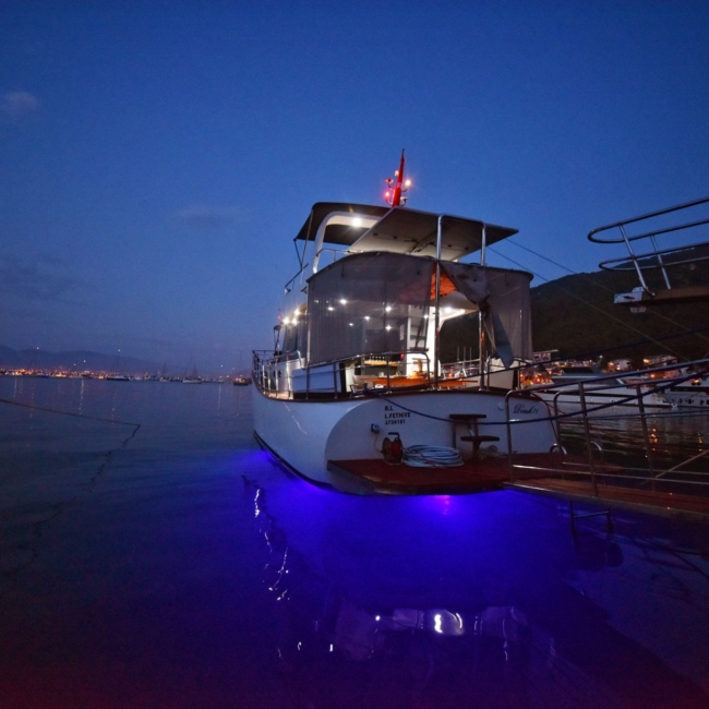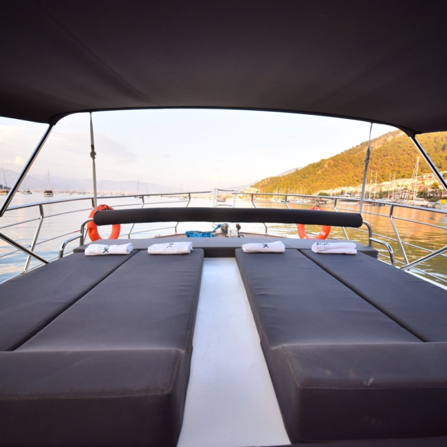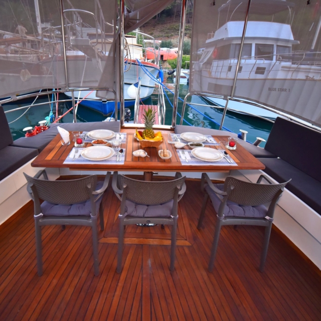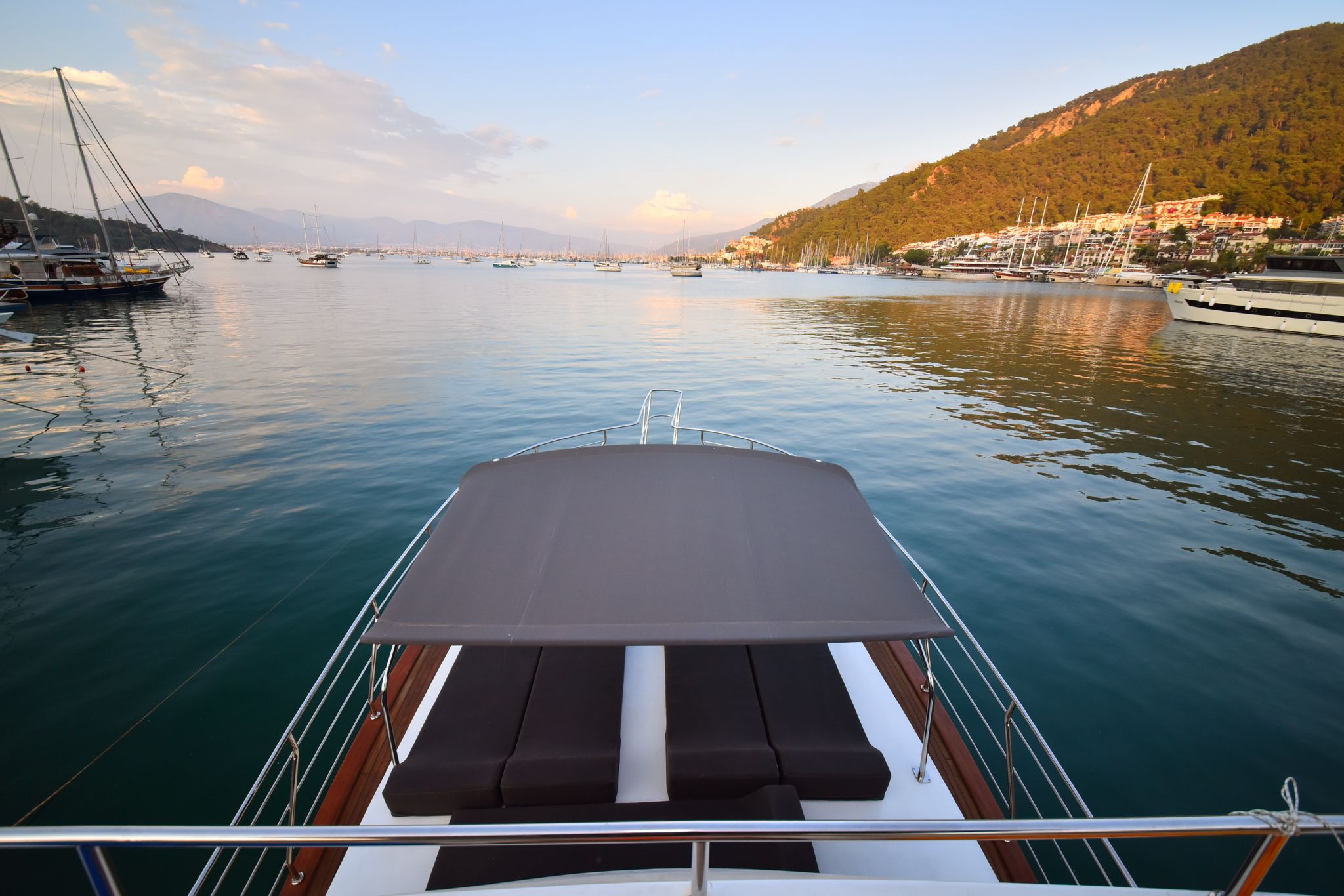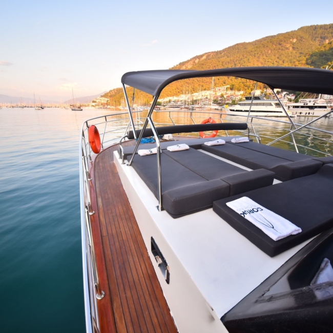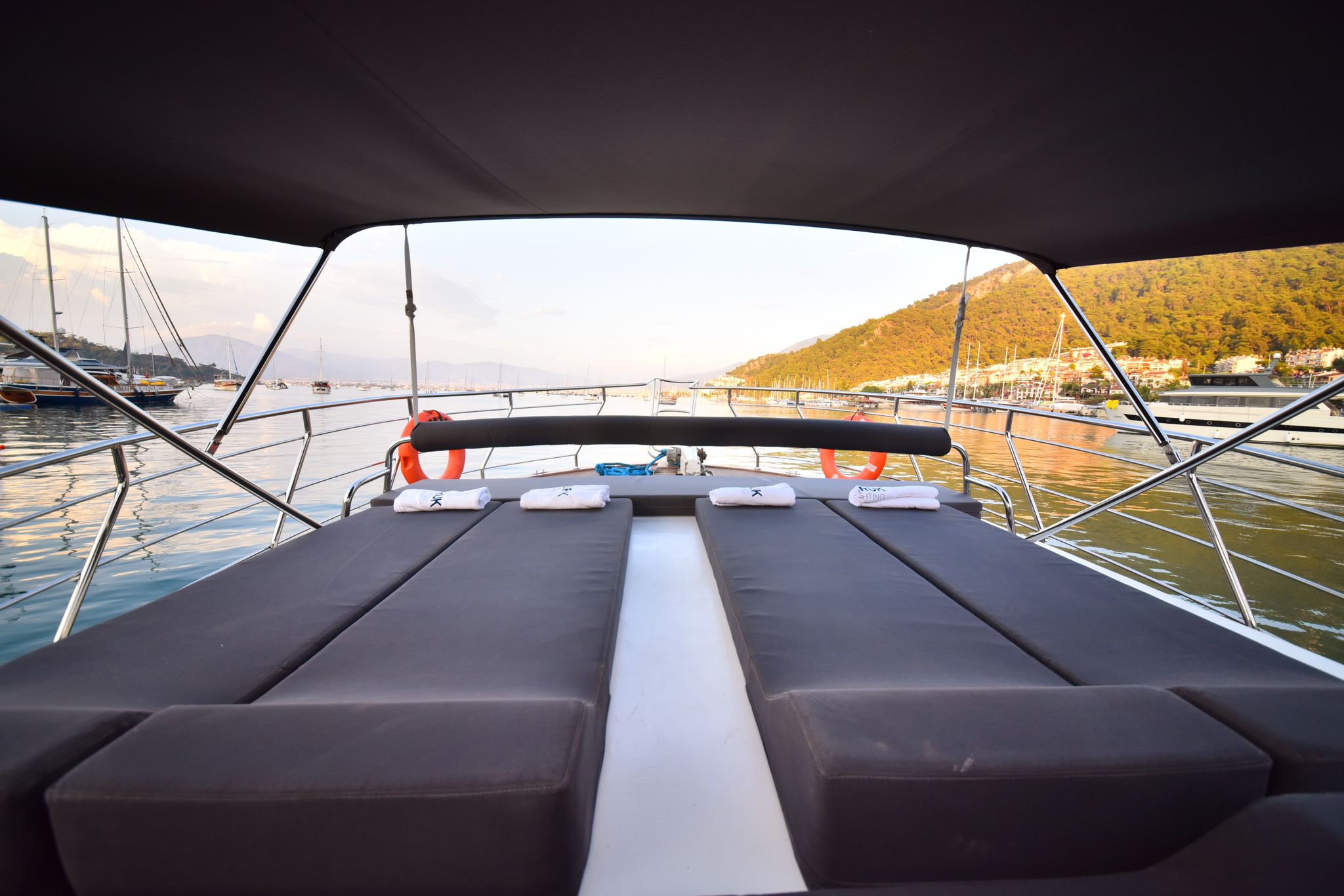 An experienced two-person crew (captain and chef) accompanies guests on unforgettable blue cruises along the Fethiye–Göcek islands route.