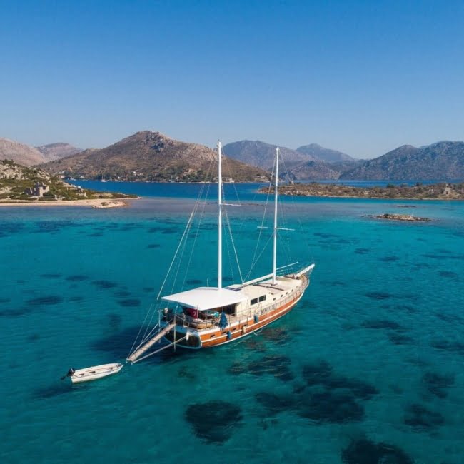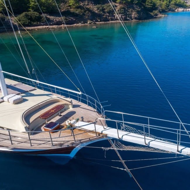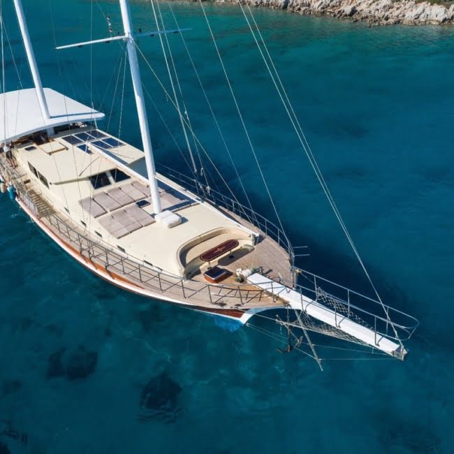 Emre Bey is an elegantly designed wooden gulet built in 2002. She is 26 meters in length and has 6 double cabins catering for up to 12 guests comfortably. All cabins are en-suite and air-conditioned. The kitchen is fully equipped and our chef will prepare delicious meals for you. Enjoy the sea and the sun with the sunbathing areas on the deck, snorkeling and fishing equipment.