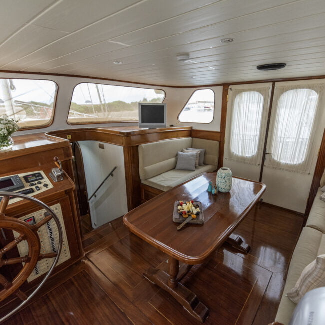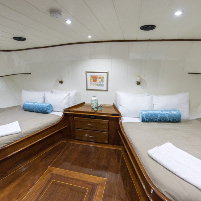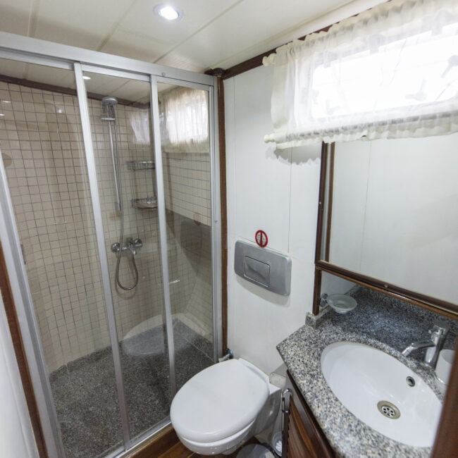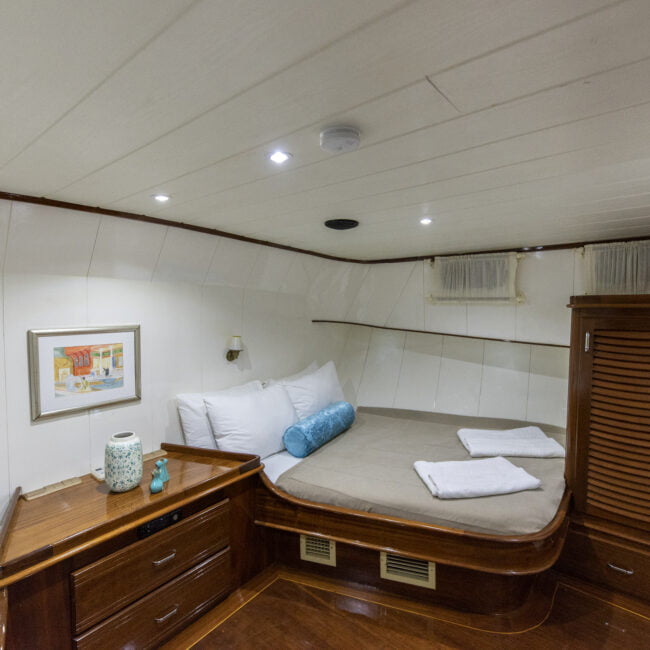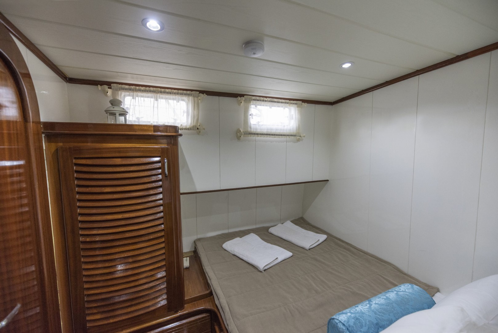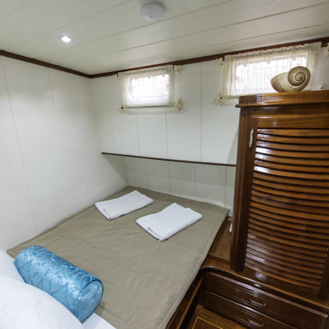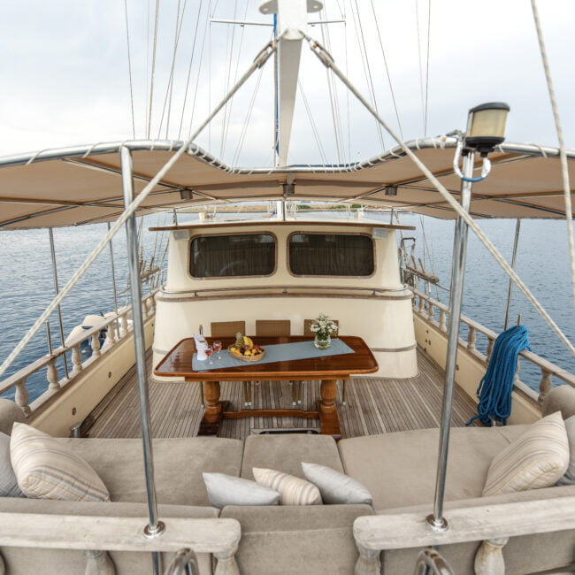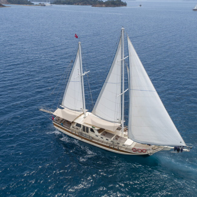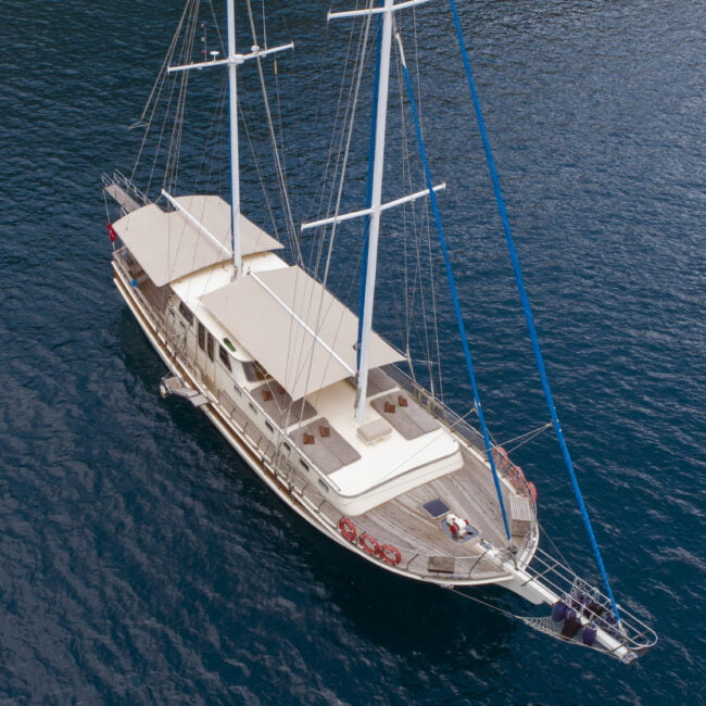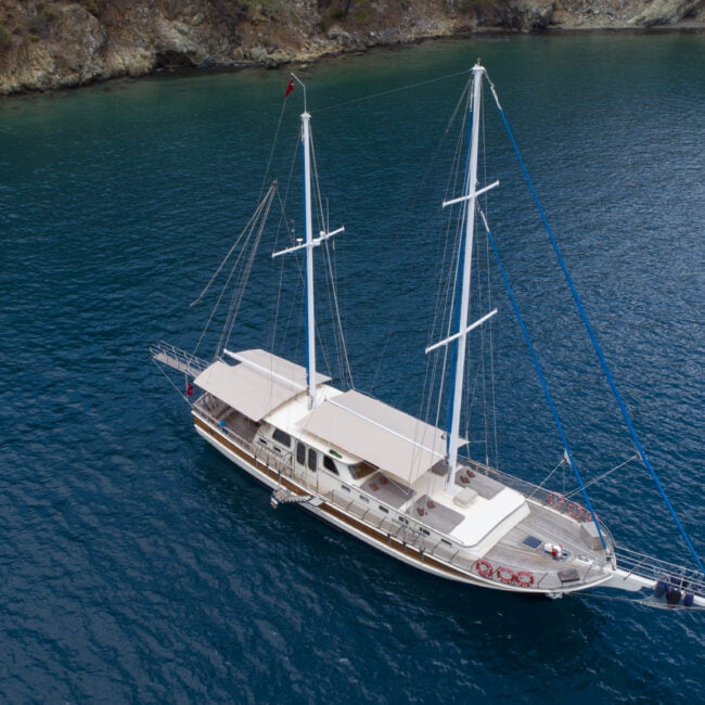 Welcoming up to 6 guests, Faralya is a 20 metre gulet, built in 2008 she is spacious and charming. Faralya has 1 master and 2 double cabins, each air-conditioned and en-suite. Relax and sail into paradise on board this beauty! Like at home, there will be times you just want to laze around, you can do just this in Faralya’s beautiful lounge which is facilitated with a music system, TV and DVD. There is also a fully equipped kitchen and bar. Want to explore the sea more? On board, there is full access to canoe, fishing and snorkeling equipment.