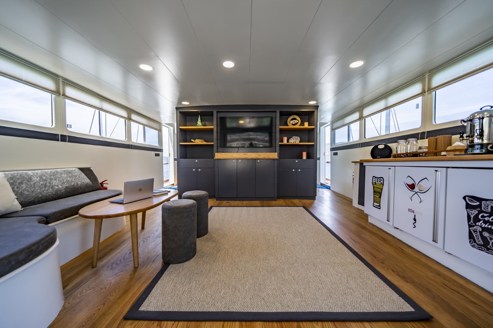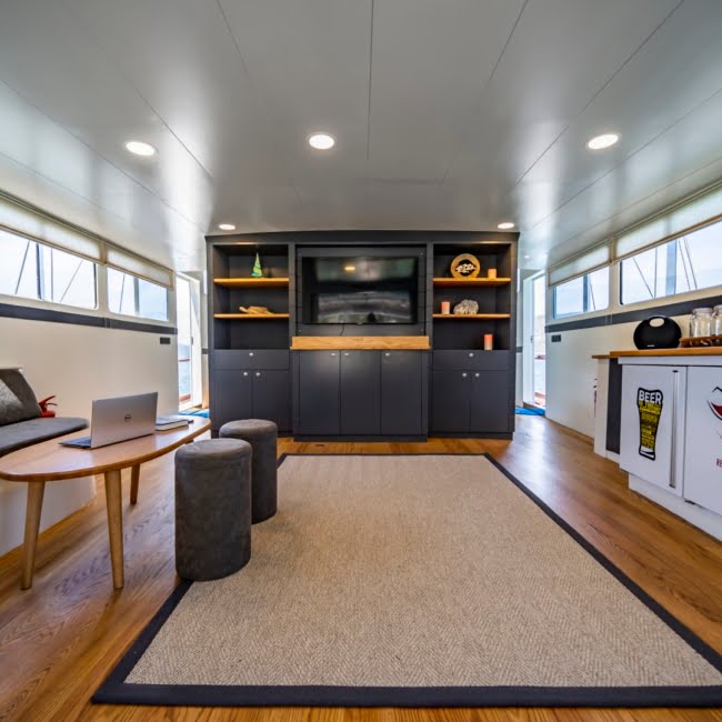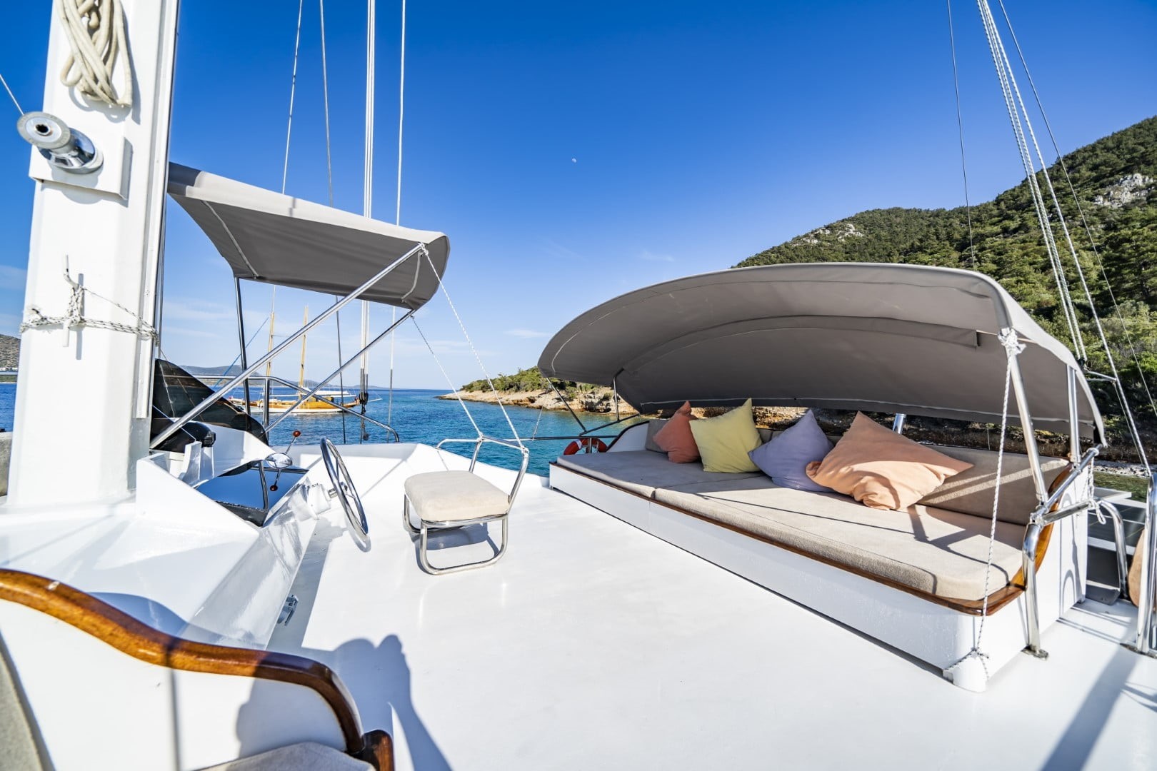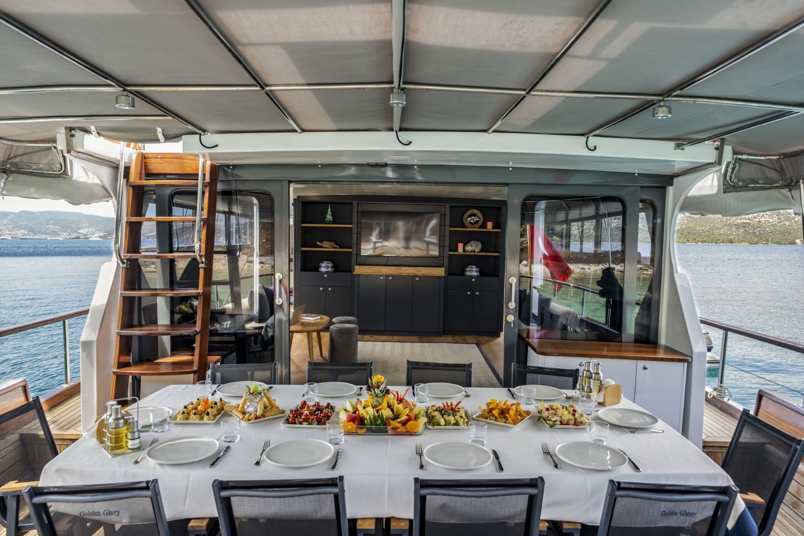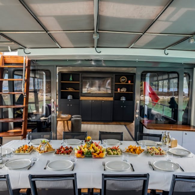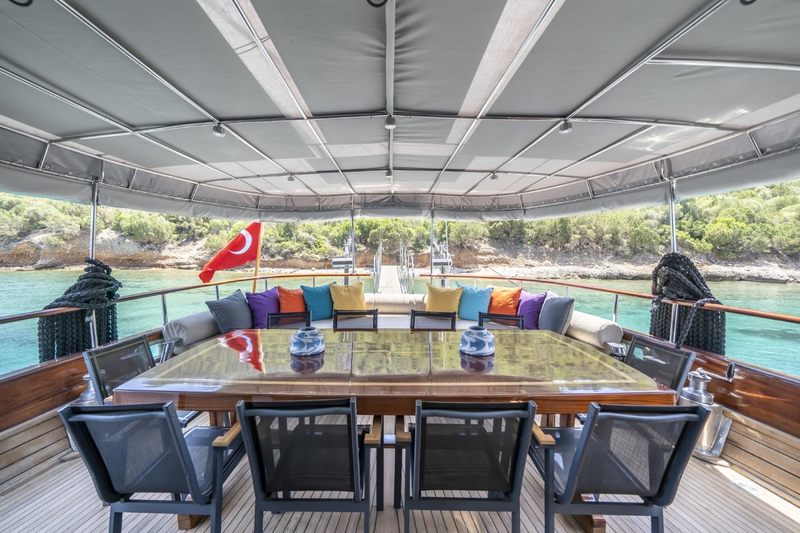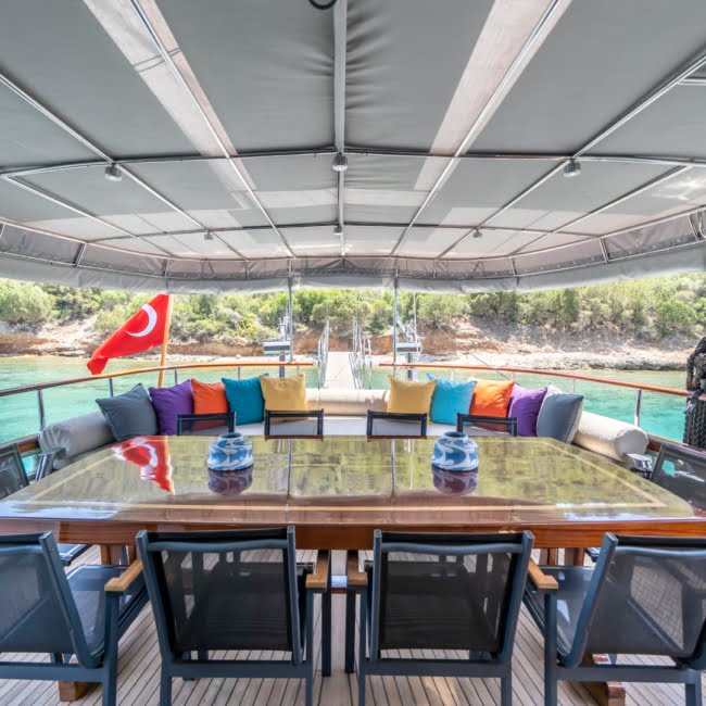 On the back deck there is a large cushioned reclining area and a dining table where you can enjoy the delicious food cooked by our chef.