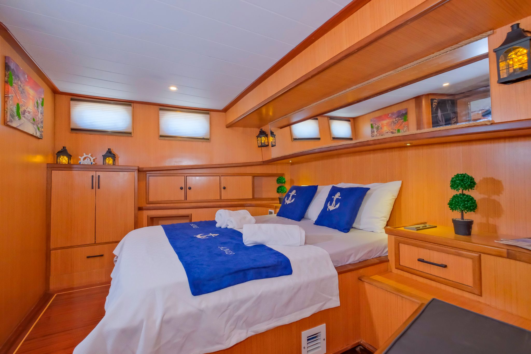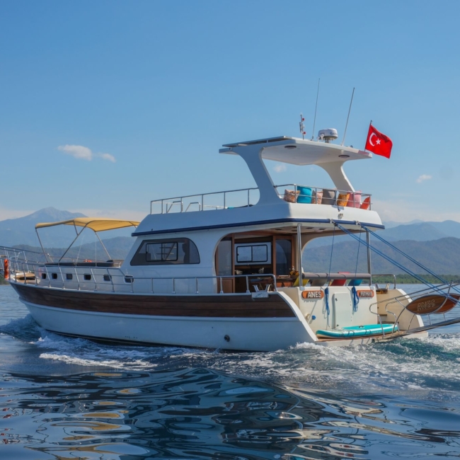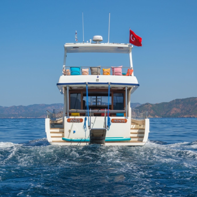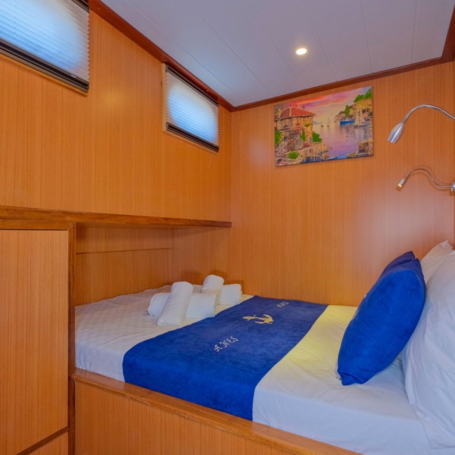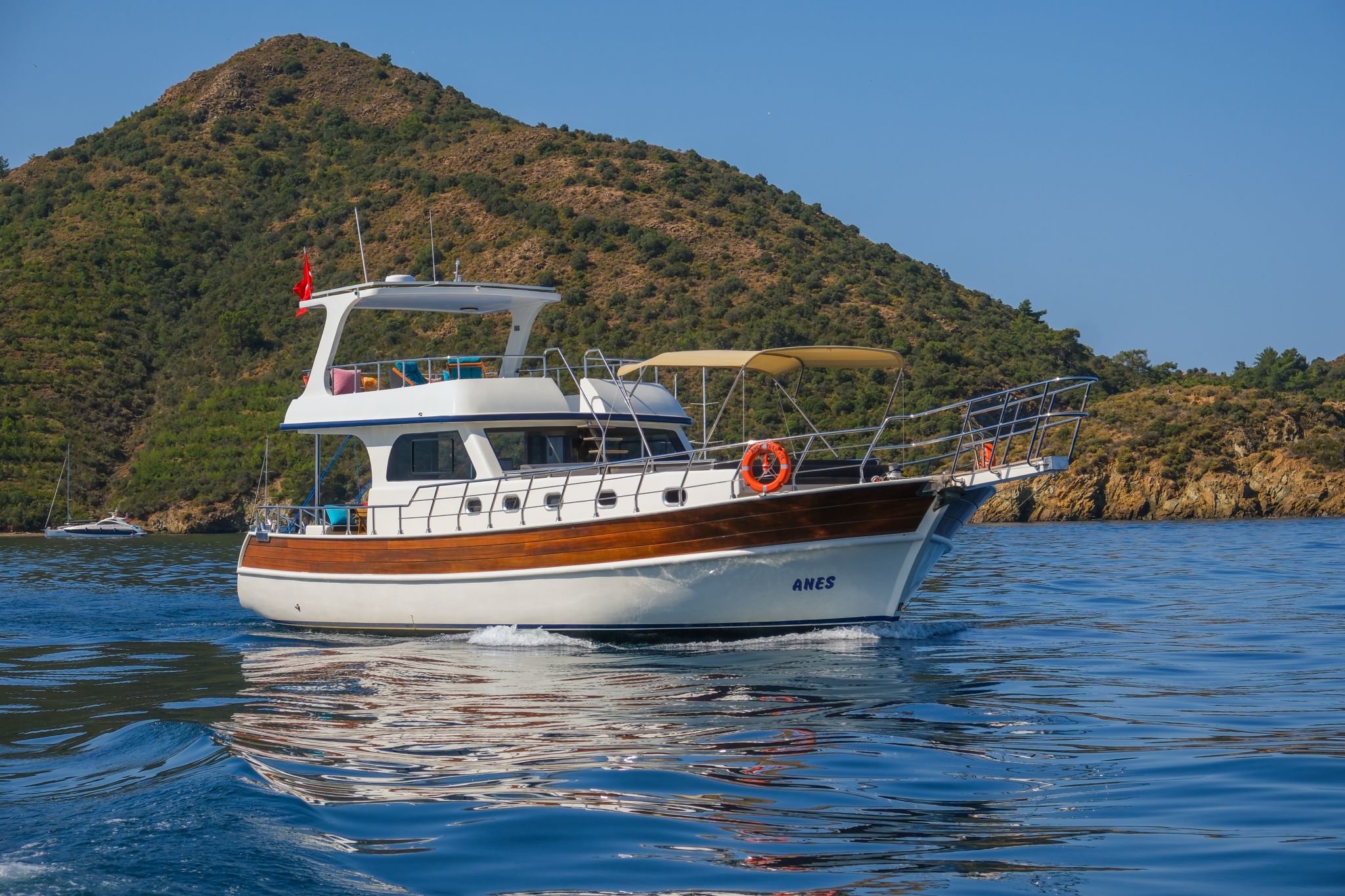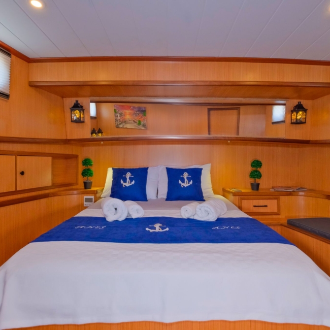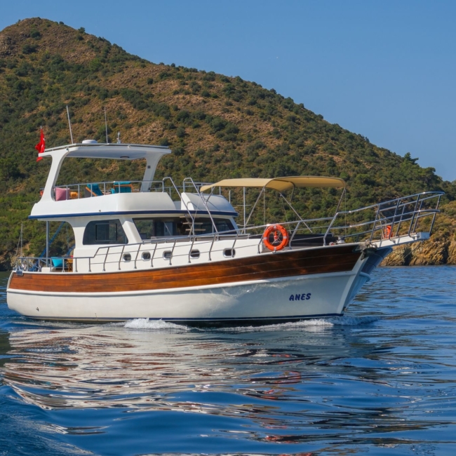 Anes Gulet is a 16-meter traditional wooden yacht offering accommodation for up to 6 guests in 3 cabins, including 1 master and 2 double cabins. Each cabin is equipped with a private bathroom and air conditioning. The yacht is operated by a crew of two: a captain and a cook. Ideal for short blue cruises around Fethiye and Göcek, the gulet features essential water toys, a generator, and kitchen equipment. It is a suitable choice for small groups seeking a peaceful holiday in quiet bays.