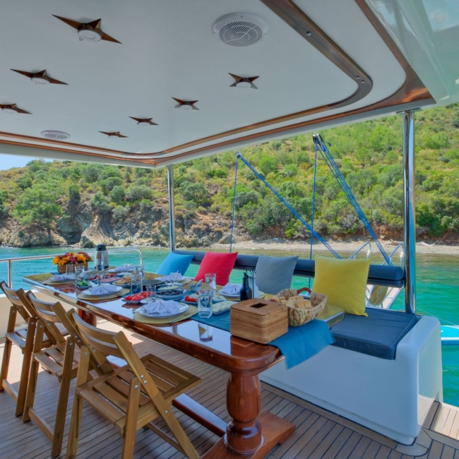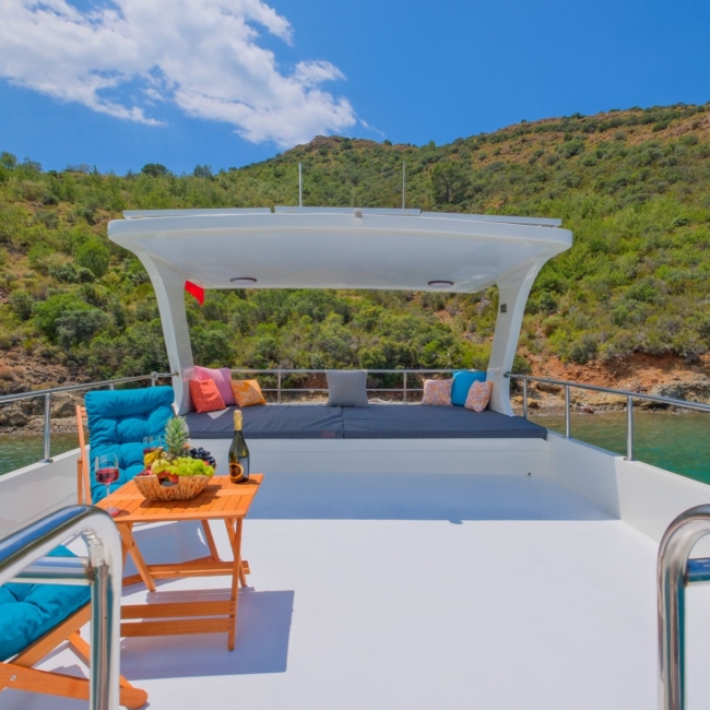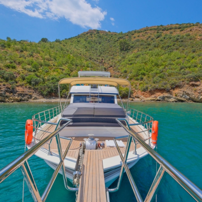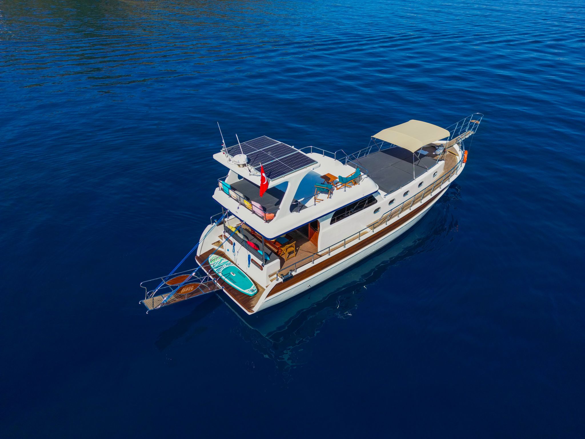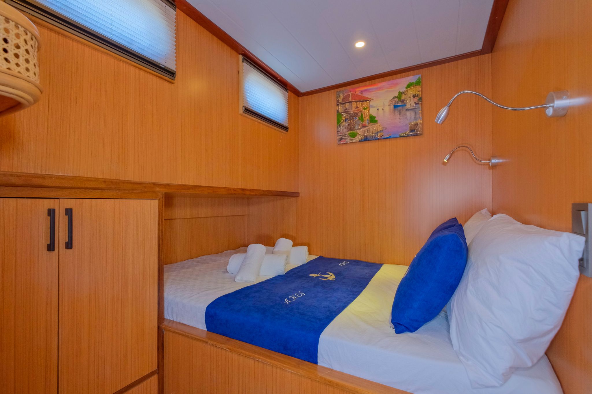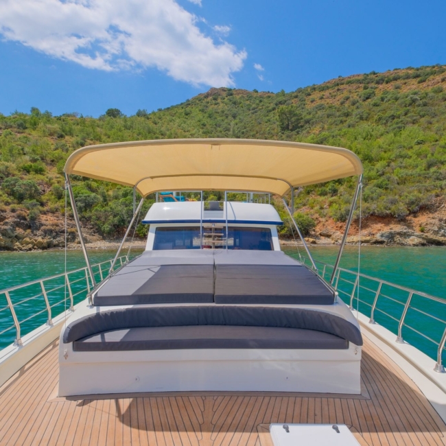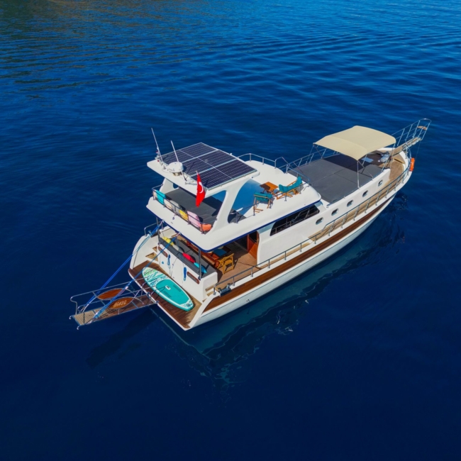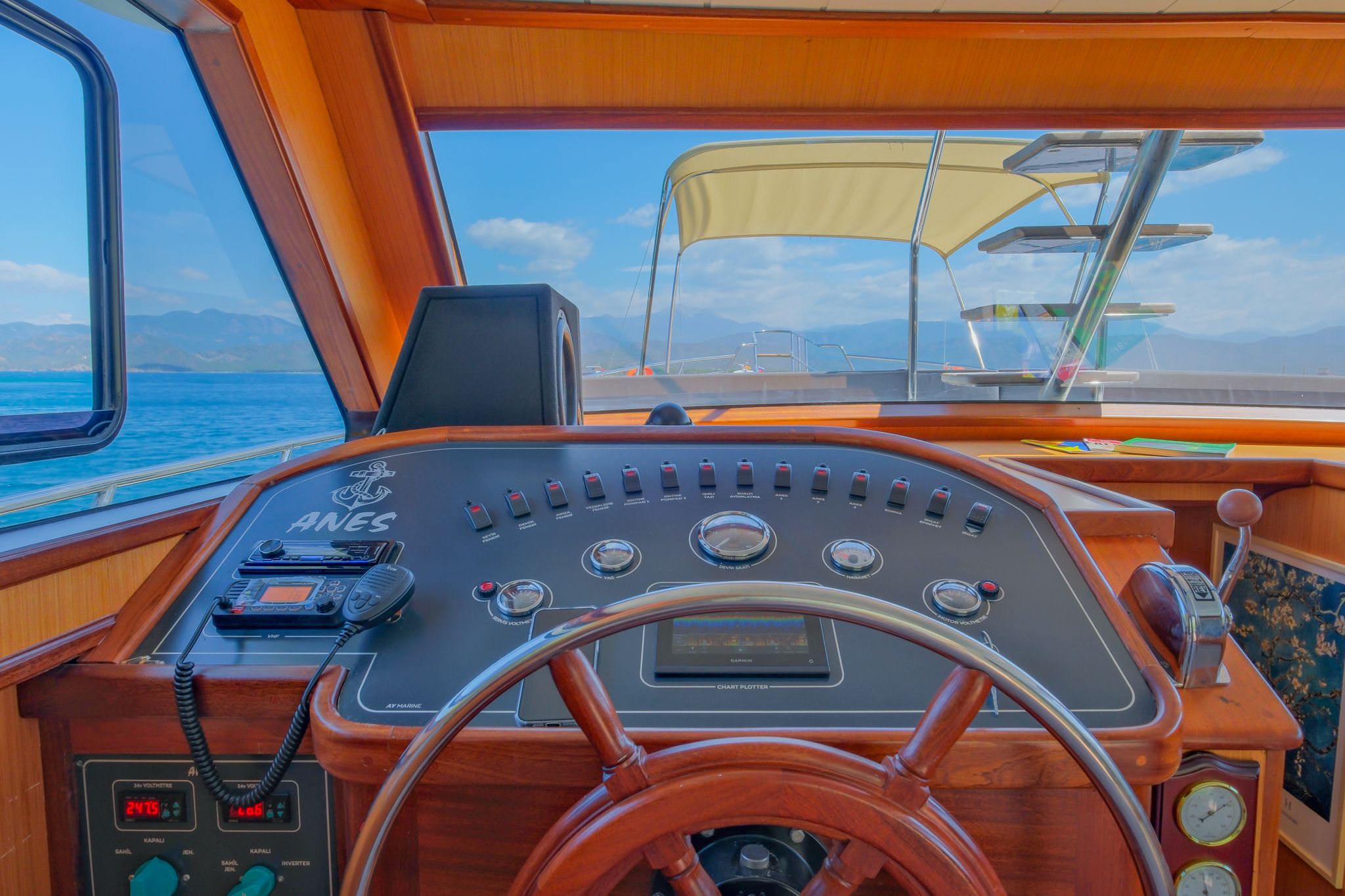 Anes Gulet is a 16-meter traditional wooden yacht offering accommodation for up to 6 guests in 3 cabins, including 1 master and 2 double cabins. Each cabin is equipped with a private bathroom and air conditioning. The yacht is operated by a crew of two: a captain and a cook. Ideal for short blue cruises around Fethiye and Göcek, the gulet features essential water toys, a generator, and kitchen equipment. It is a suitable choice for small groups seeking a peaceful holiday in quiet bays.