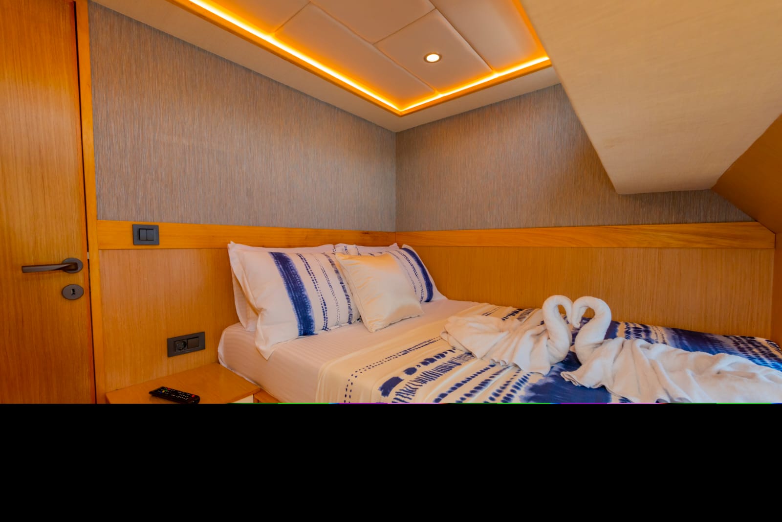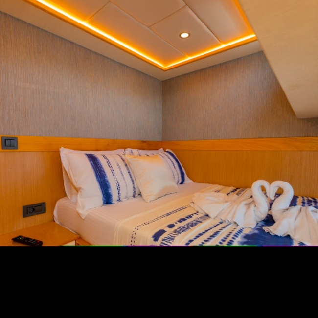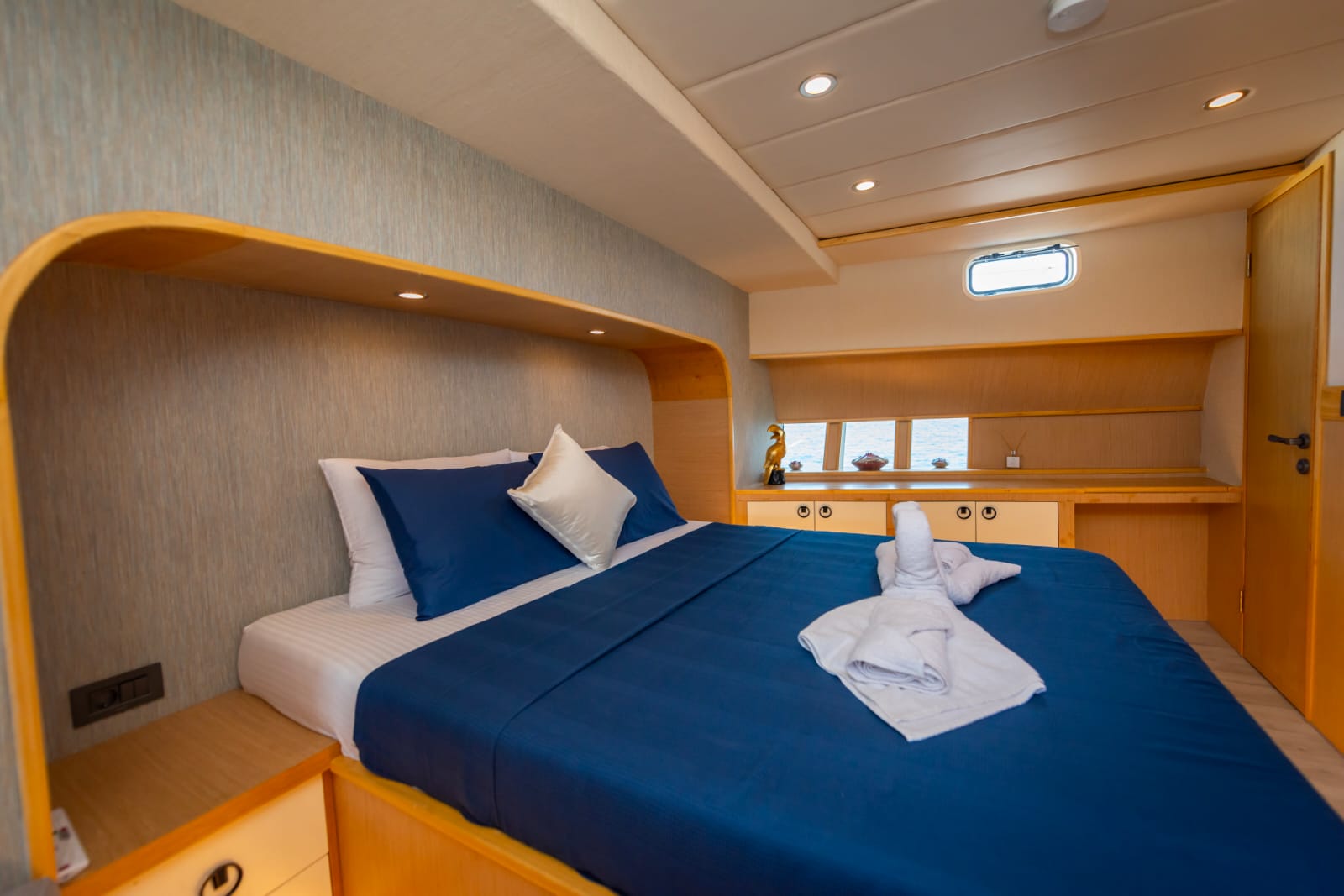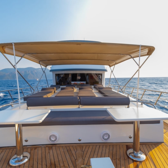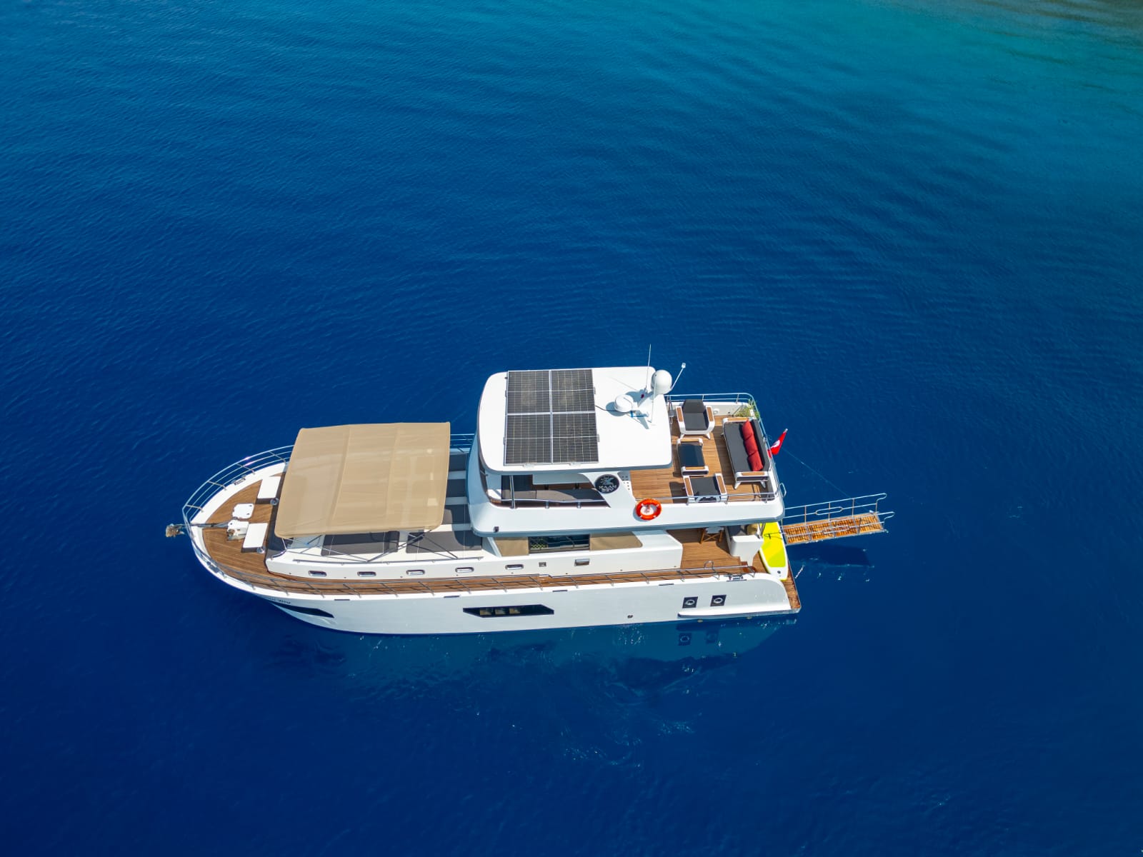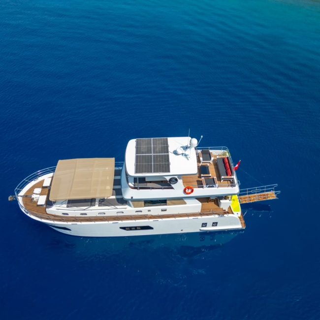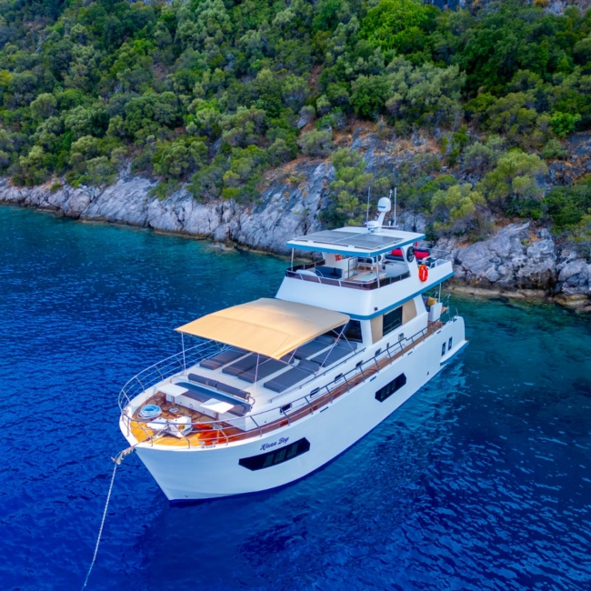 Our 3-cabin luxury trawler, which was completed in 2024, departs from Göcek port and serves you, blue cruise lovers, in Fethiye and Göcek bays. Kaan beyTrawler / Motoryacht has a length of 18 meters and a width of 5.3 meters.