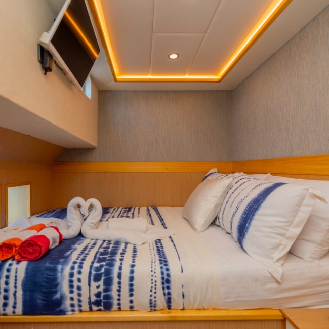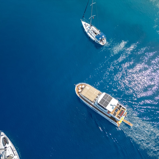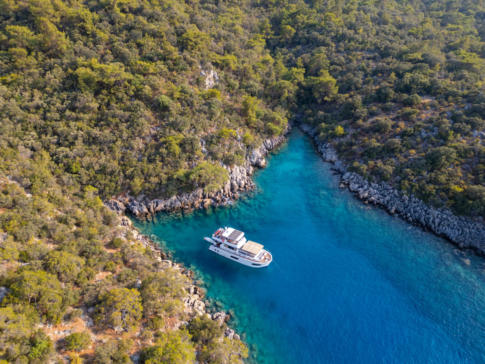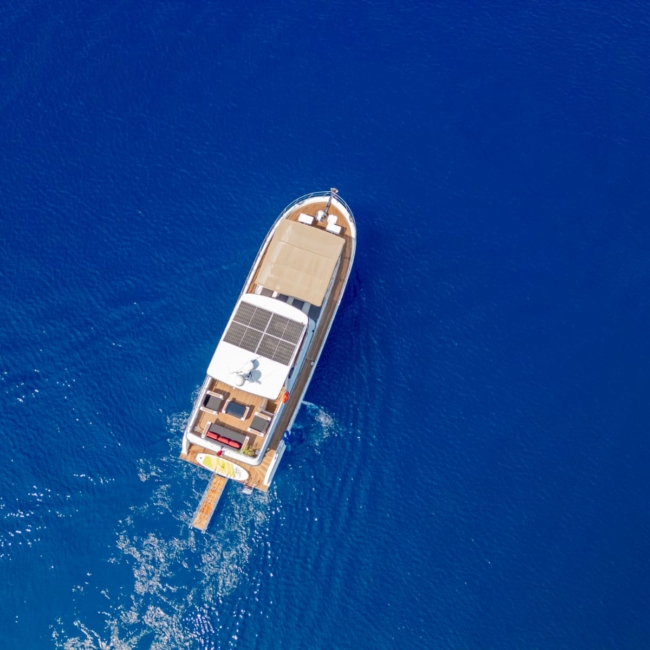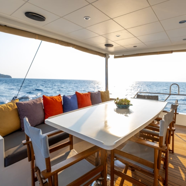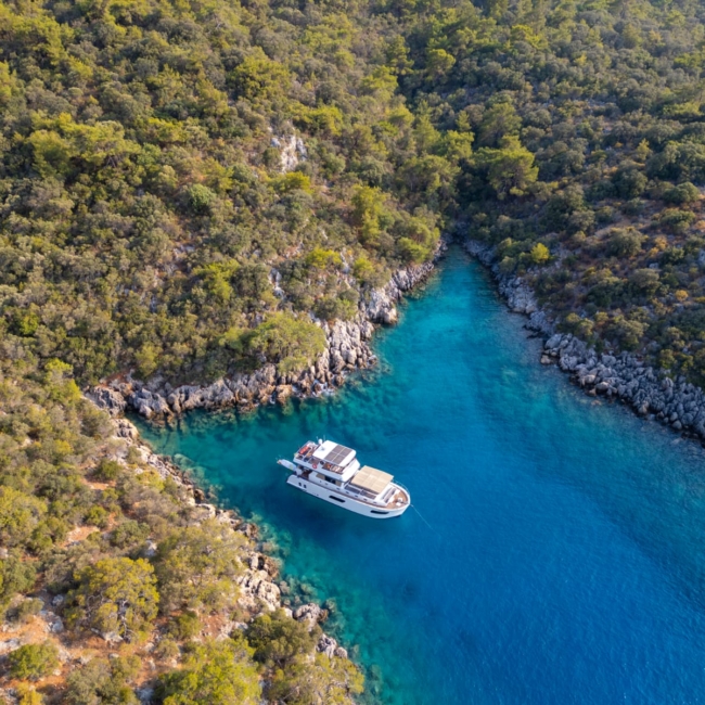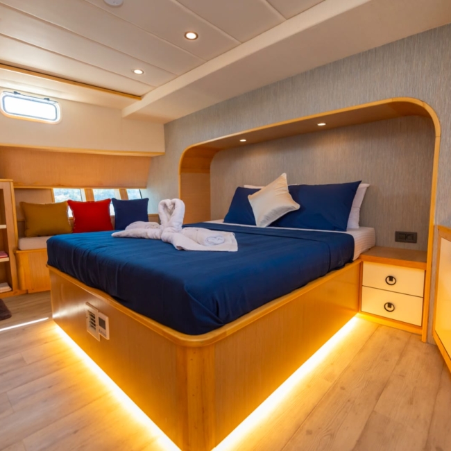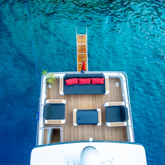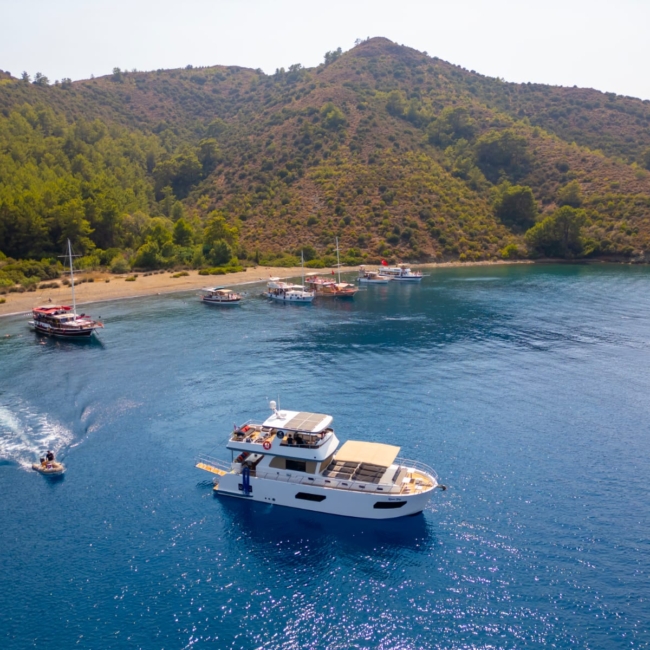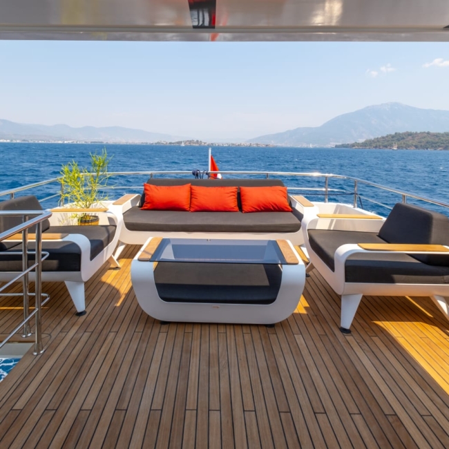 Our 3-cabin luxury trawler, which was completed in 2024, departs from Göcek port and serves you, blue cruise lovers, in Fethiye and Göcek bays. Kaan beyTrawler / Motoryacht has a length of 18 meters and a width of 5.3 meters.