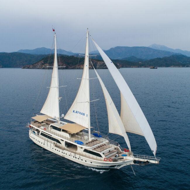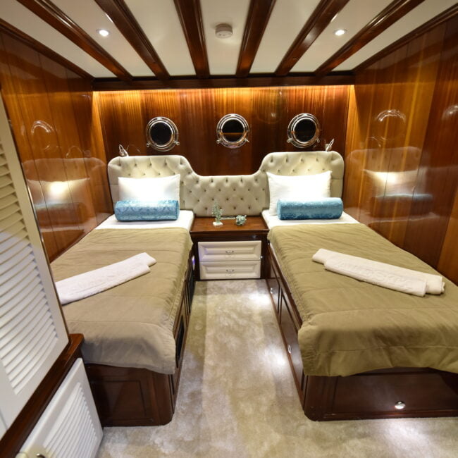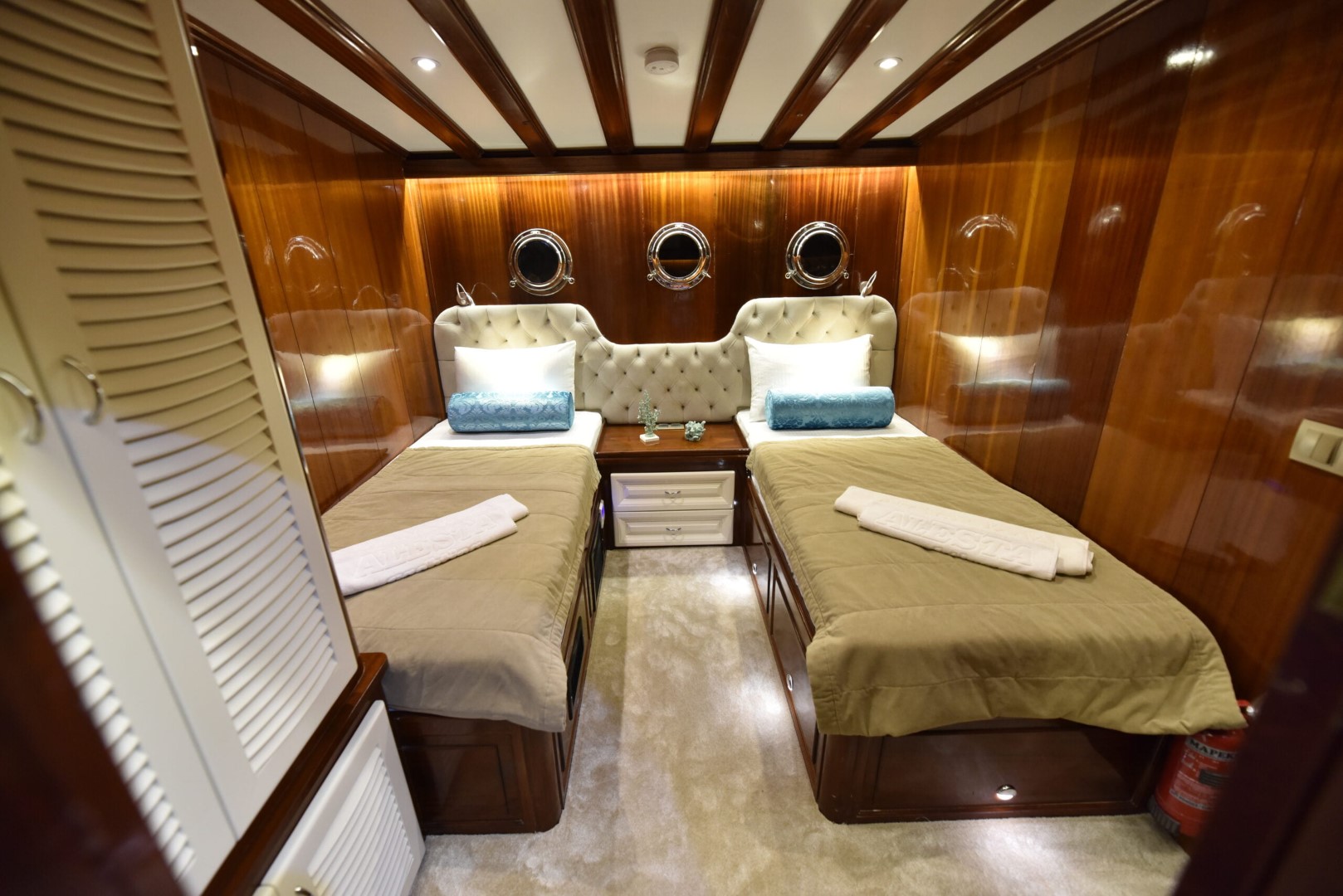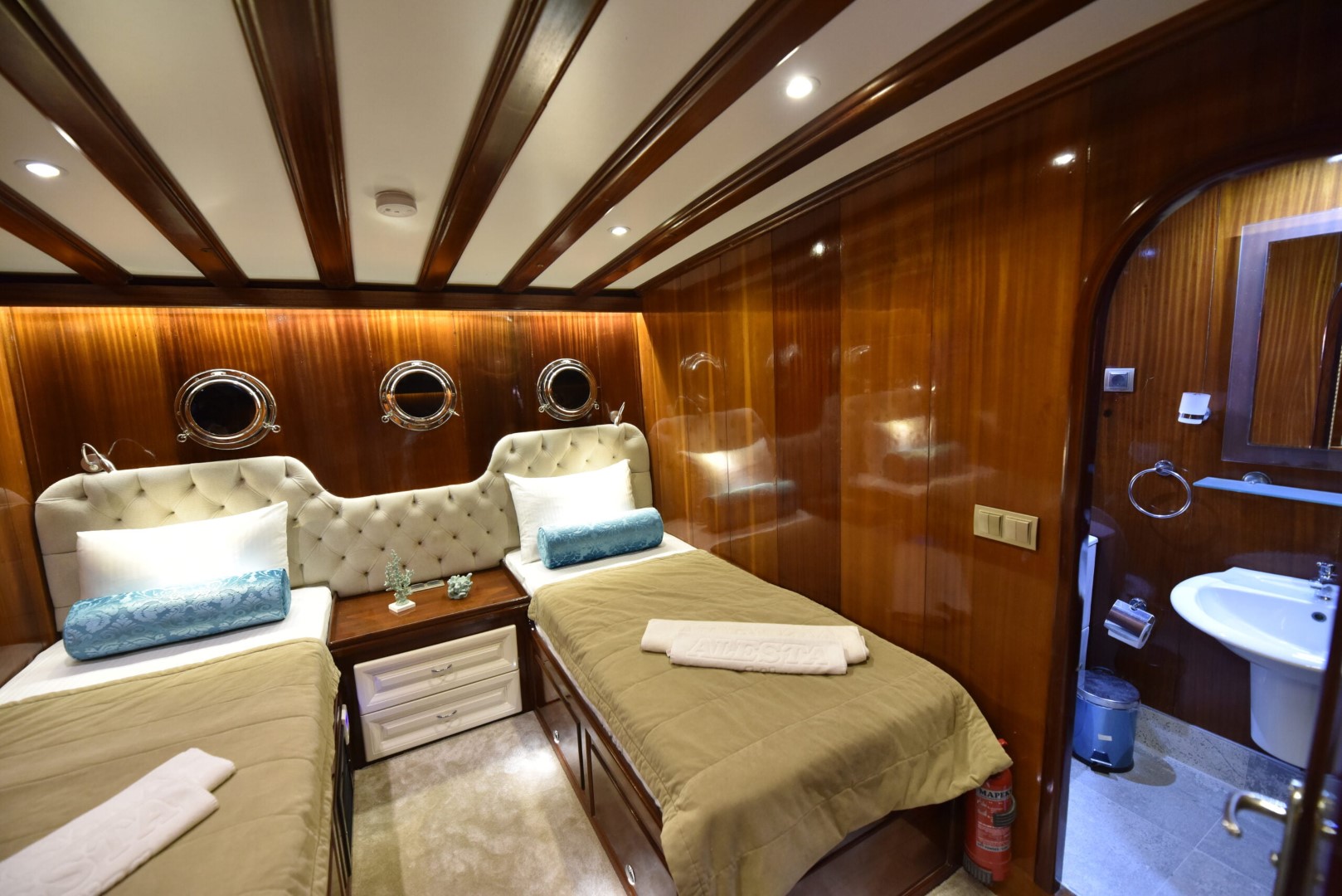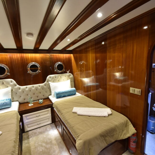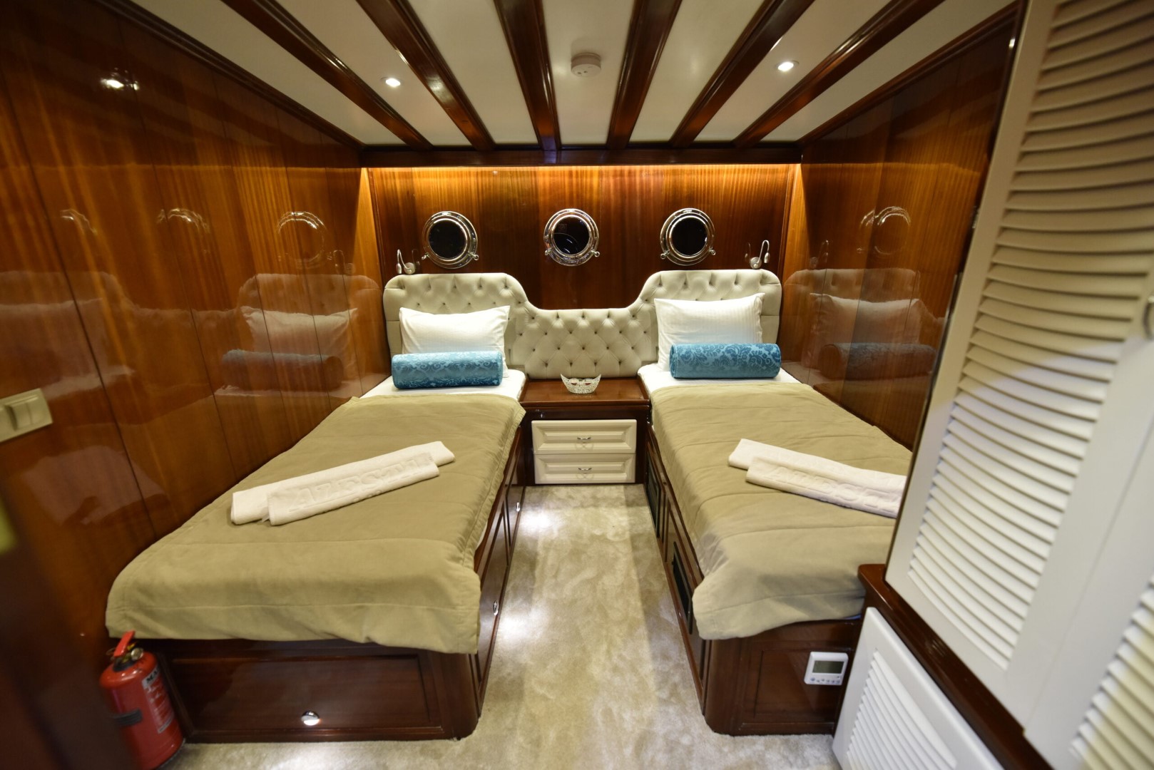 Gulet Kayhan 11 , which was built in 2002 with a length of 34 meters and a width of 7.50 meters, was completely renovated in 2009 and took its current form. It can accommodate a total of 20 guests, 6 Double Cabins and 4 Twin Cabins. Our cabins are large, spacious and modern, with Air Conditioning, Shower and WC. At the same time, a bar, a comfortable sitting area, classical furniture, a fully equipped kitchen are available to guests here. In order for the guests to have a better time, the music system, TV and satellite are located here, while the air conditioner is always open for their use, which will make them feel a little better in summer. In addition, there are options such as ice machine, coffee machine, playing cards, backgammon and okey among the items you can find on the boat. If you want to make the best use of the blue waters of the sea, it should be noted that the boat has many advantages. Equipment such as fishing equipment and diving equipment will always be available for your use here. On the other hand, sun awnings, sun beds, sea ladders, and shower facilities on the deck are among the other advantages of the boat. Yacht crew has their own living space. Our professional team, which organizes activities such as daily in-boat cleaning, service, food and beverage, and maintenance, retreats to their cabins so that they can be with you in every need for your privacy and comfort.