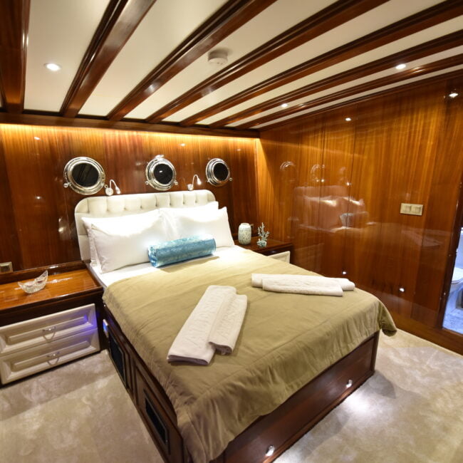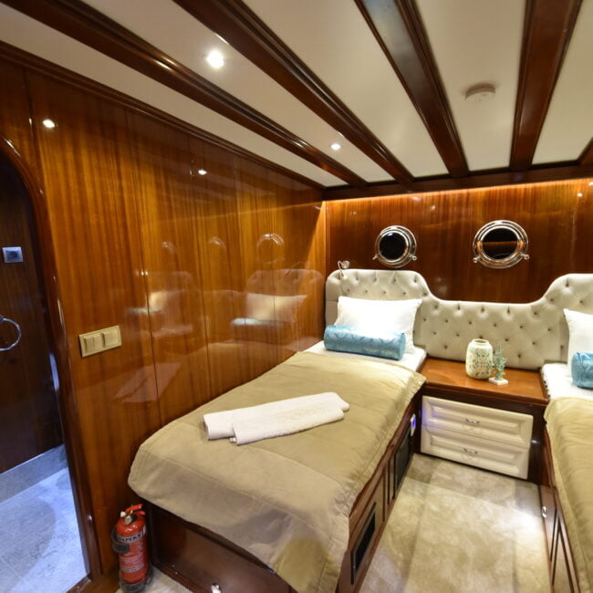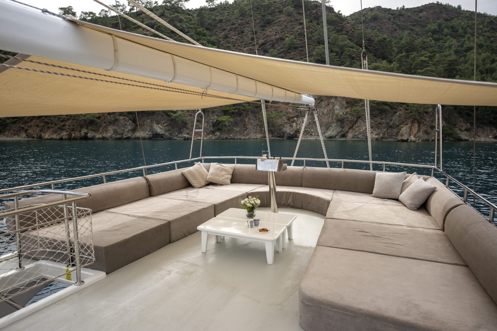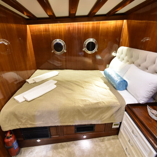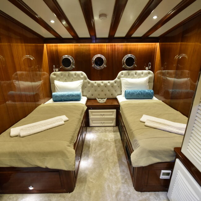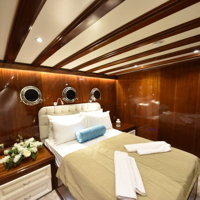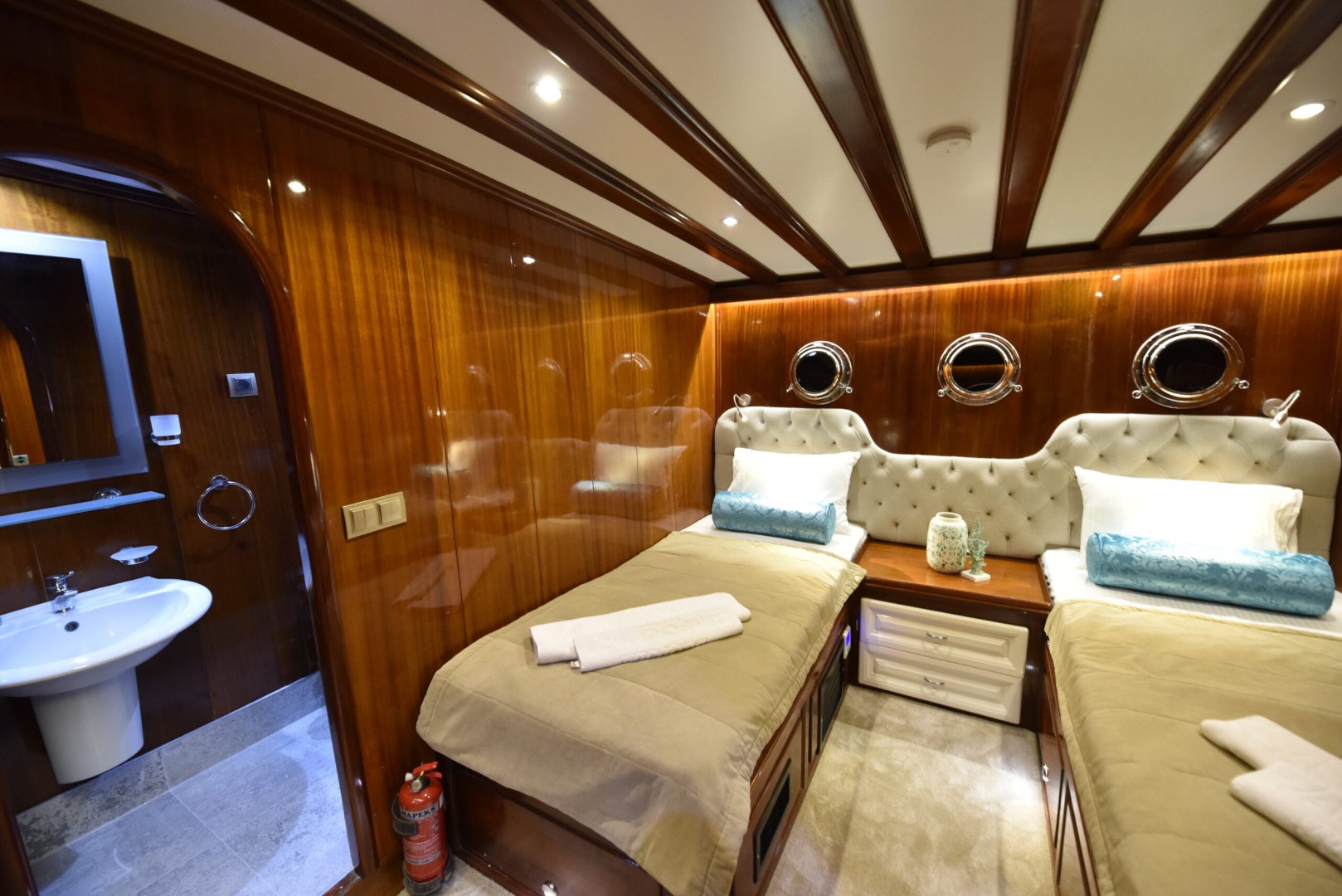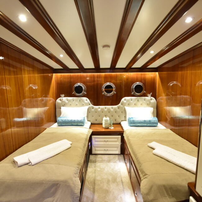 Gulet Kayhan 11 , which was built in 2002 with a length of 34 meters and a width of 7.50 meters, was completely renovated in 2009 and took its current form. It can accommodate a total of 20 guests, 6 Double Cabins and 4 Twin Cabins. Our cabins are large, spacious and modern, with Air Conditioning, Shower and WC. At the same time, a bar, a comfortable sitting area, classical furniture, a fully equipped kitchen are available to guests here. In order for the guests to have a better time, the music system, TV and satellite are located here, while the air conditioner is always open for their use, which will make them feel a little better in summer. In addition, there are options such as ice machine, coffee machine, playing cards, backgammon and okey among the items you can find on the boat. If you want to make the best use of the blue waters of the sea, it should be noted that the boat has many advantages. Equipment such as fishing equipment and diving equipment will always be available for your use here. On the other hand, sun awnings, sun beds, sea ladders, and shower facilities on the deck are among the other advantages of the boat. Yacht crew has their own living space. Our professional team, which organizes activities such as daily in-boat cleaning, service, food and beverage, and maintenance, retreats to their cabins so that they can be with you in every need for your privacy and comfort.