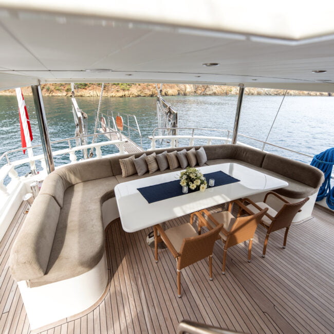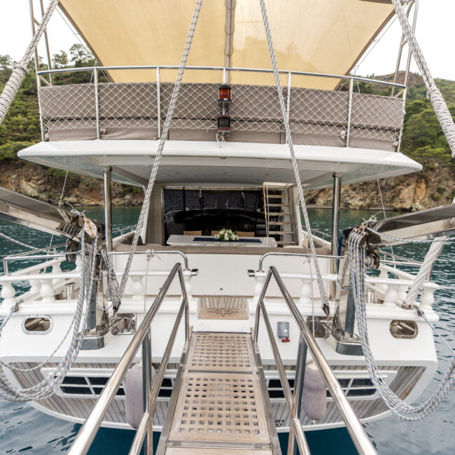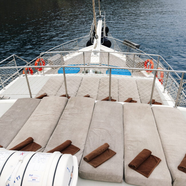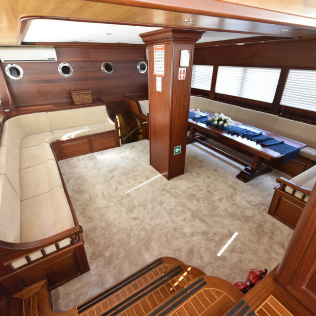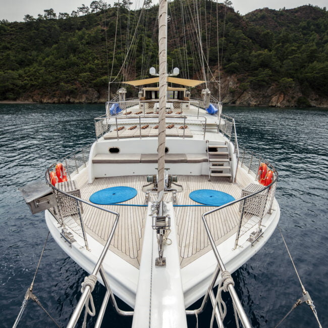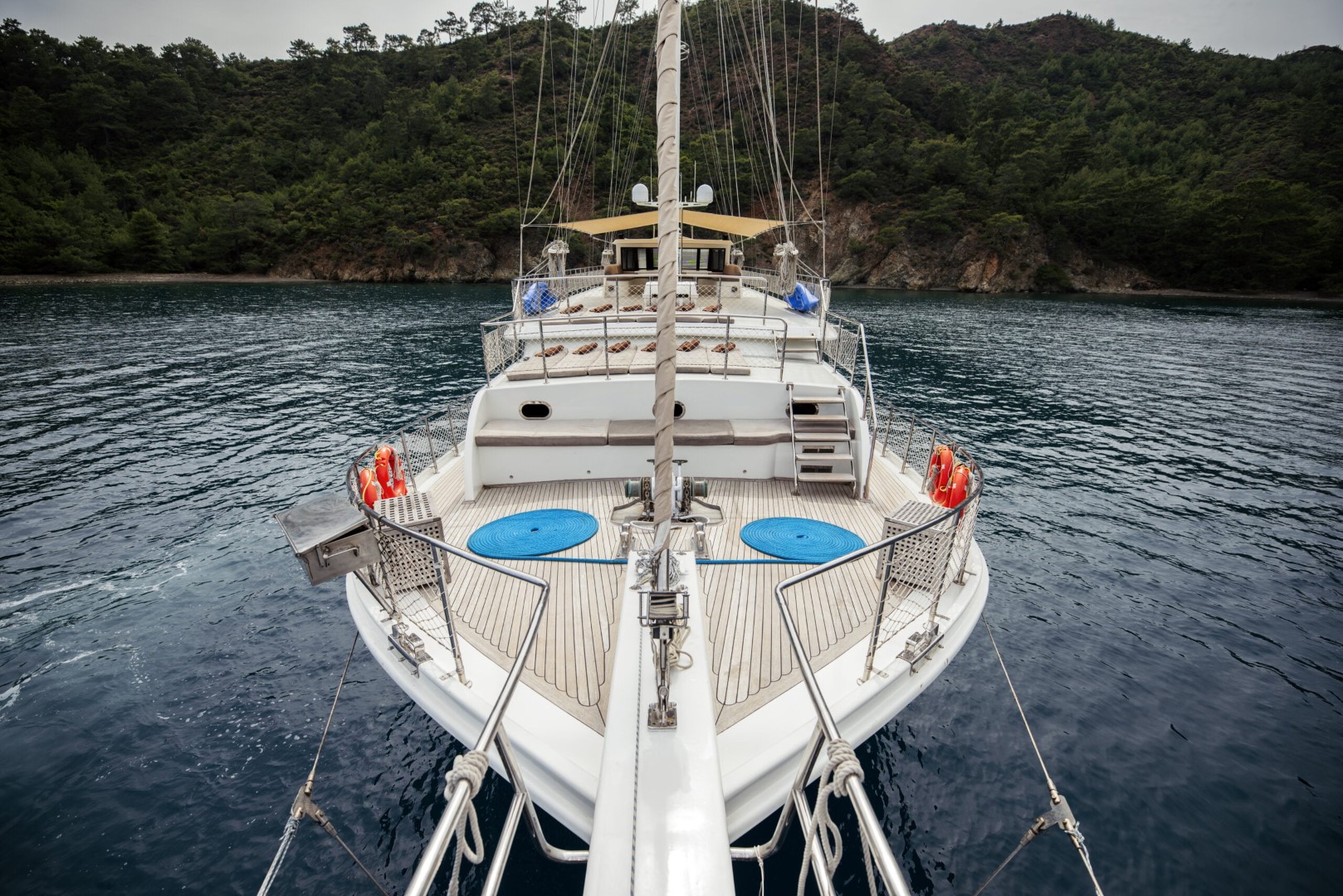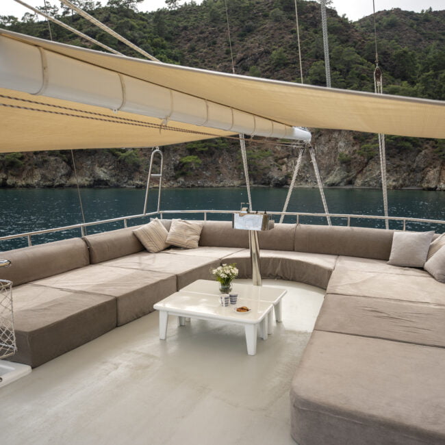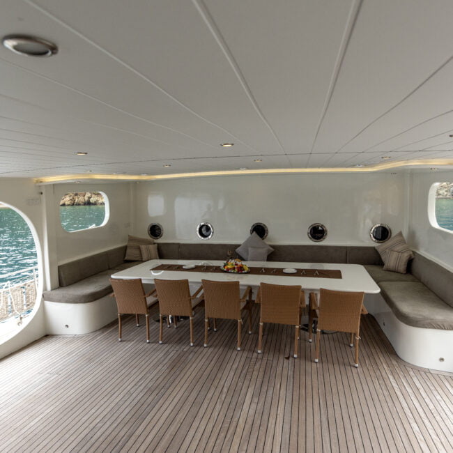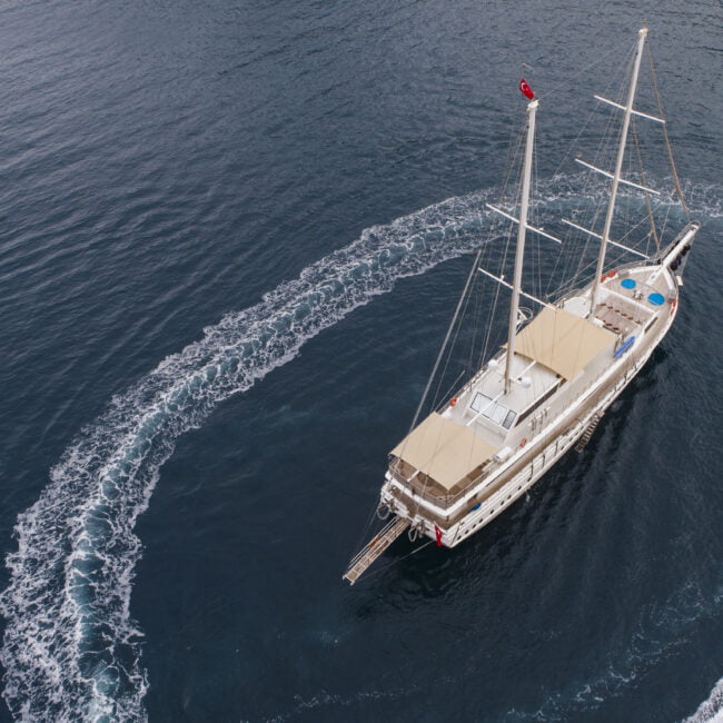 Gulet Kayhan 11 , which was built in 2002 with a length of 34 meters and a width of 7.50 meters, was completely renovated in 2009 and took its current form. It can accommodate a total of 20 guests, 6 Double Cabins and 4 Twin Cabins. Our cabins are large, spacious and modern, with Air Conditioning, Shower and WC. At the same time, a bar, a comfortable sitting area, classical furniture, a fully equipped kitchen are available to guests here. In order for the guests to have a better time, the music system, TV and satellite are located here, while the air conditioner is always open for their use, which will make them feel a little better in summer. In addition, there are options such as ice machine, coffee machine, playing cards, backgammon and okey among the items you can find on the boat. If you want to make the best use of the blue waters of the sea, it should be noted that the boat has many advantages. Equipment such as fishing equipment and diving equipment will always be available for your use here. On the other hand, sun awnings, sun beds, sea ladders, and shower facilities on the deck are among the other advantages of the boat. Yacht crew has their own living space. Our professional team, which organizes activities such as daily in-boat cleaning, service, food and beverage, and maintenance, retreats to their cabins so that they can be with you in every need for your privacy and comfort.