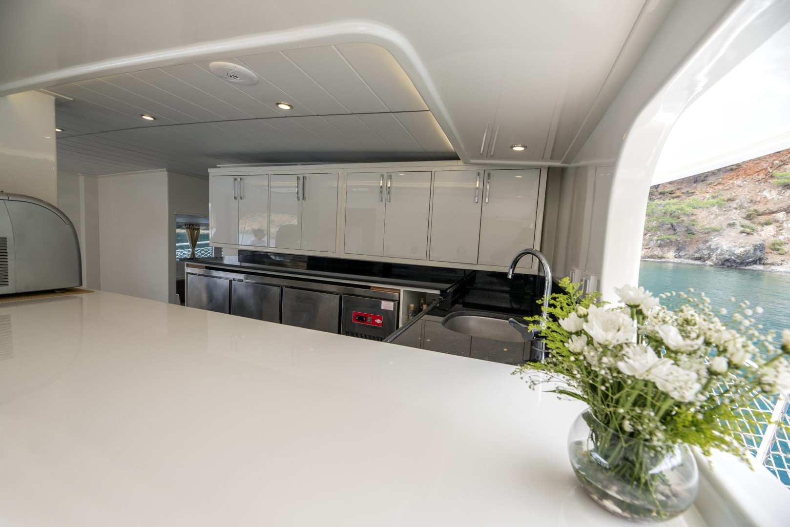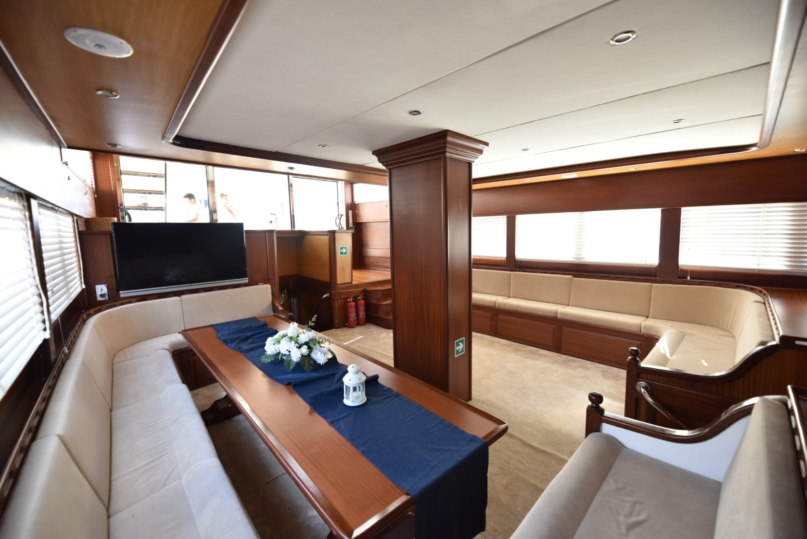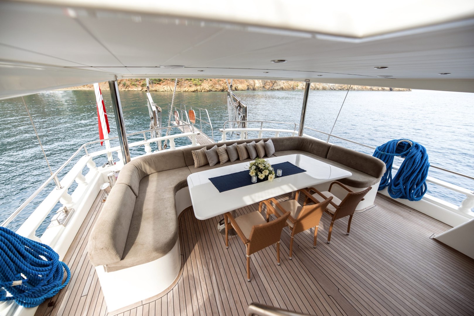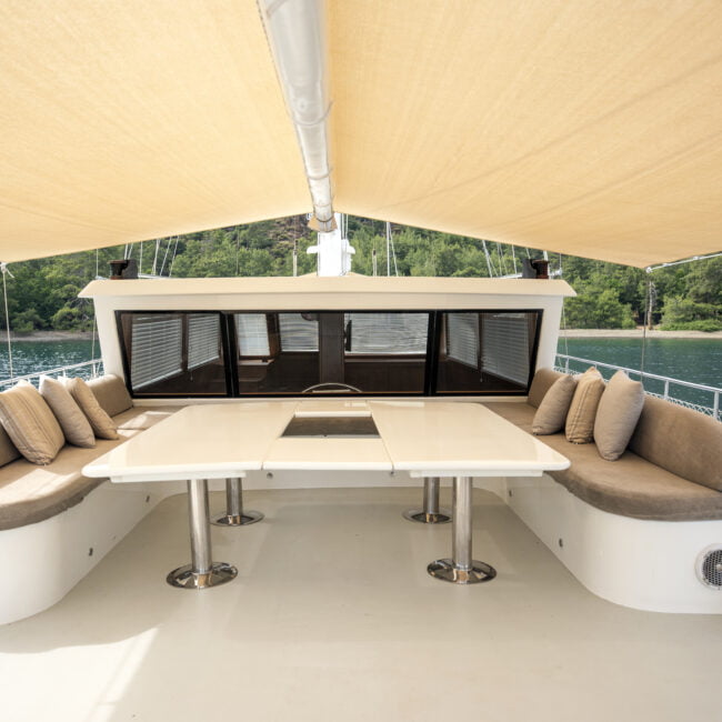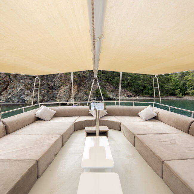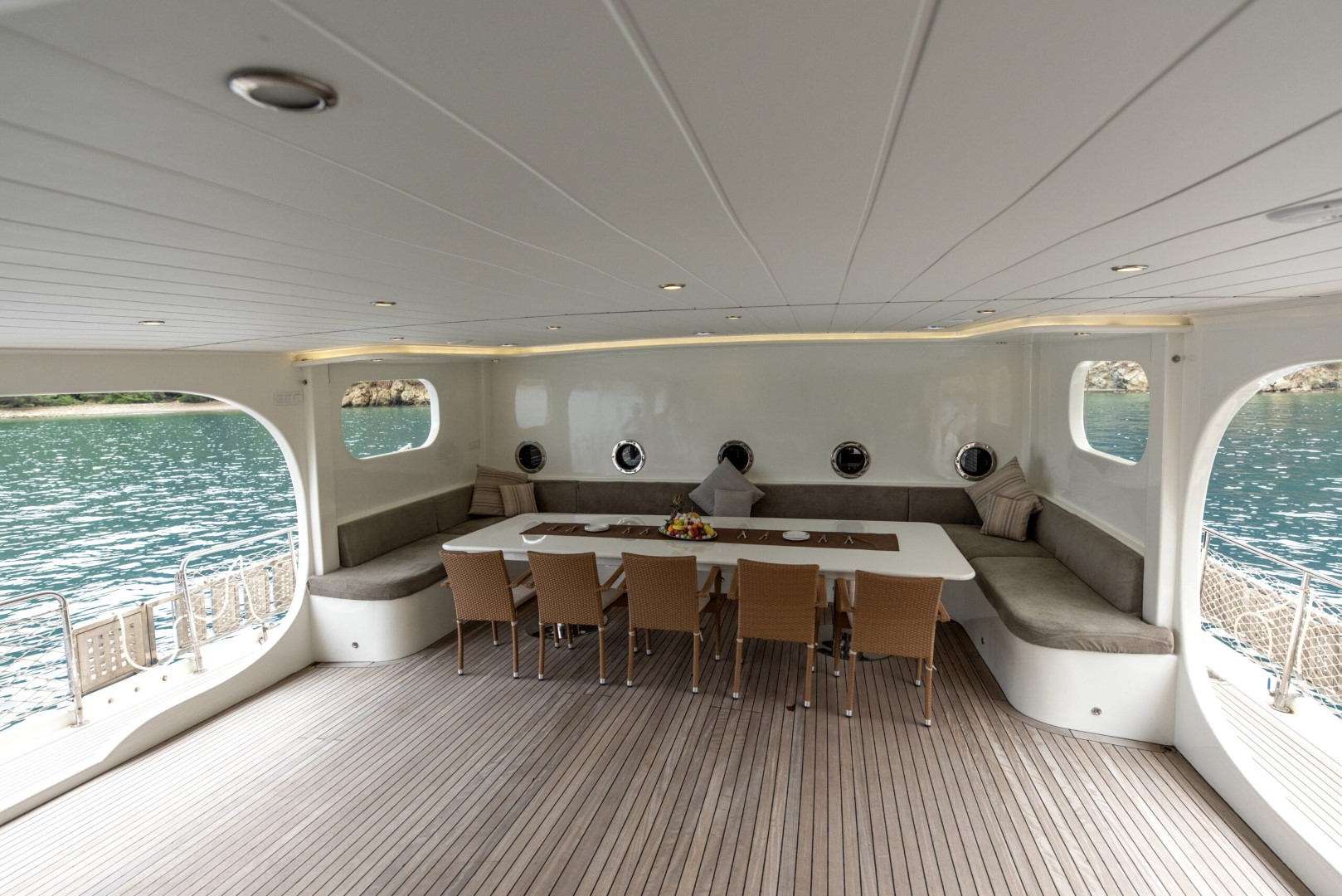 Gulet Kayhan 11 , which was built in 2002 with a length of 34 meters and a width of 7.50 meters, was completely renovated in 2009 and took its current form. It can accommodate a total of 20 guests, 6 Double Cabins and 4 Twin Cabins. Our cabins are large, spacious and modern, with Air Conditioning, Shower and WC. At the same time, a bar, a comfortable sitting area, classical furniture, a fully equipped kitchen are available to guests here. In order for the guests to have a better time, the music system, TV and satellite are located here, while the air conditioner is always open for their use, which will make them feel a little better in summer. In addition, there are options such as ice machine, coffee machine, playing cards, backgammon and okey among the items you can find on the boat. If you want to make the best use of the blue waters of the sea, it should be noted that the boat has many advantages. Equipment such as fishing equipment and diving equipment will always be available for your use here. On the other hand, sun awnings, sun beds, sea ladders, and shower facilities on the deck are among the other advantages of the boat. Yacht crew has their own living space. Our professional team, which organizes activities such as daily in-boat cleaning, service, food and beverage, and maintenance, retreats to their cabins so that they can be with you in every need for your privacy and comfort.