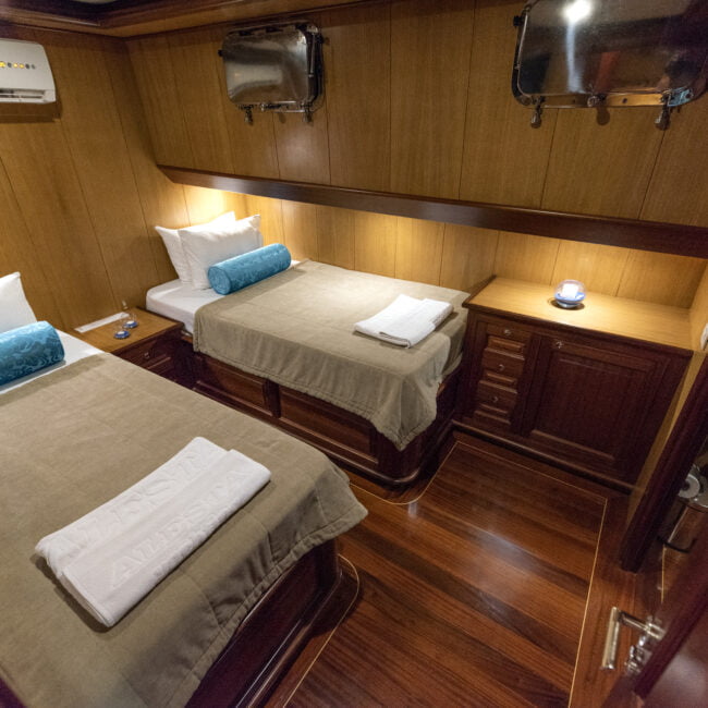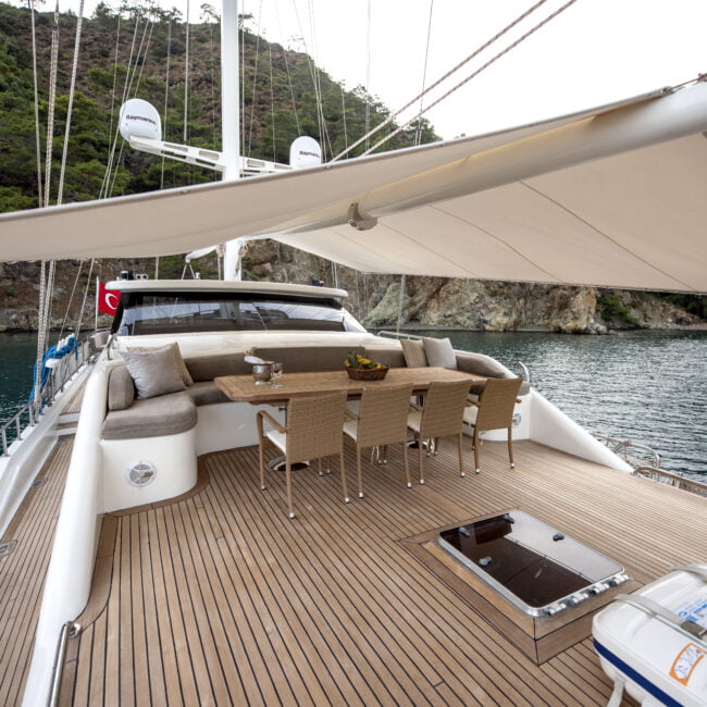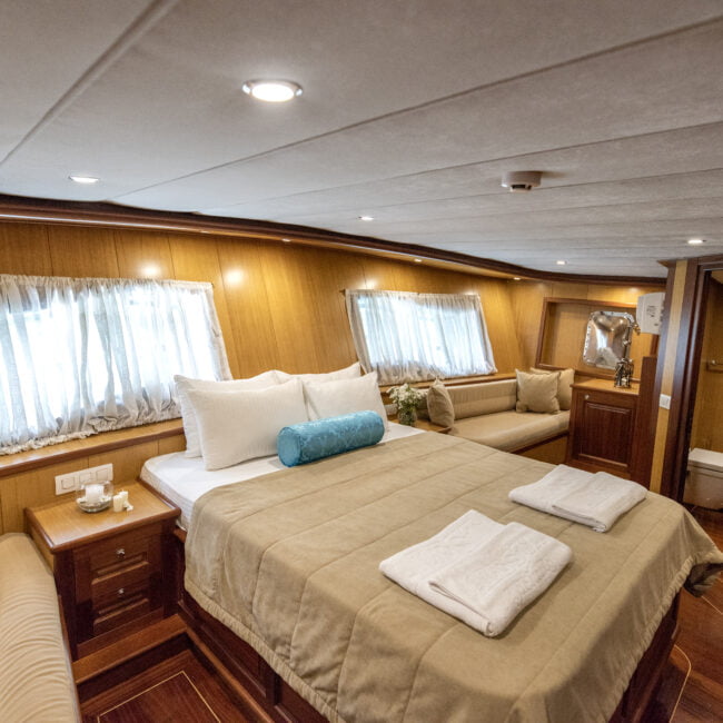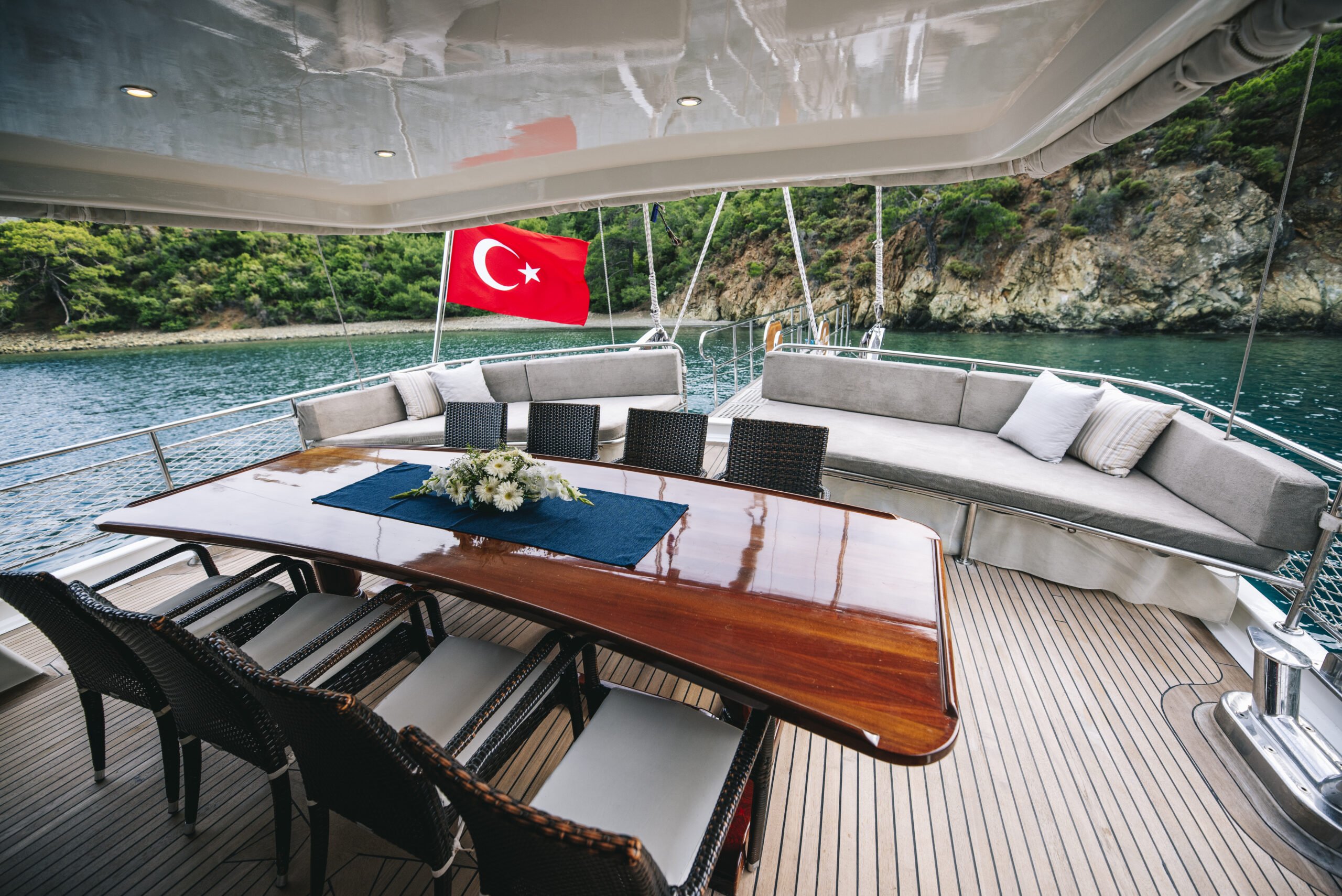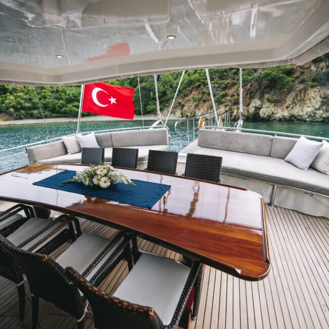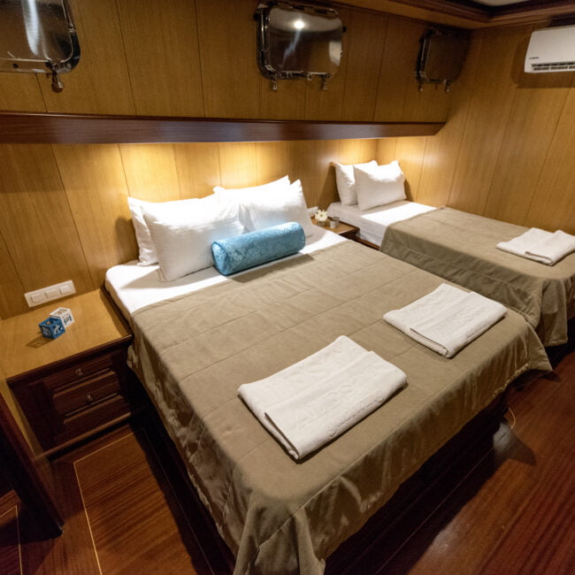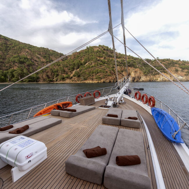 Gulet Kayhan 3 is a high quality yacht with a length of 27 meters and was built in 2014. Modern and spacious cabins, lounge and deck have been specially designed for our Gulet Kayhan 3 guests. Our cabins offer accommodation for up to 10 guests, including 1 master, 2 triple and 2 twin cabins. Each cabin has a private shower and toilet, and all cabins are air conditioned. Gulet Kayhan 3 has a fully equipped separate kitchen, indoor and outdoor dining area and an air-conditioned lounge. There is a TV, DVD and music system in the lounge and all cabins. There are also sufficient sunbathing cushions in a large area on the deck. Gulet Kayhan 3 Crew Gulet Kayhan 3 offers luxury service with its team of 3 professional, experienced people. This team consists of the captain, chief, deck and service personnel. There are separate cabins to accommodate the staff who will accompany you throughout the tour. The crew meticulously meets all your needs such as organizing daily activities on the boat, cleaning, service, food and beverage, and security. They have received special training for the safety and comfort of their guests and accordingly, they will be with you whenever you need them and will retreat to their own areas whenever you want privacy.