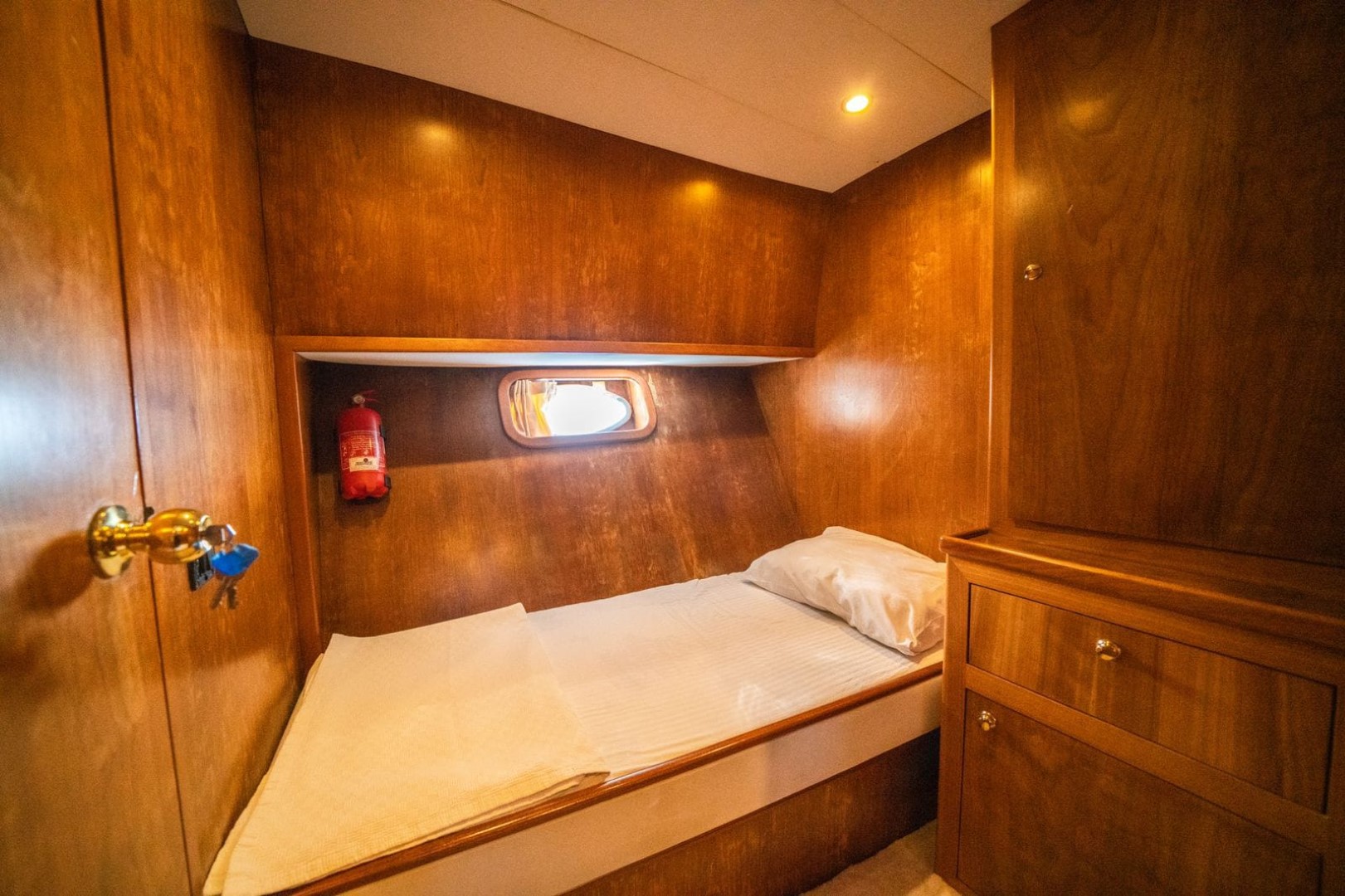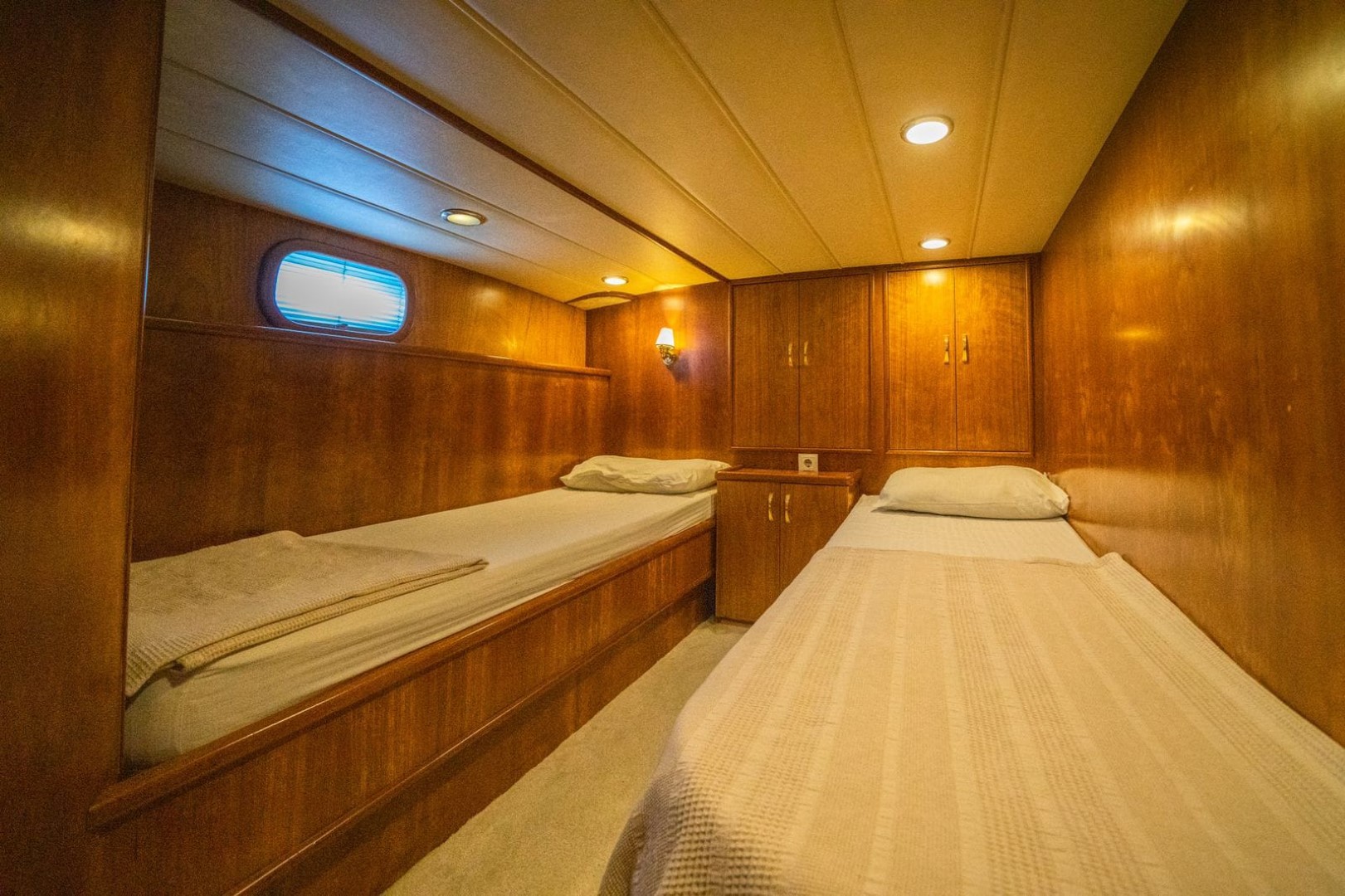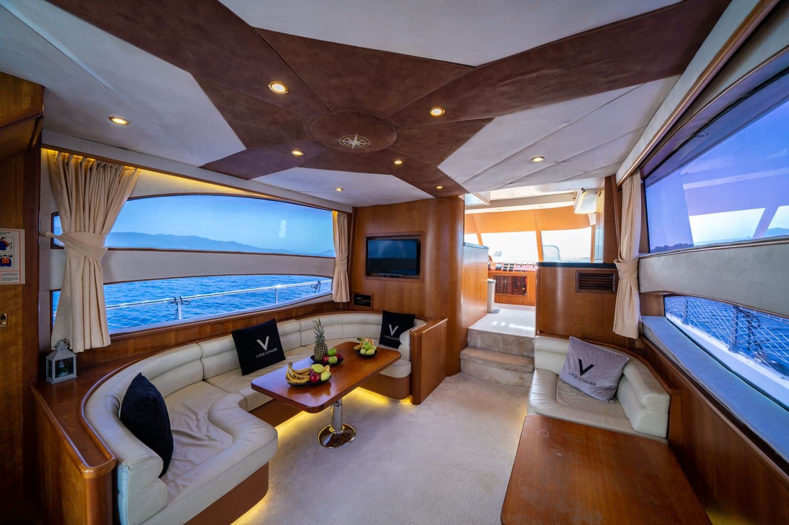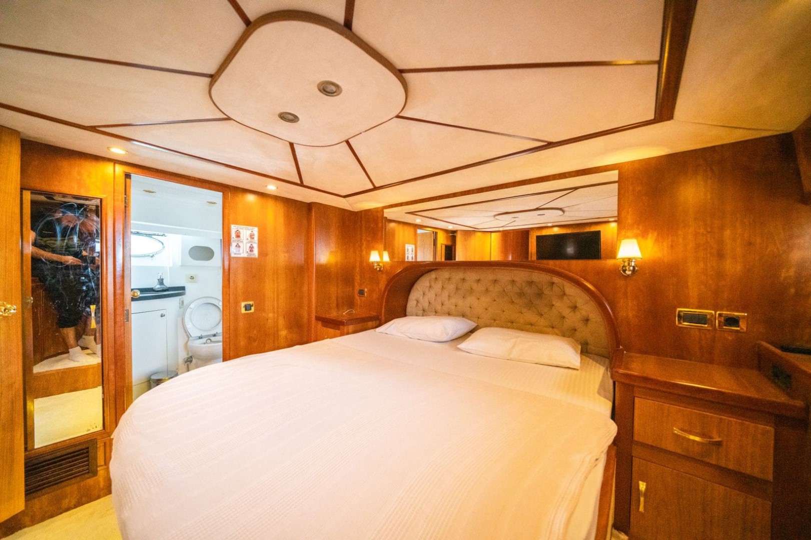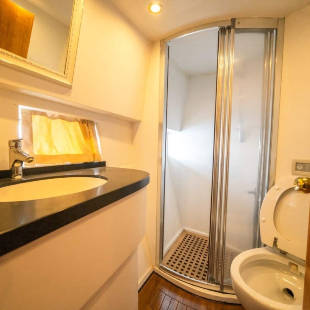 total of 4 cabins, 2 Master, 1 Double and 1 Twin. There is a TV in the living room and 1 in the master cabin. Each cabin has a bathroom