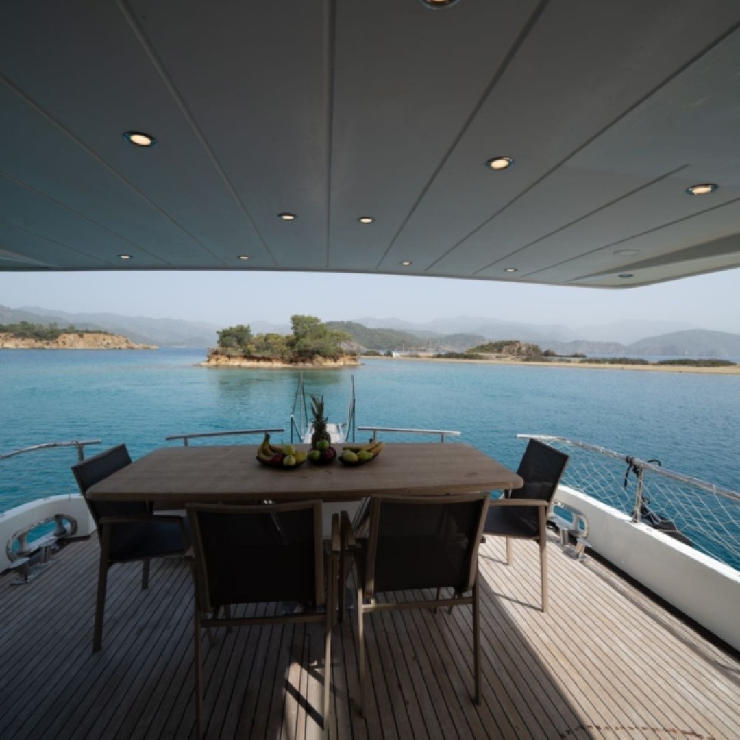 on the back deck and on the flybridge. It has large enough comfortable sunbathing mats for all its guests on the flybridge and the
