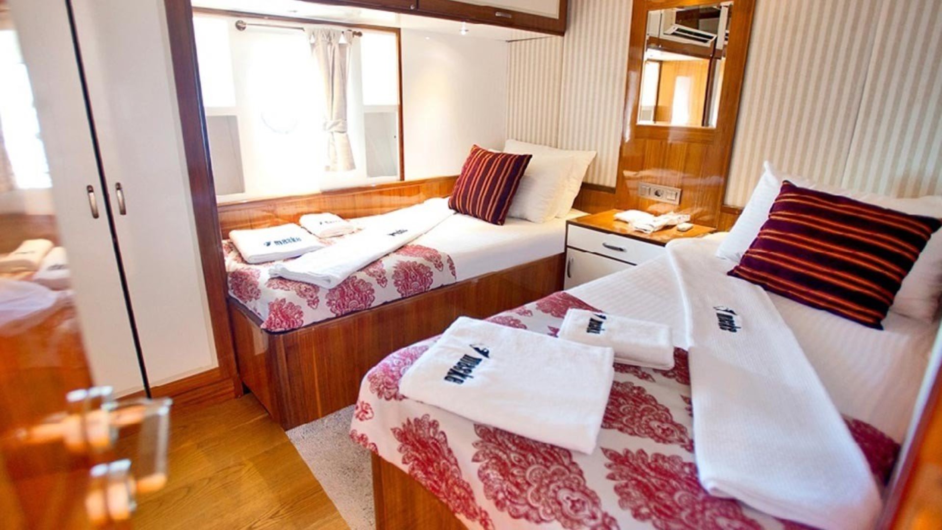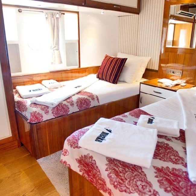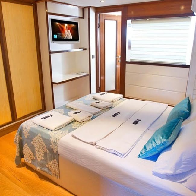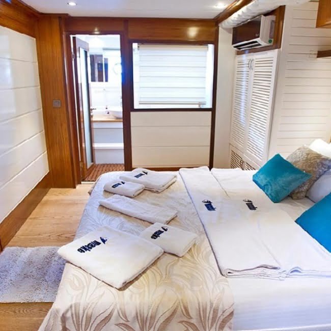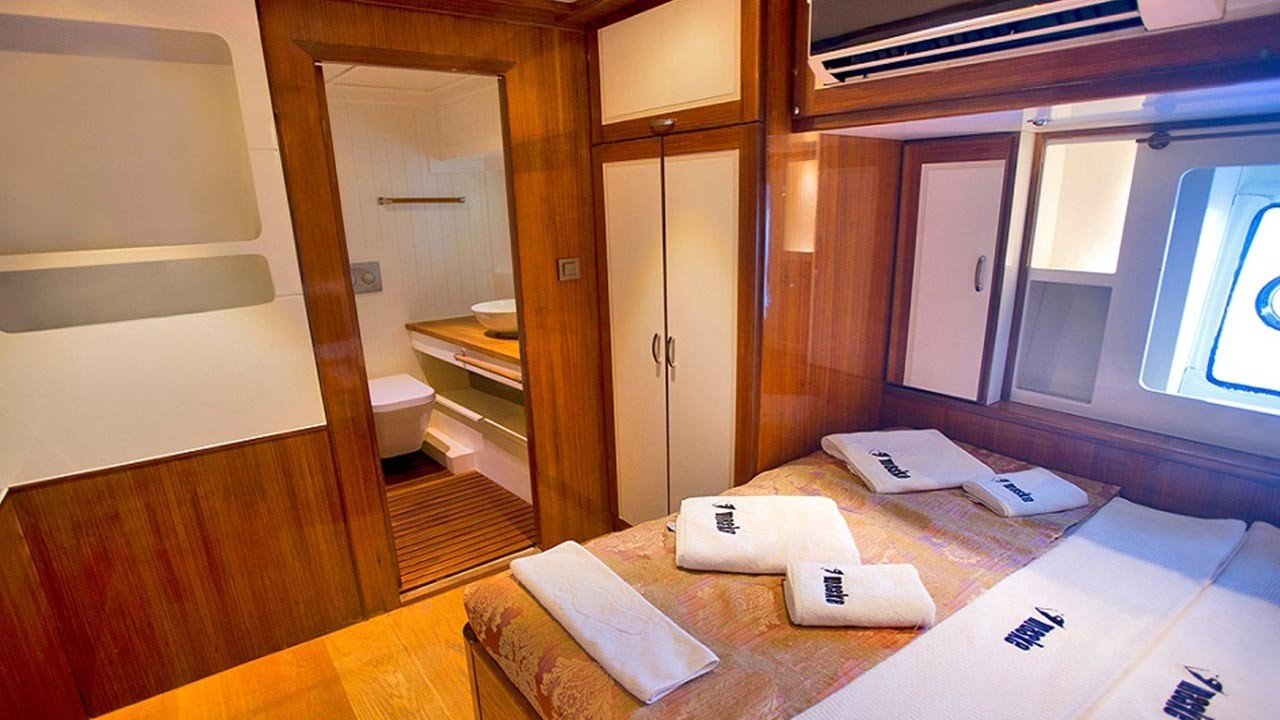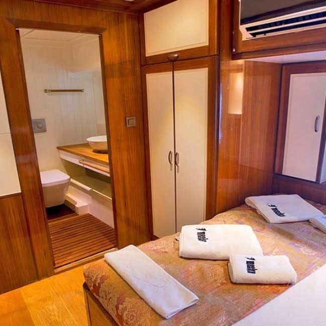Tv, Air Conditioning, Shower & WC are available in all cabins of our gulet which can accommodate 12 guests.