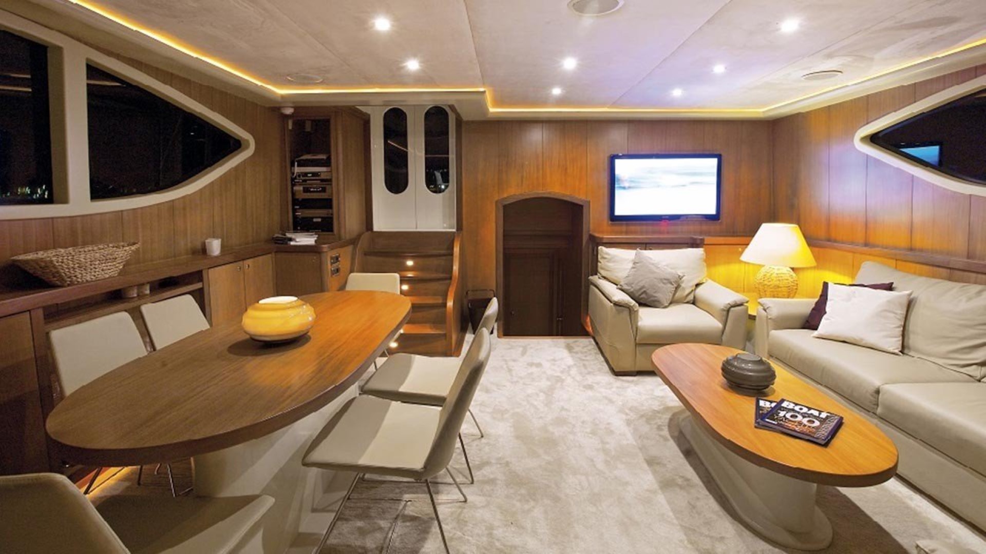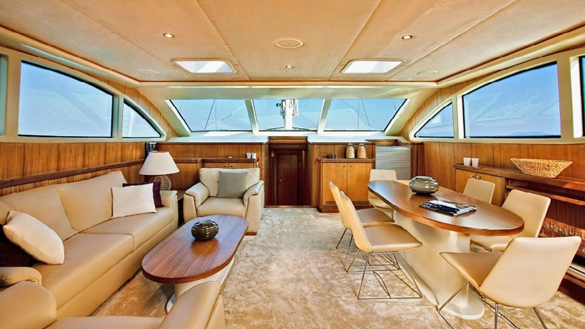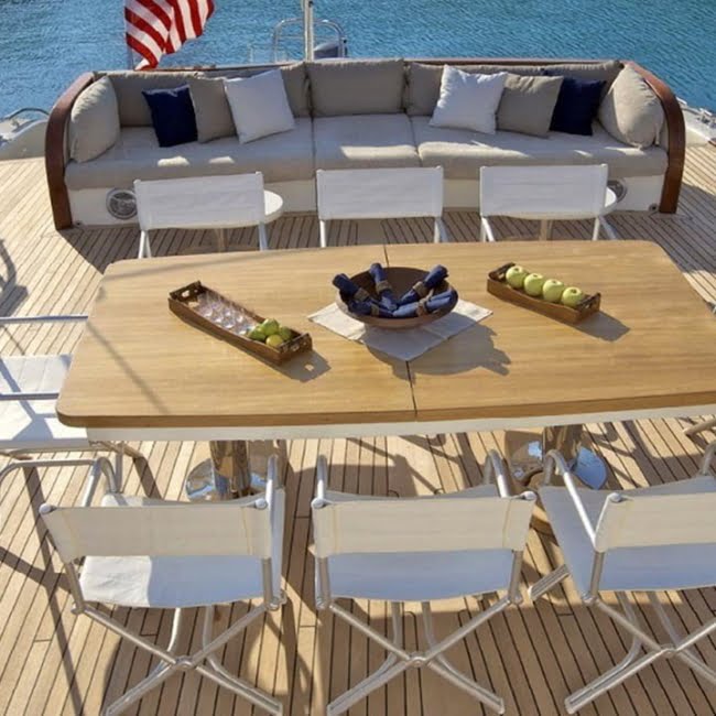 There is an elegant dining table and a seating group on the Topdeck.