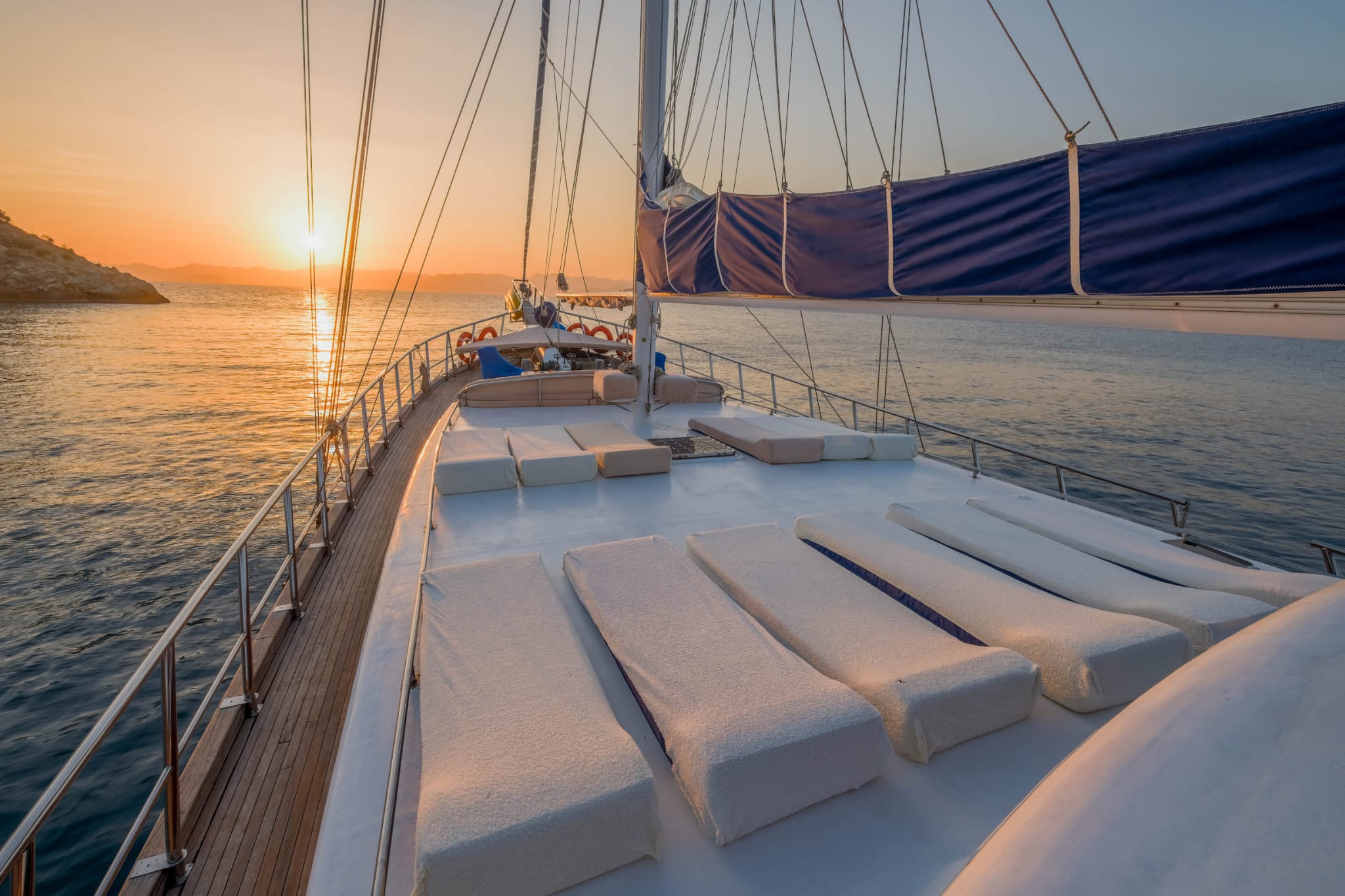 There is a music system in the saloon and deck. There are sunbathing cushions, a dining table and a sitting group on the deck.