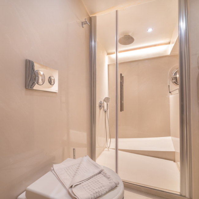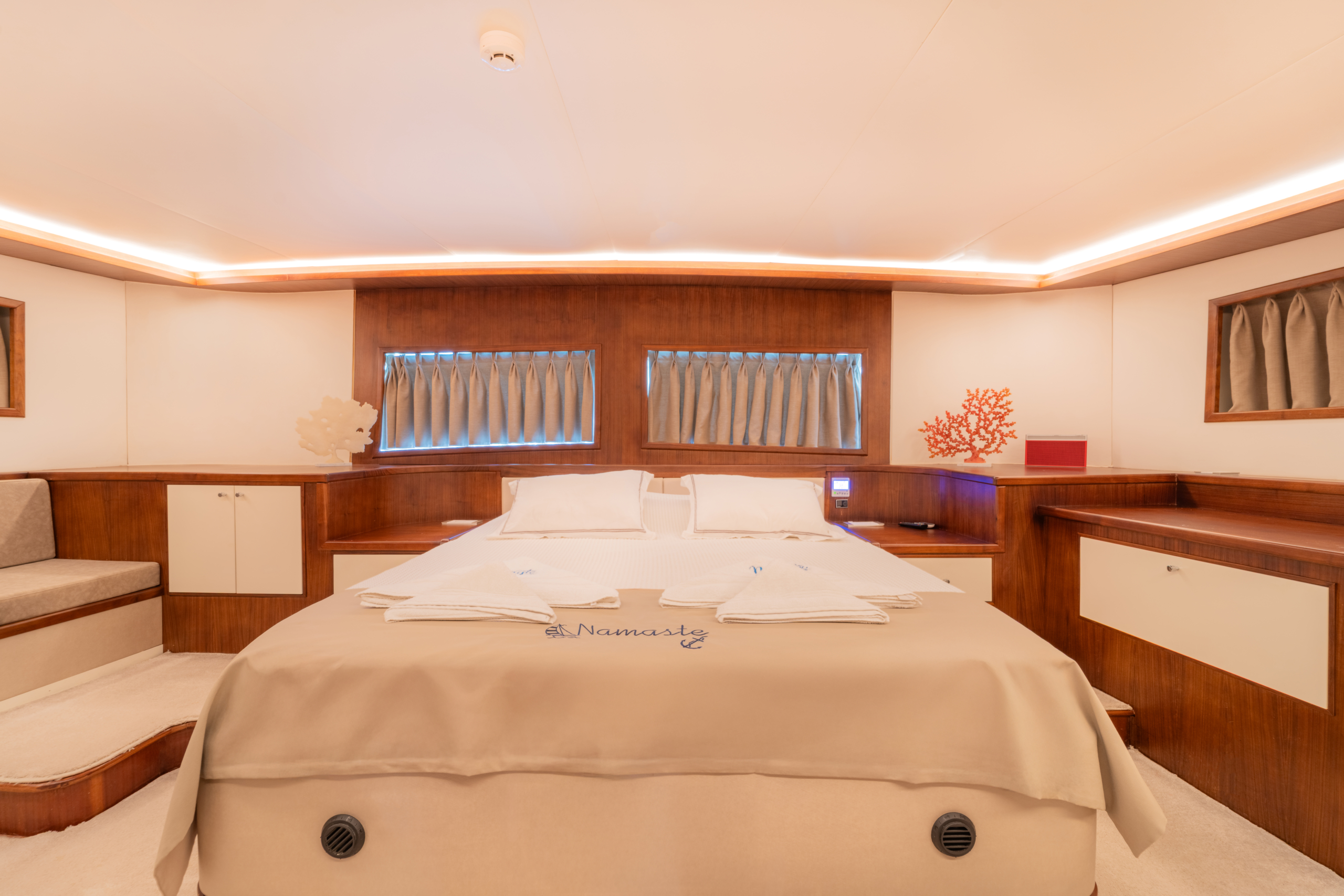 İki adet 440 HP Scania motorla ve üç jeneratörle (2 x 32 kW Albo Marin ve 1 x 17 kW Onan) Gulet Namaste, yüksek performans ve sürekli konfor sağlar. 350 litrelik su hazırlama ünitesi, konfordan ödün vermeden uzun süreli seyir seçenekleri sunar.