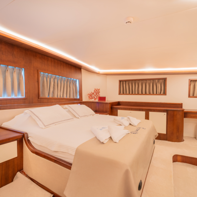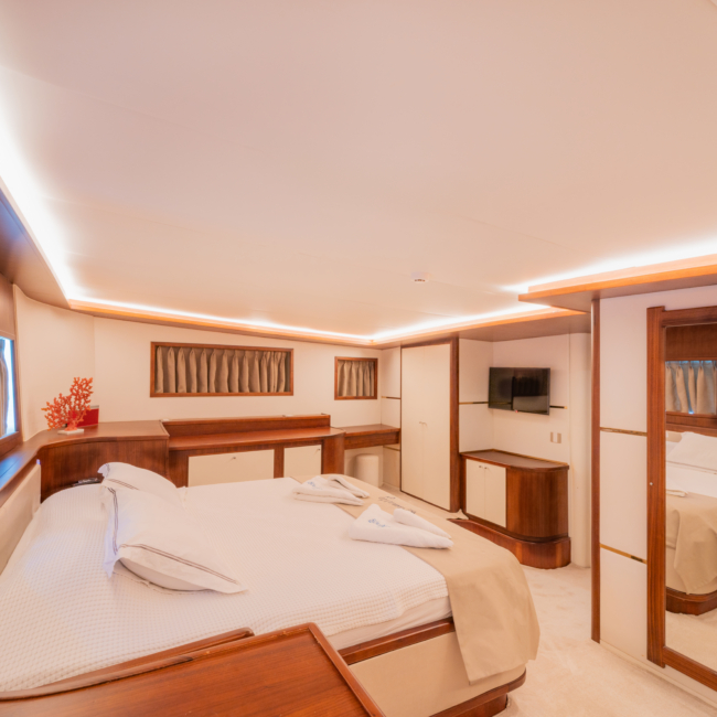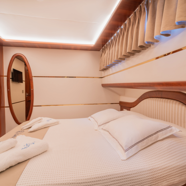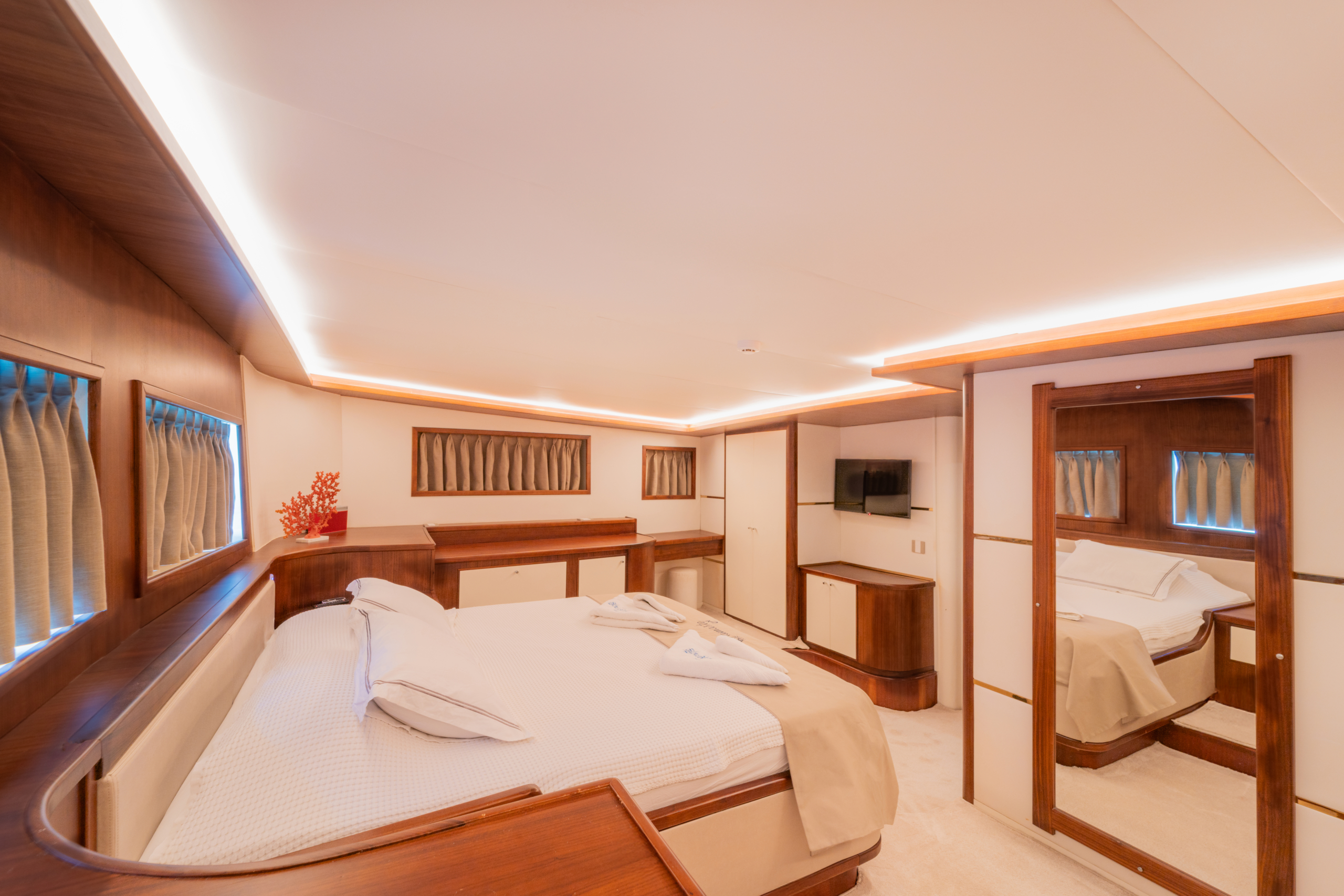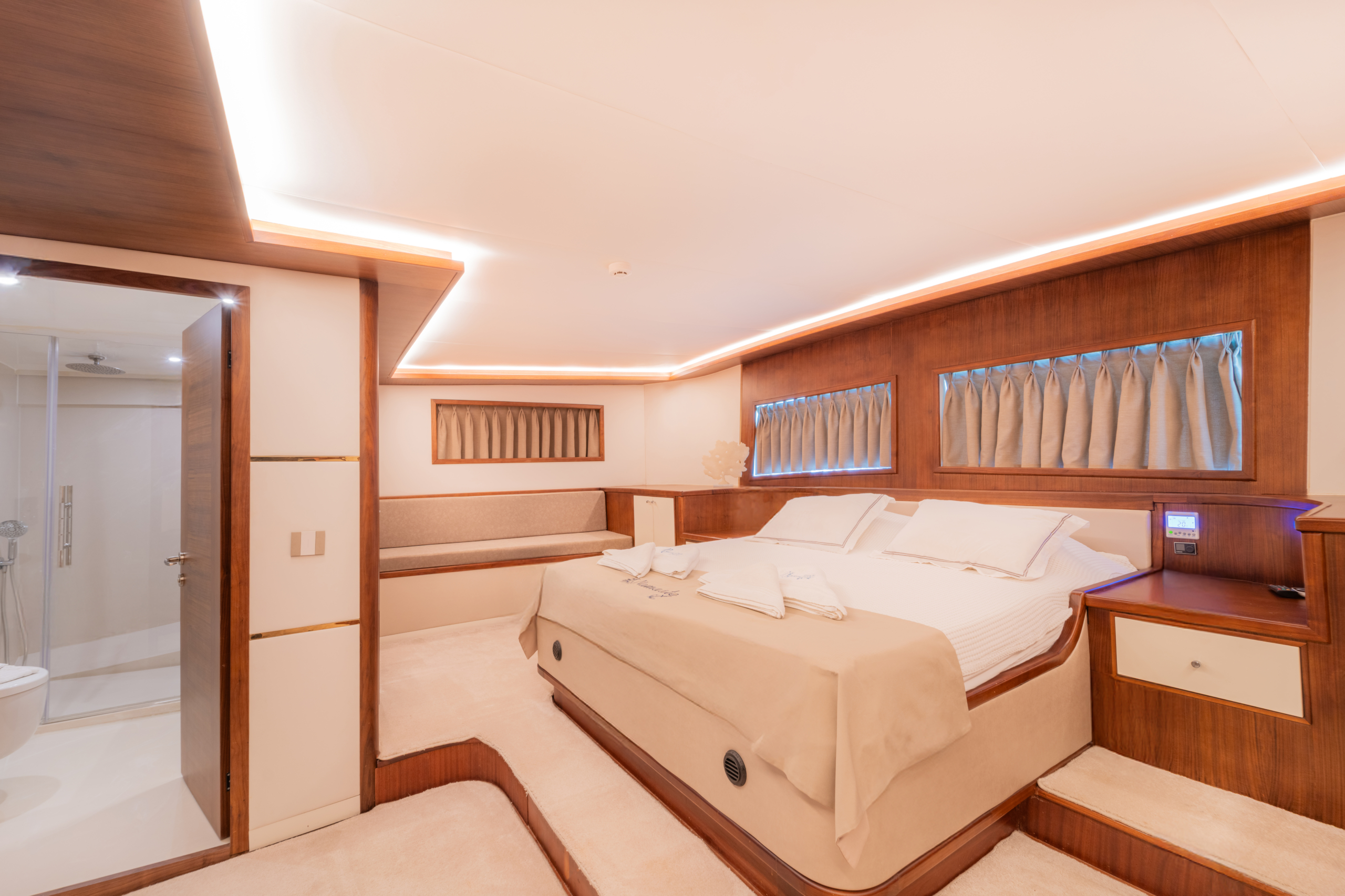 Yatta 2 master kabin ve 3 çift kişilik kabin olmak üzere toplam 5 kabin bulunmaktadır. Tüm kabinlerde özel banyo, düz ekran TV ve kişiye özel kontrollü merkezi klima bulunmaktadır. Teknede bulunan Wi-Fi ve uydu sistemi sayesinde denizdeyken bile bağlantıda kalabilirsiniz.