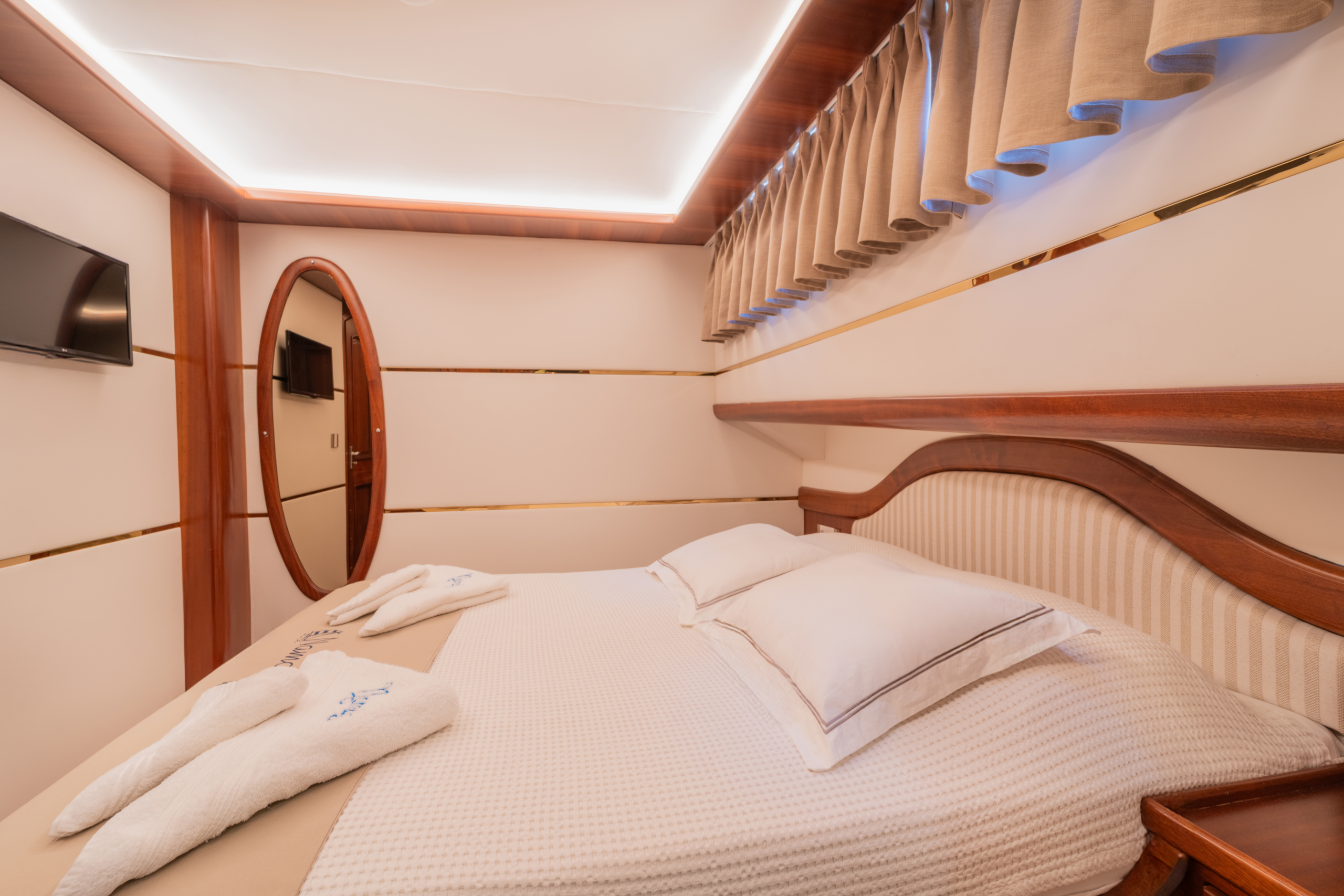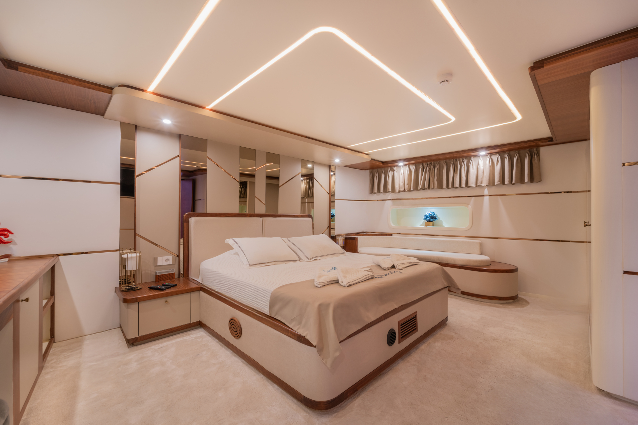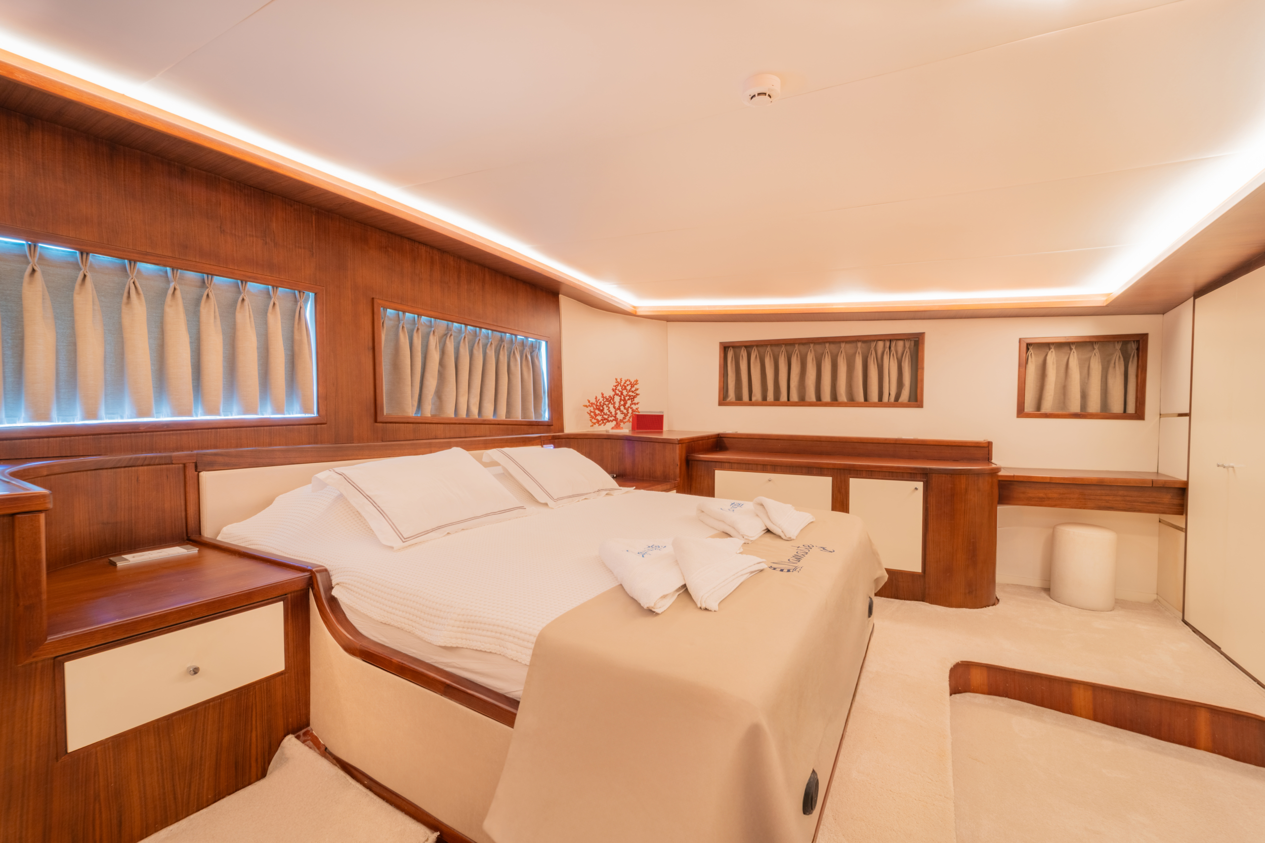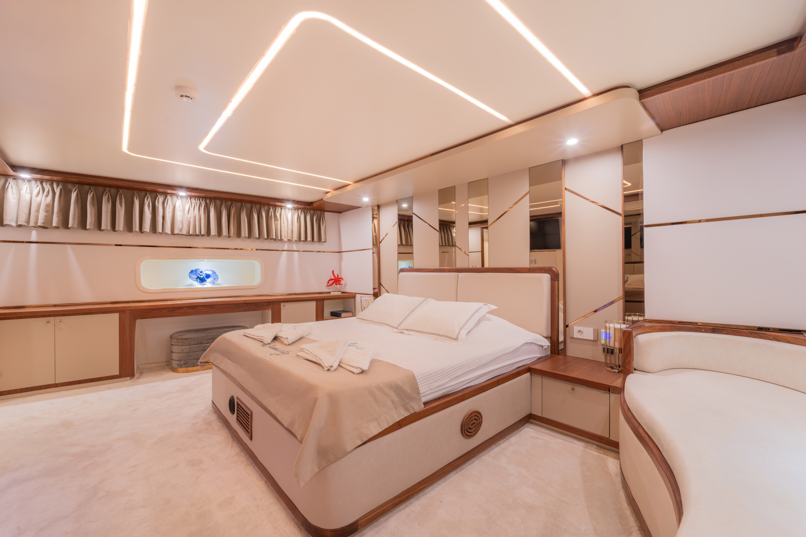 Yatta 2 master kabin ve 3 çift kişilik kabin olmak üzere toplam 5 kabin bulunmaktadır. Tüm kabinlerde özel banyo, düz ekran TV ve kişiye özel kontrollü merkezi klima bulunmaktadır. Teknede bulunan Wi-Fi ve uydu sistemi sayesinde denizdeyken bile bağlantıda kalabilirsiniz.