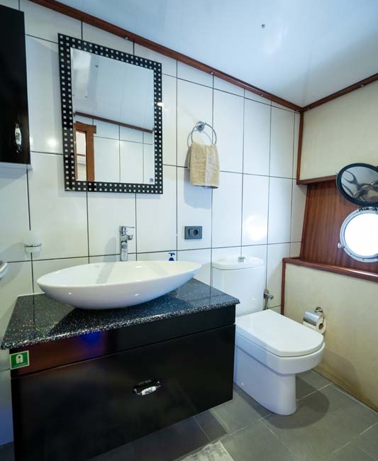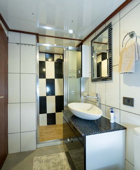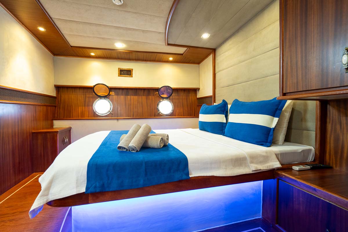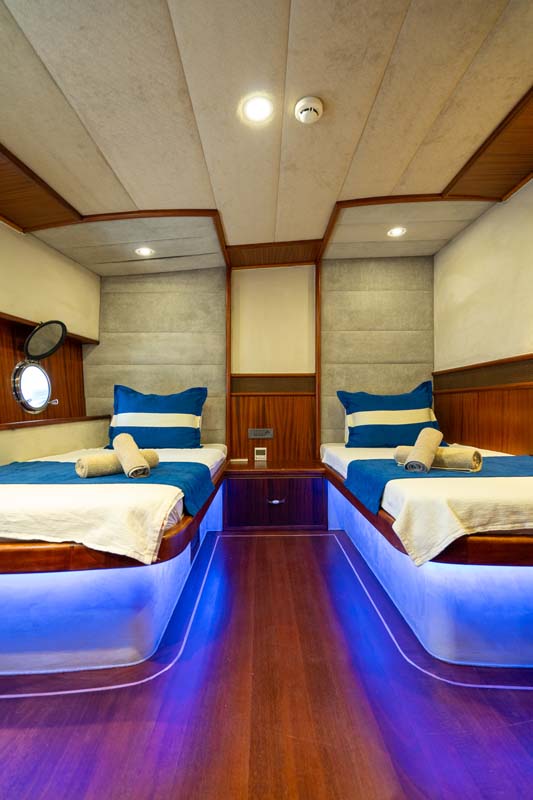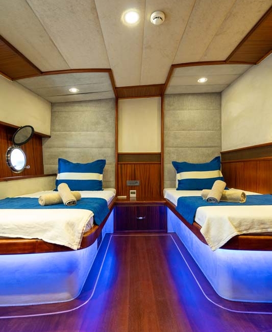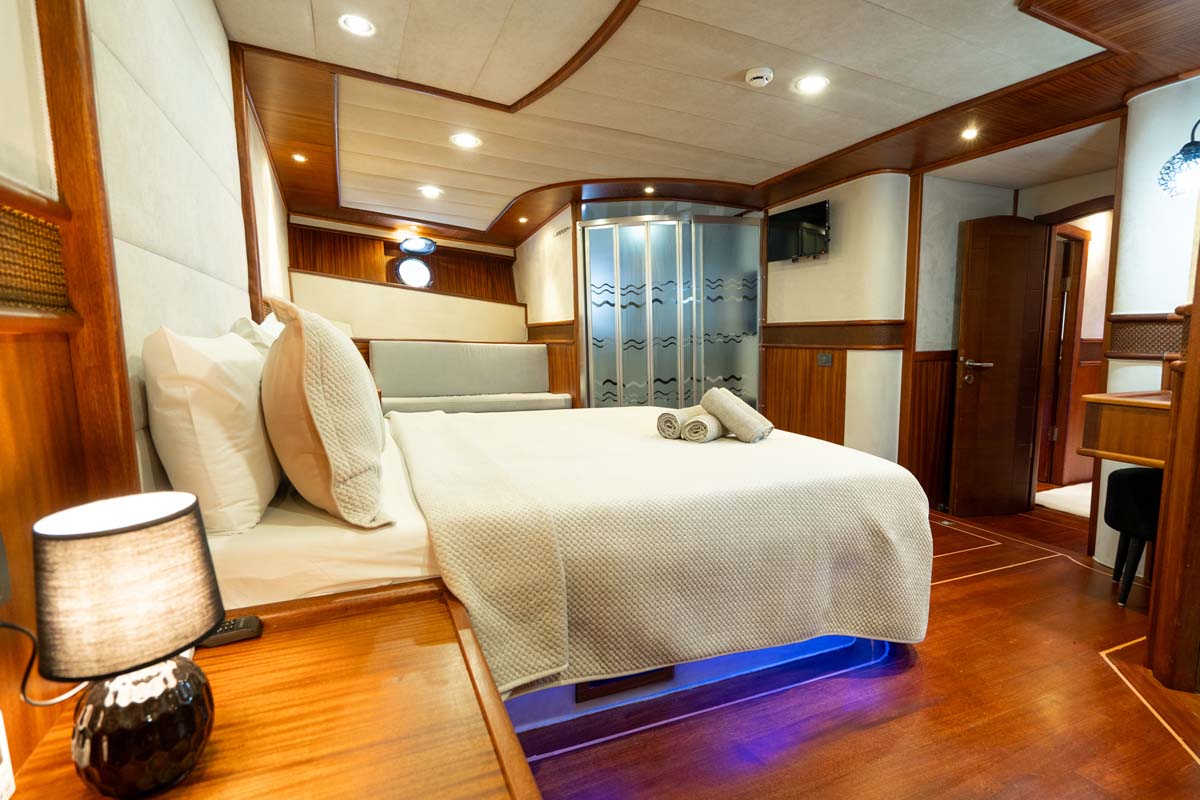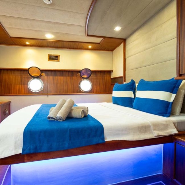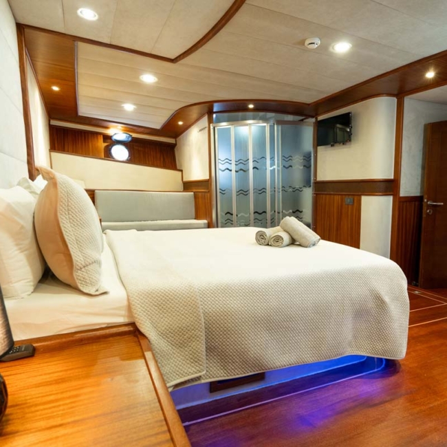 Gulet Nevra Queen is 40 meters long and can accommodate 20 guests in 2 cabins, 6 double and 2 twin cabins. The cabins also have a TV,