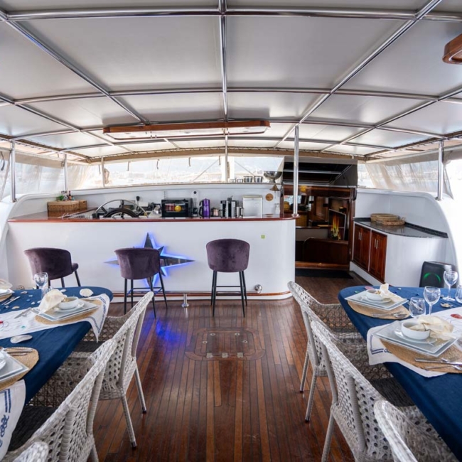 Nevra Queen’s gulet is equipped with air conditioning, TV and satellite broadcasting, internet connection, a fully equipped navigation system and water sports equipment in all cabins in the luxury segment. There is a big boat that can walk around.