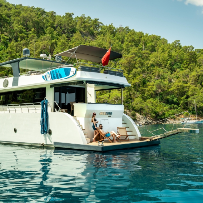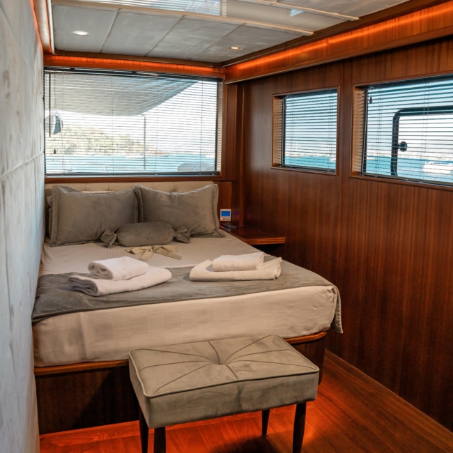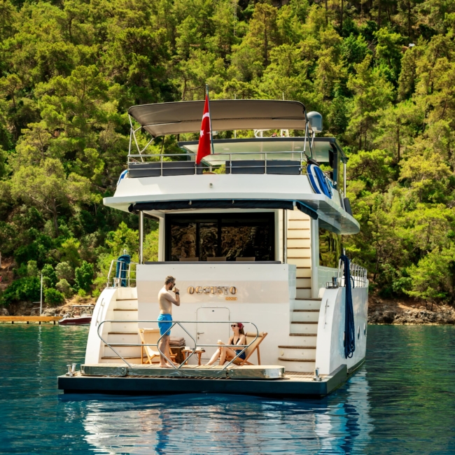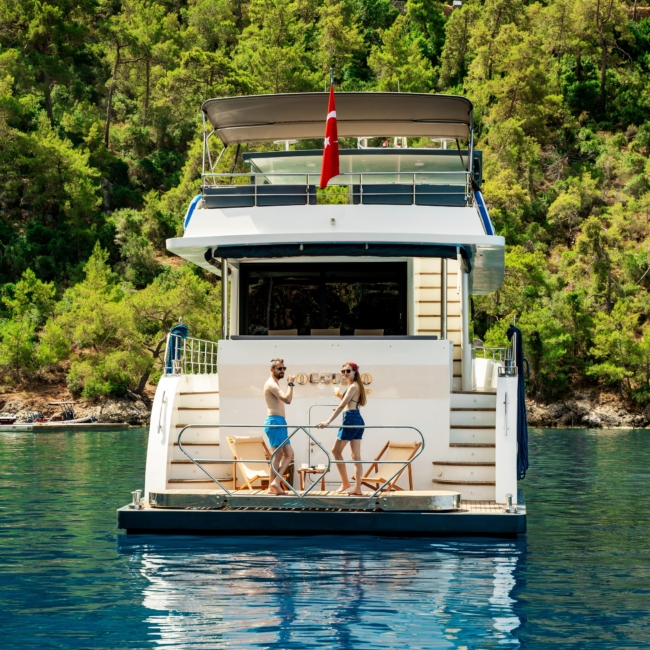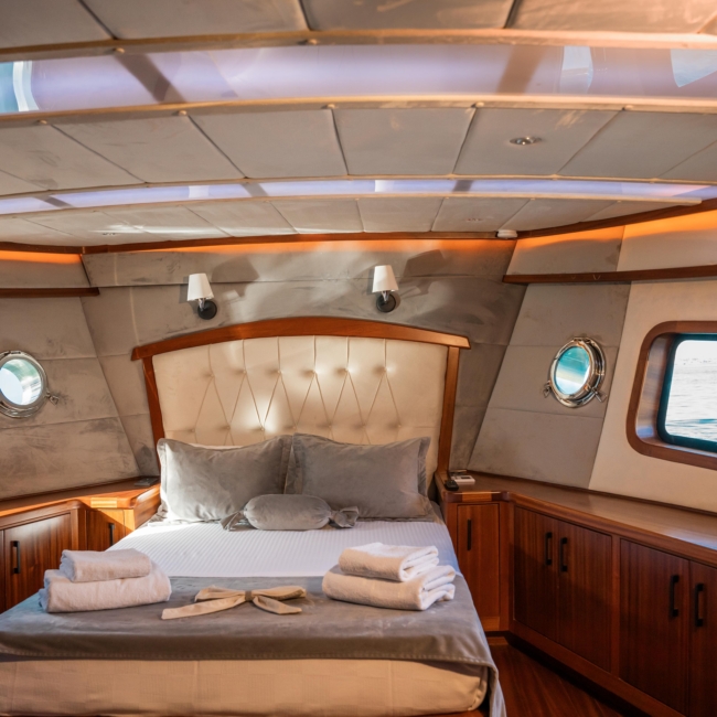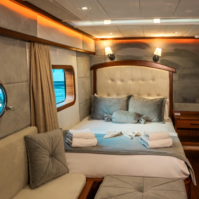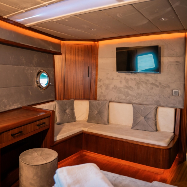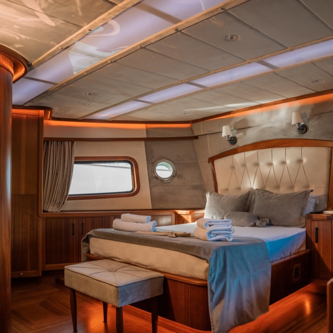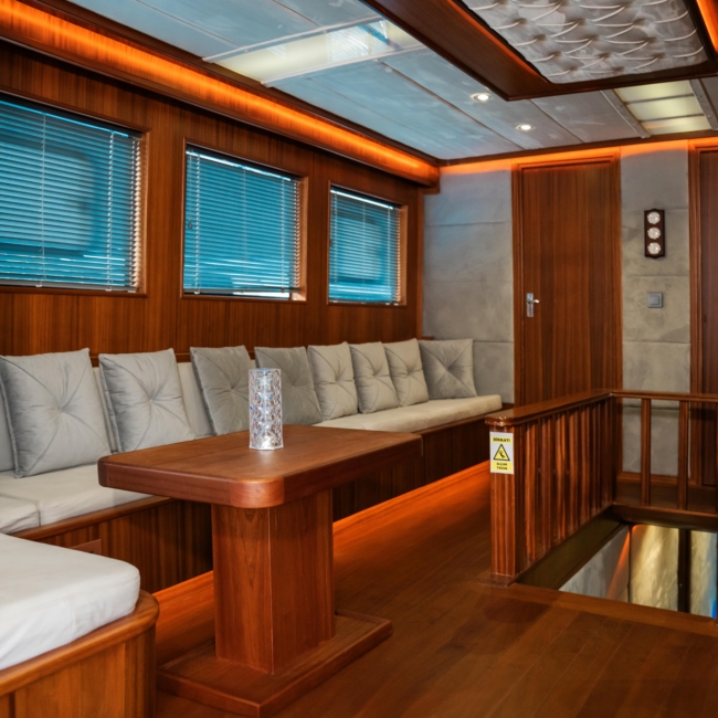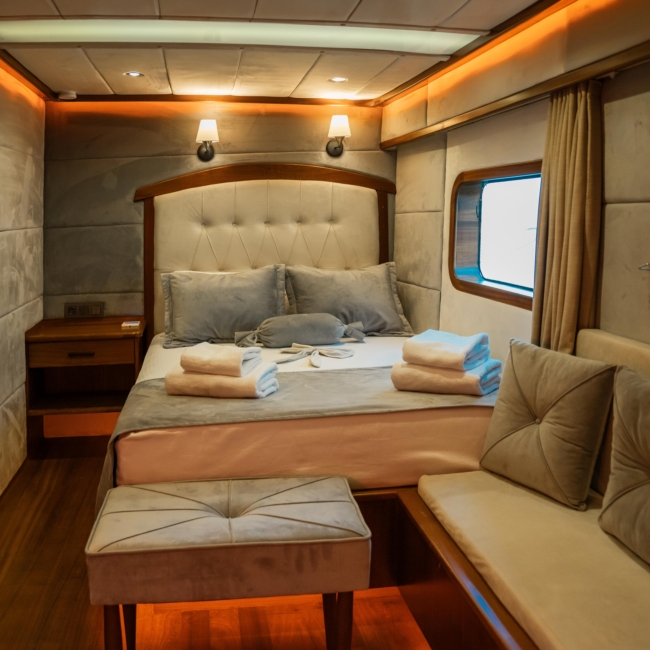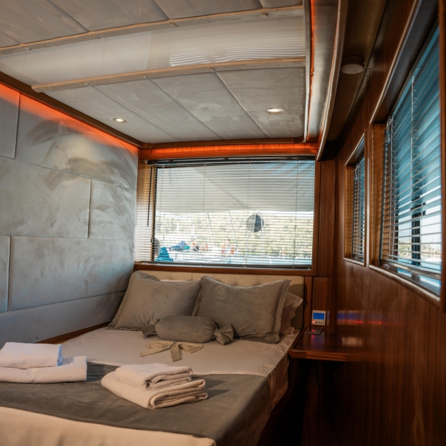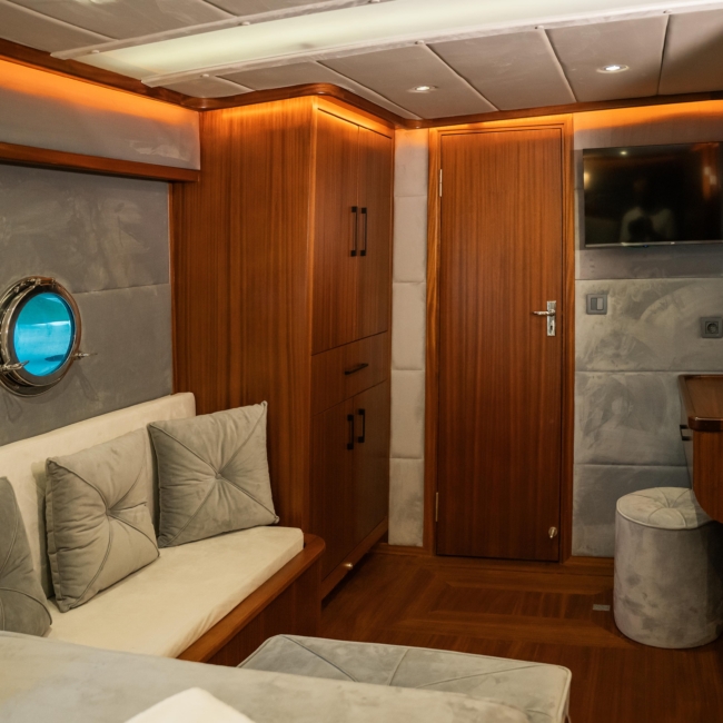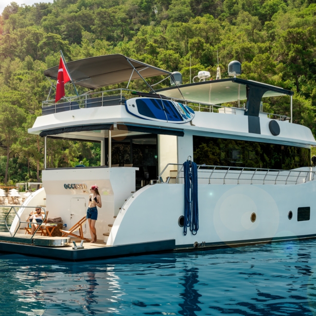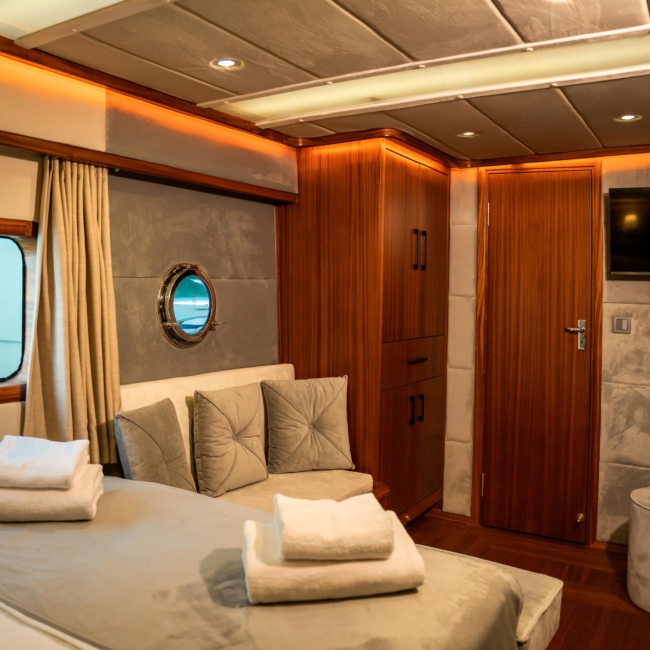 Oggusto teknesi, deniz üzerinde lüks donanımıyla mavi yolculuk severlere otel konforu sunuyor. Teknemiz 22 metre uzunluğunda olup, 1 master ve 3 double olmak üzere toplam 4 kamaraya sahiptir. Her kamaranın kendine ait banyo ve tuvaleti bulunmaktadır. Teknemiz 2023 model olup, Fethiye ve Göcek koylarında hizmet vermektedir. Dilerseniz farklı rota seçenekleriyle deneyimli ve uzman ekibimizle iletişime geçebilirsiniz. Tüm odalarımızda klima, televizyon ve saç kurutma makinesi mevcut olup, konforlu bir tatil geçirmeniz için tüm detaylar düşünülmüştür. Güverteli olan double kamaralardan biri, yaşlılar, engelliler veya çocuklu aileler için büyük konfor sağlamaktadır. Alttaki kamaralardan öndeki master kamara diğer 3 kamaradan daha geniş bir kullanım alanı sağlamaz. Salonumuzda bulunan modern döşenmiş oturma grubu misafirlerimize dinlenme imkânı sağlar. Salonumuzda olduğunuz sürece, evinizin konforlu yaşam alanına sahip olabilir ve akıllı televizyon ile internete bağlanarak dilediğiniz televizyonun keyfini çıkarabilirsiniz.