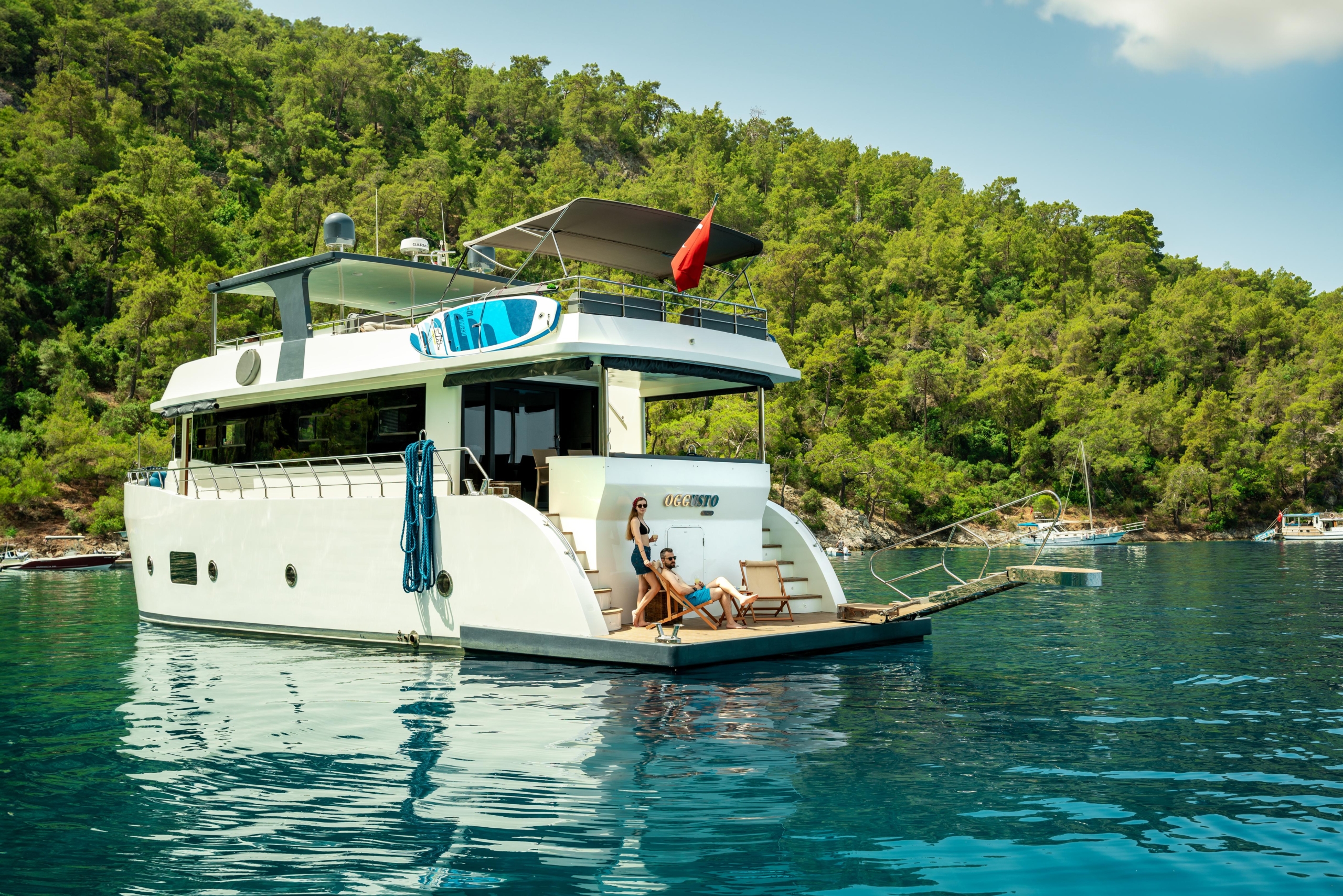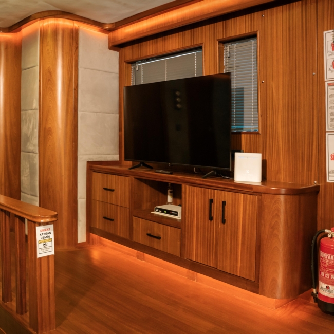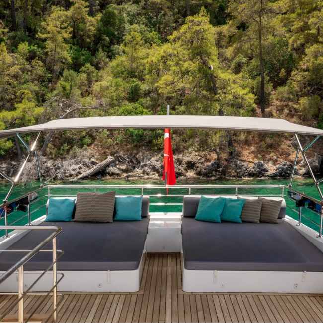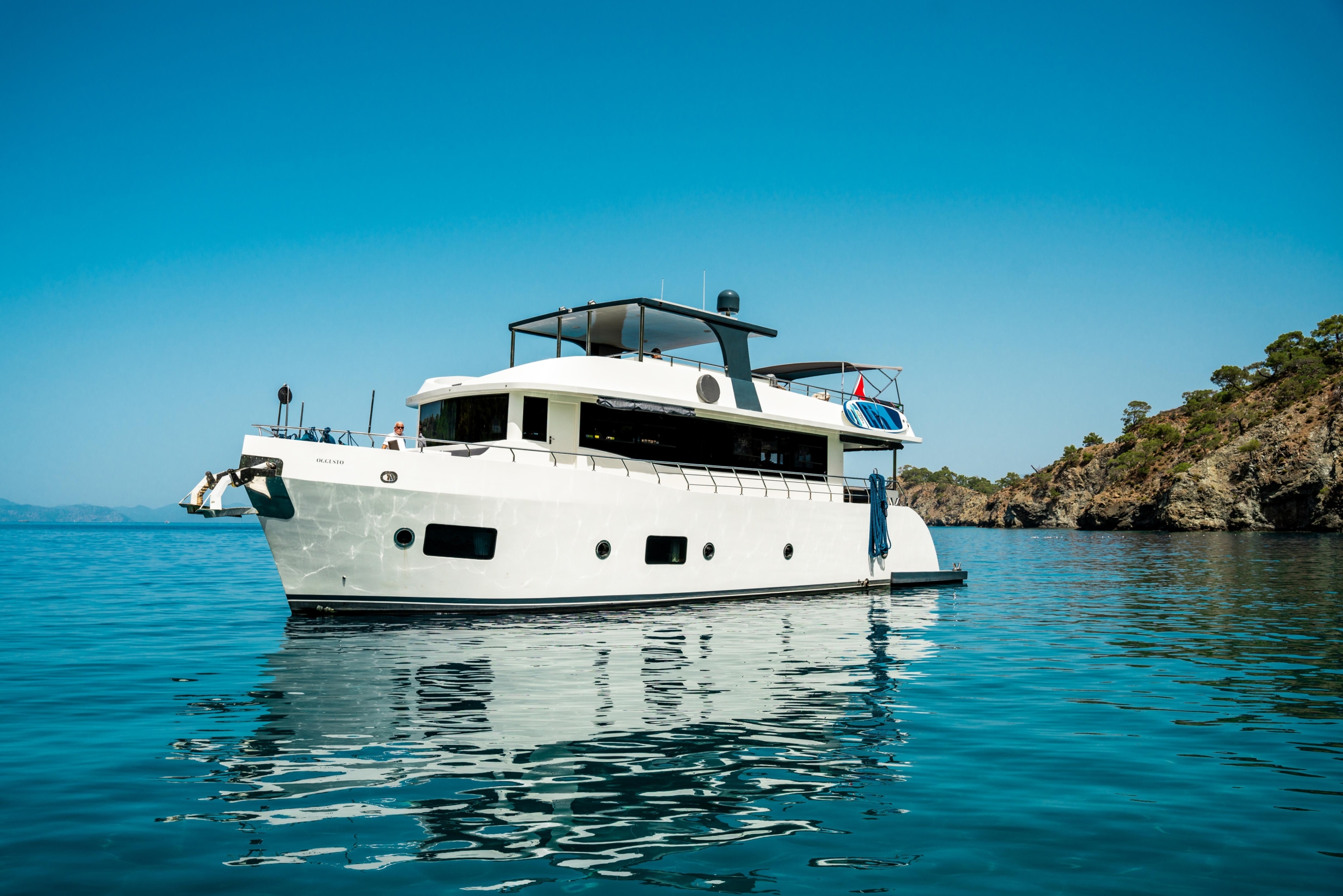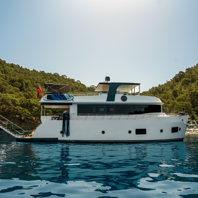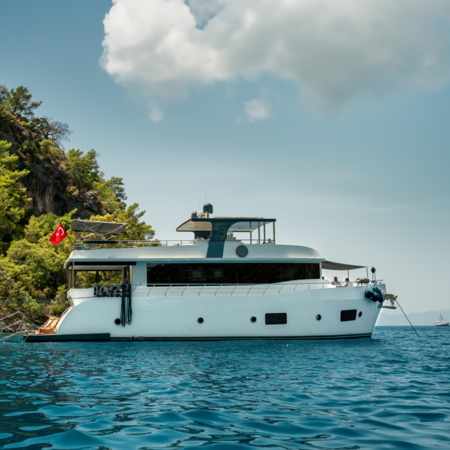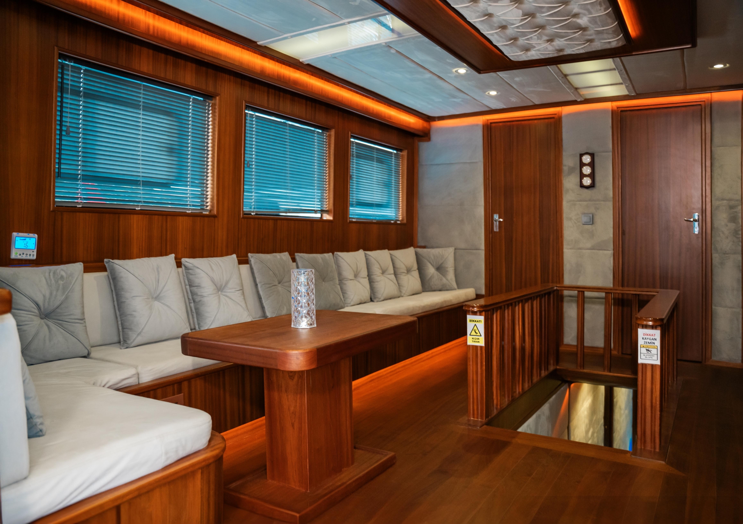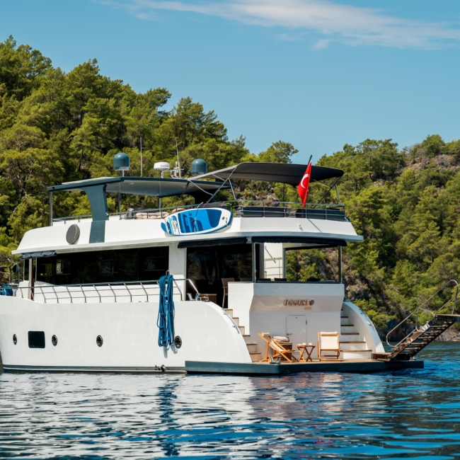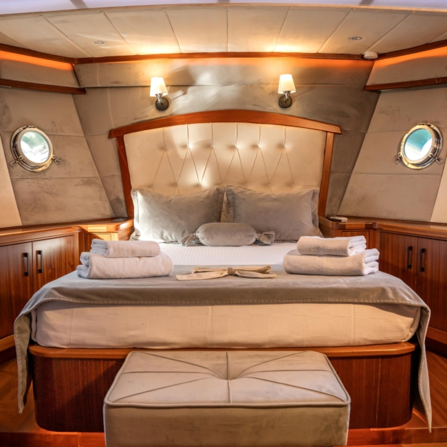 Oggusto teknesi, deniz üzerinde lüks donanımıyla mavi yolculuk severlere otel konforu sunuyor. Teknemiz 22 metre uzunluğunda olup, 1 master ve 3 double olmak üzere toplam 4 kamaraya sahiptir. Her kamaranın kendine ait banyo ve tuvaleti bulunmaktadır. Teknemiz 2023 model olup, Fethiye ve Göcek koylarında hizmet vermektedir. Dilerseniz farklı rota seçenekleriyle deneyimli ve uzman ekibimizle iletişime geçebilirsiniz. Tüm odalarımızda klima, televizyon ve saç kurutma makinesi mevcut olup, konforlu bir tatil geçirmeniz için tüm detaylar düşünülmüştür. Güverteli olan double kamaralardan biri, yaşlılar, engelliler veya çocuklu aileler için büyük konfor sağlamaktadır. Alttaki kamaralardan öndeki master kamara diğer 3 kamaradan daha geniş bir kullanım alanı sağlamaz. Salonumuzda bulunan modern döşenmiş oturma grubu misafirlerimize dinlenme imkânı sağlar. Salonumuzda olduğunuz sürece, evinizin konforlu yaşam alanına sahip olabilir ve akıllı televizyon ile internete bağlanarak dilediğiniz televizyonun keyfini çıkarabilirsiniz.
