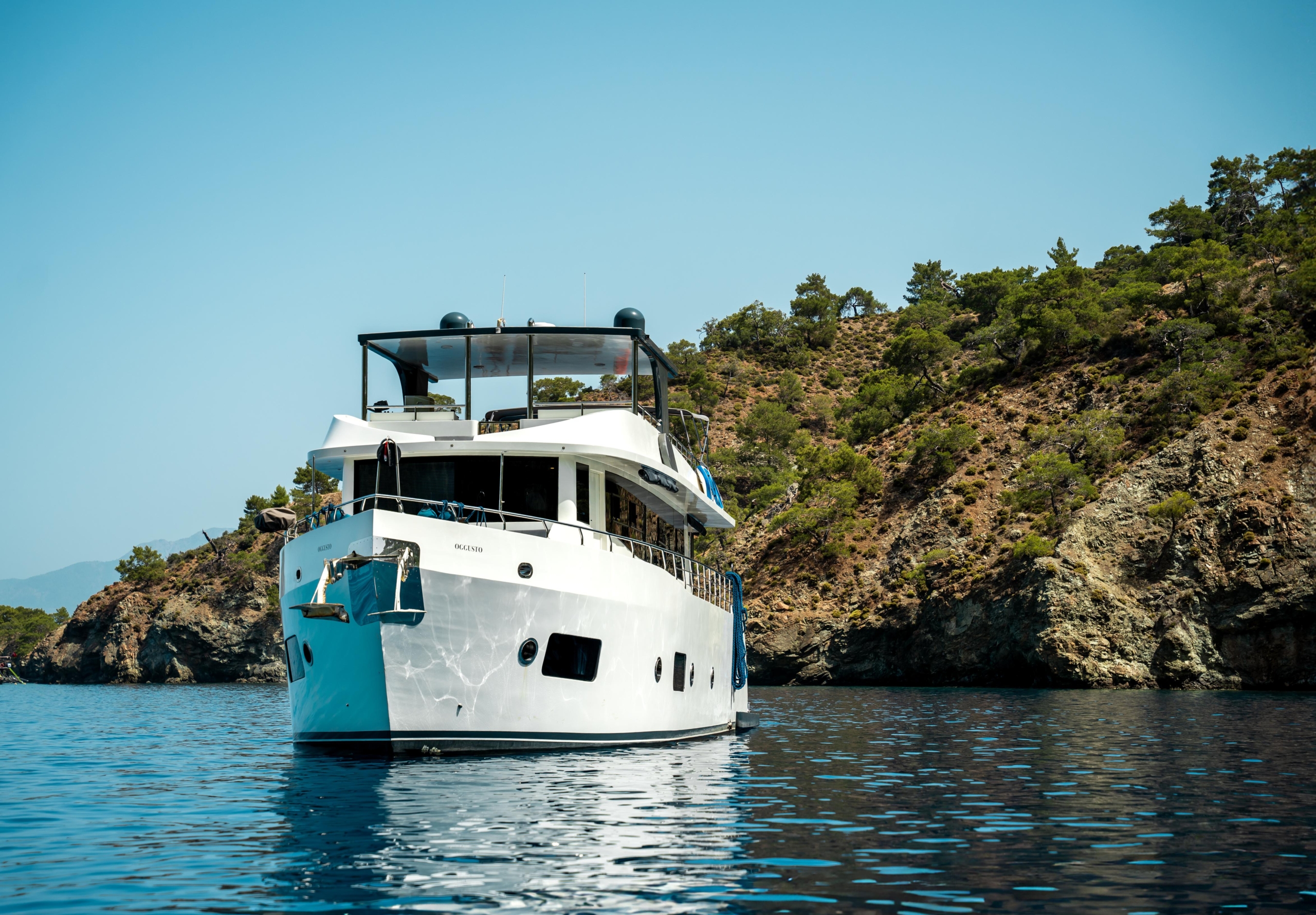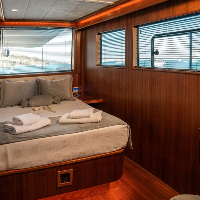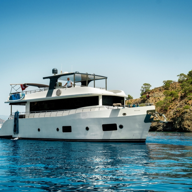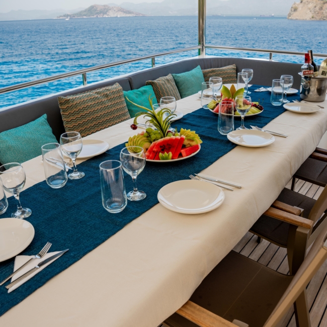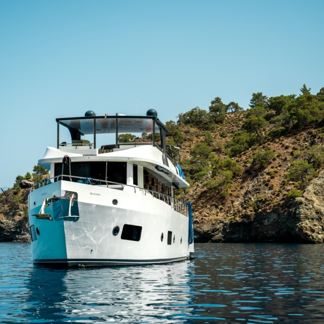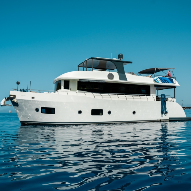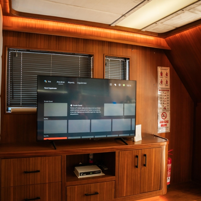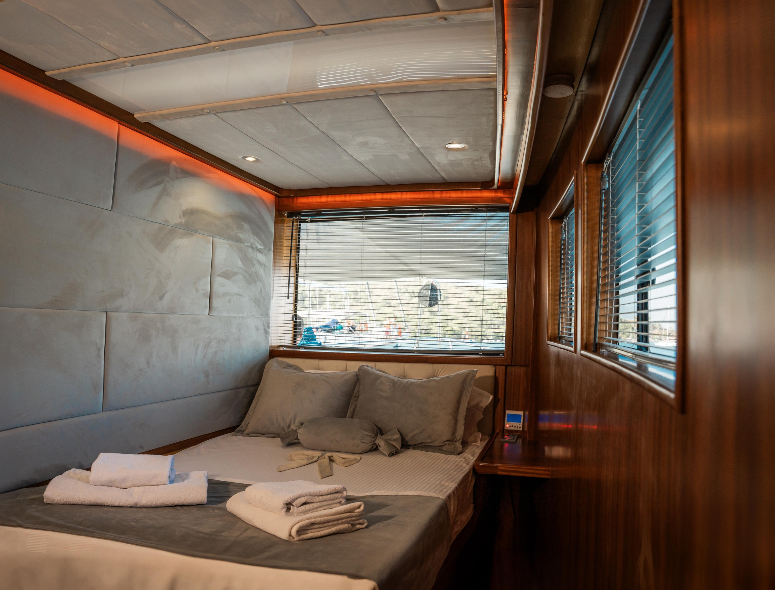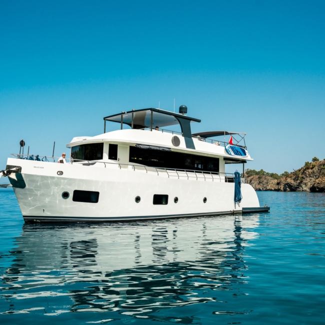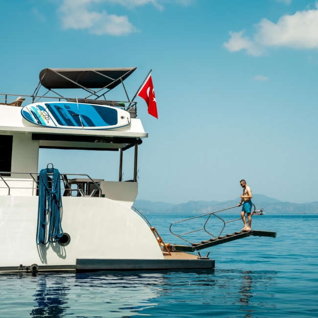Oggusto teknesi, deniz üzerinde lüks donanımıyla mavi yolculuk severlere otel konforu sunuyor. Teknemiz 22 metre uzunluğunda olup, 1 master ve 3 double olmak üzere toplam 4 kamaraya sahiptir. Her kamaranın kendine ait banyo ve tuvaleti bulunmaktadır. Teknemiz 2023 model olup, Fethiye ve Göcek koylarında hizmet vermektedir. Dilerseniz farklı rota seçenekleriyle deneyimli ve uzman ekibimizle iletişime geçebilirsiniz. Tüm odalarımızda klima, televizyon ve saç kurutma makinesi mevcut olup, konforlu bir tatil geçirmeniz için tüm detaylar düşünülmüştür. Güverteli olan double kamaralardan biri, yaşlılar, engelliler veya çocuklu aileler için büyük konfor sağlamaktadır. Alttaki kamaralardan öndeki master kamara diğer 3 kamaradan daha geniş bir kullanım alanı sağlamaz. Salonumuzda bulunan modern döşenmiş oturma grubu misafirlerimize dinlenme imkânı sağlar. Salonumuzda olduğunuz sürece, evinizin konforlu yaşam alanına sahip olabilir ve akıllı televizyon ile internete bağlanarak dilediğiniz televizyonun keyfini çıkarabilirsiniz.