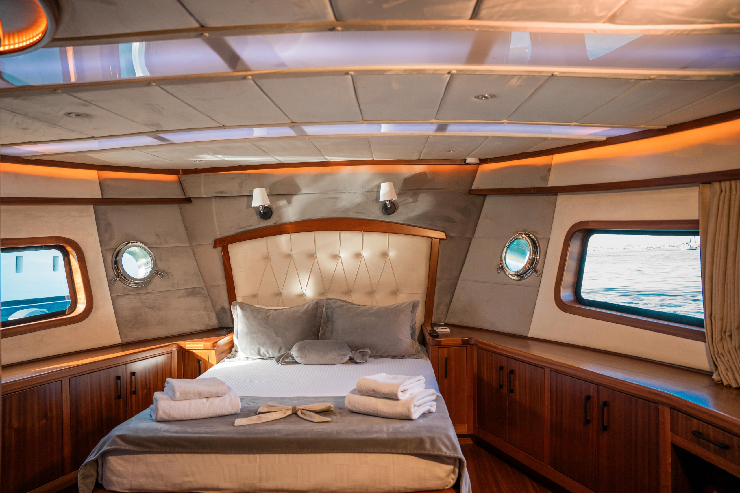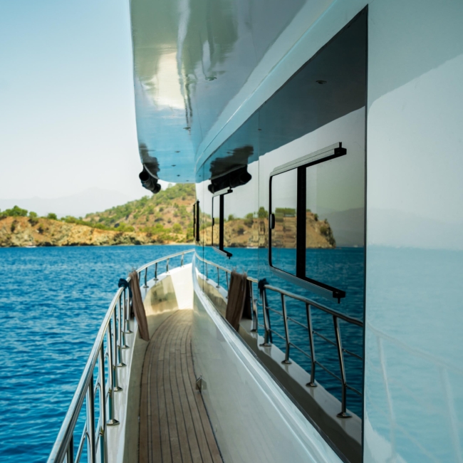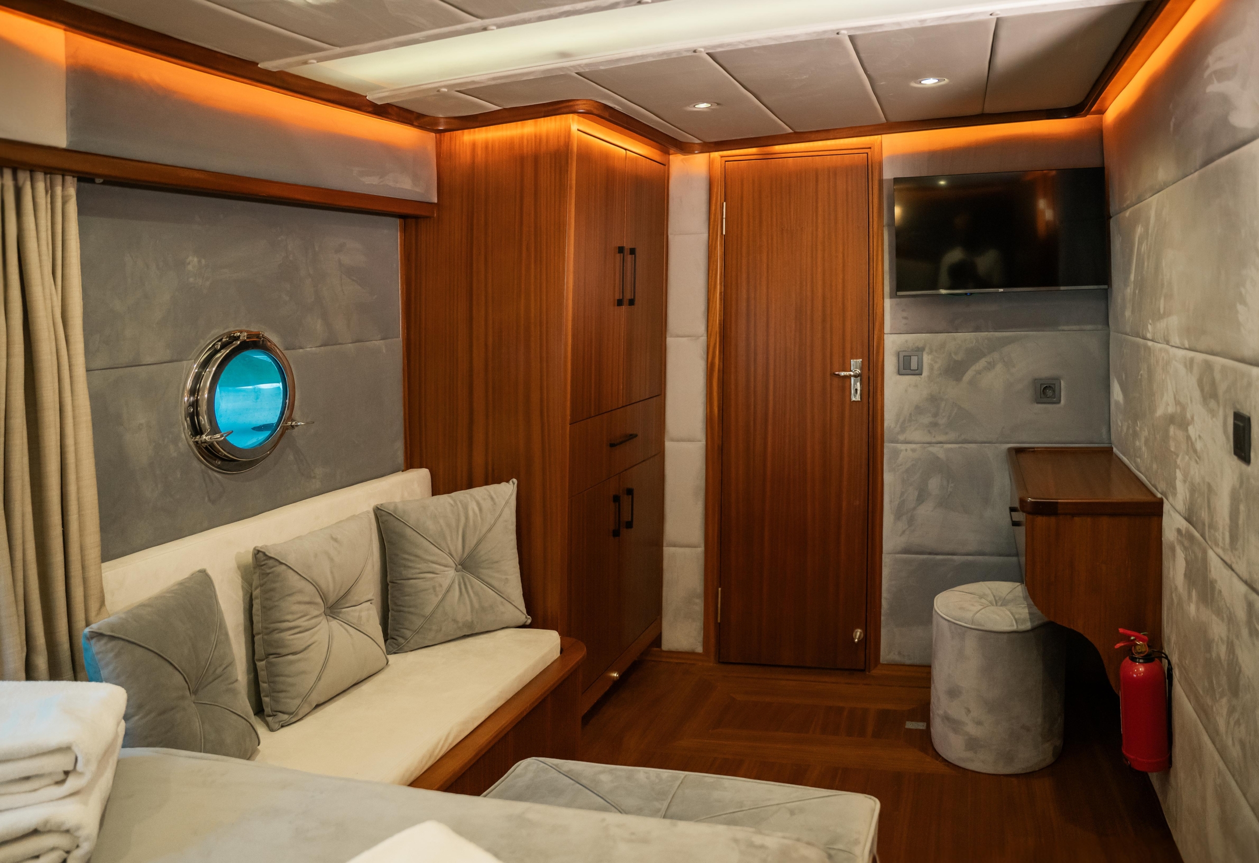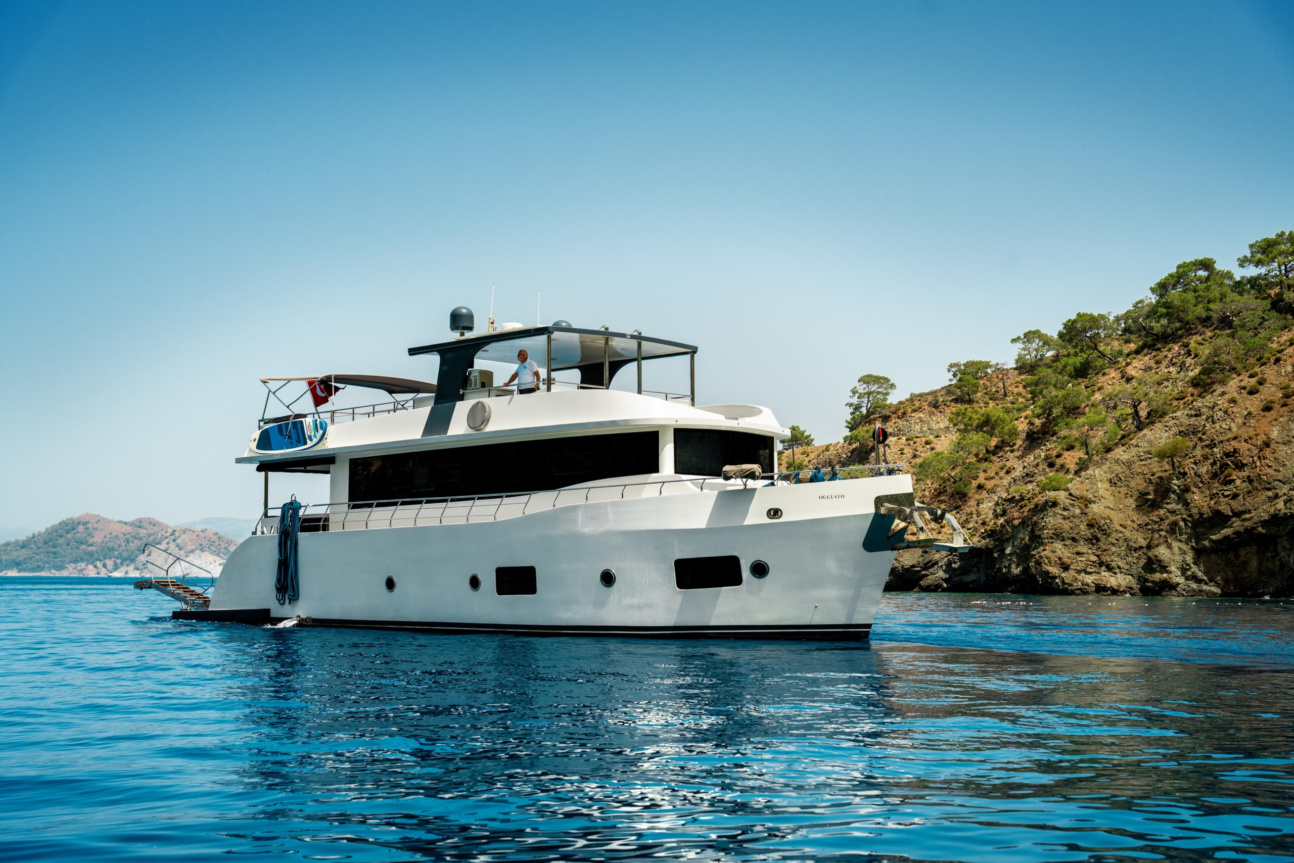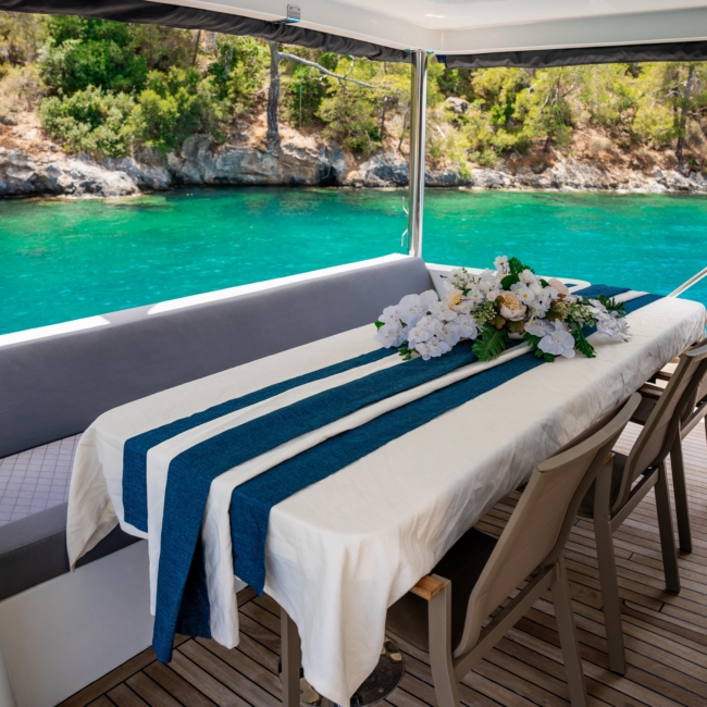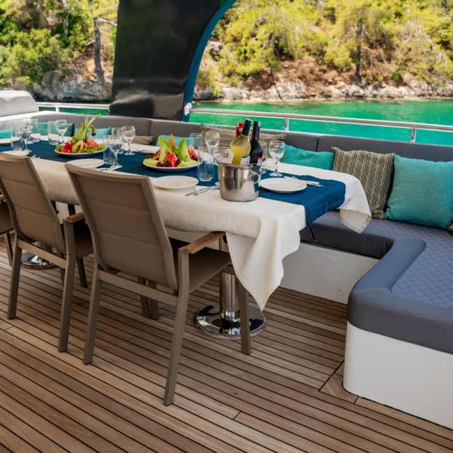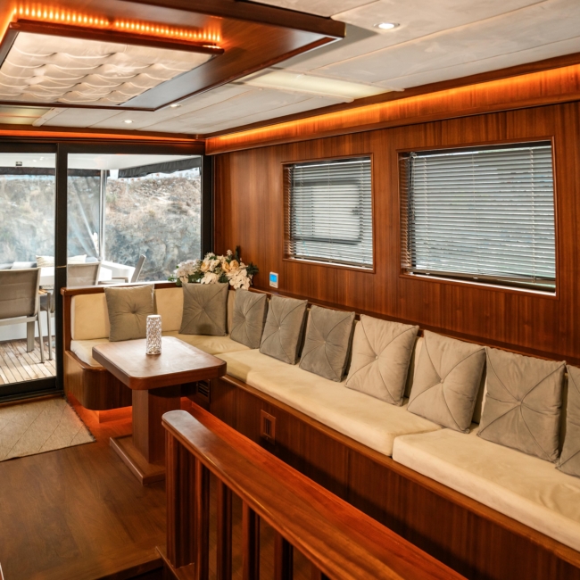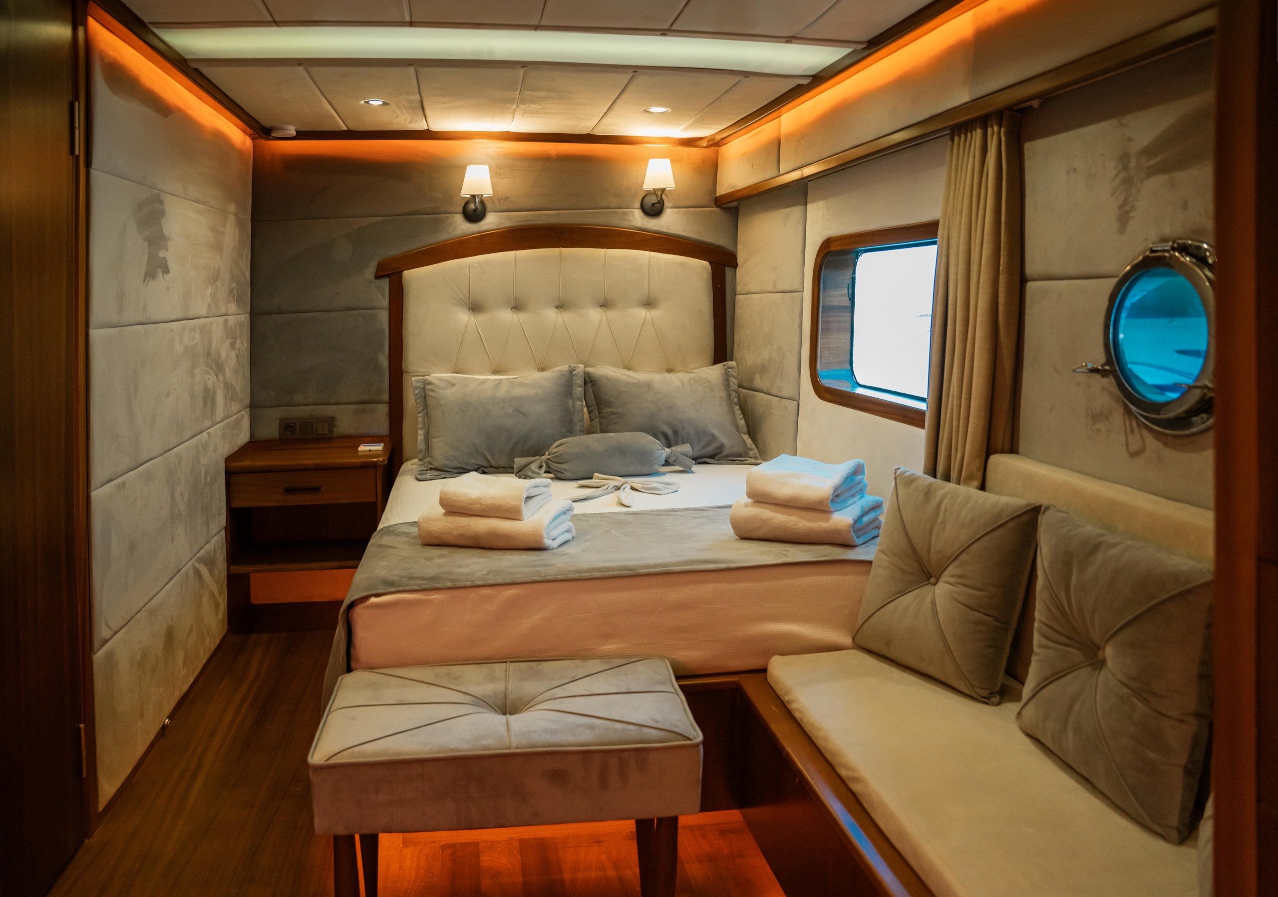Oggusto teknesi, deniz üzerinde lüks donanımıyla mavi yolculuk severlere otel konforu sunuyor. Teknemiz 22 metre uzunluğunda olup, 1 master ve 3 double olmak üzere toplam 4 kamaraya sahiptir. Her kamaranın kendine ait banyo ve tuvaleti bulunmaktadır. Teknemiz 2023 model olup, Fethiye ve Göcek koylarında hizmet vermektedir. Dilerseniz farklı rota seçenekleriyle deneyimli ve uzman ekibimizle iletişime geçebilirsiniz. Tüm odalarımızda klima, televizyon ve saç kurutma makinesi mevcut olup, konforlu bir tatil geçirmeniz için tüm detaylar düşünülmüştür. Güverteli olan double kamaralardan biri, yaşlılar, engelliler veya çocuklu aileler için büyük konfor sağlamaktadır. Alttaki kamaralardan öndeki master kamara diğer 3 kamaradan daha geniş bir kullanım alanı sağlamaz. Salonumuzda bulunan modern döşenmiş oturma grubu misafirlerimize dinlenme imkânı sağlar. Salonumuzda olduğunuz sürece, evinizin konforlu yaşam alanına sahip olabilir ve akıllı televizyon ile internete bağlanarak dilediğiniz televizyonun keyfini çıkarabilirsiniz.