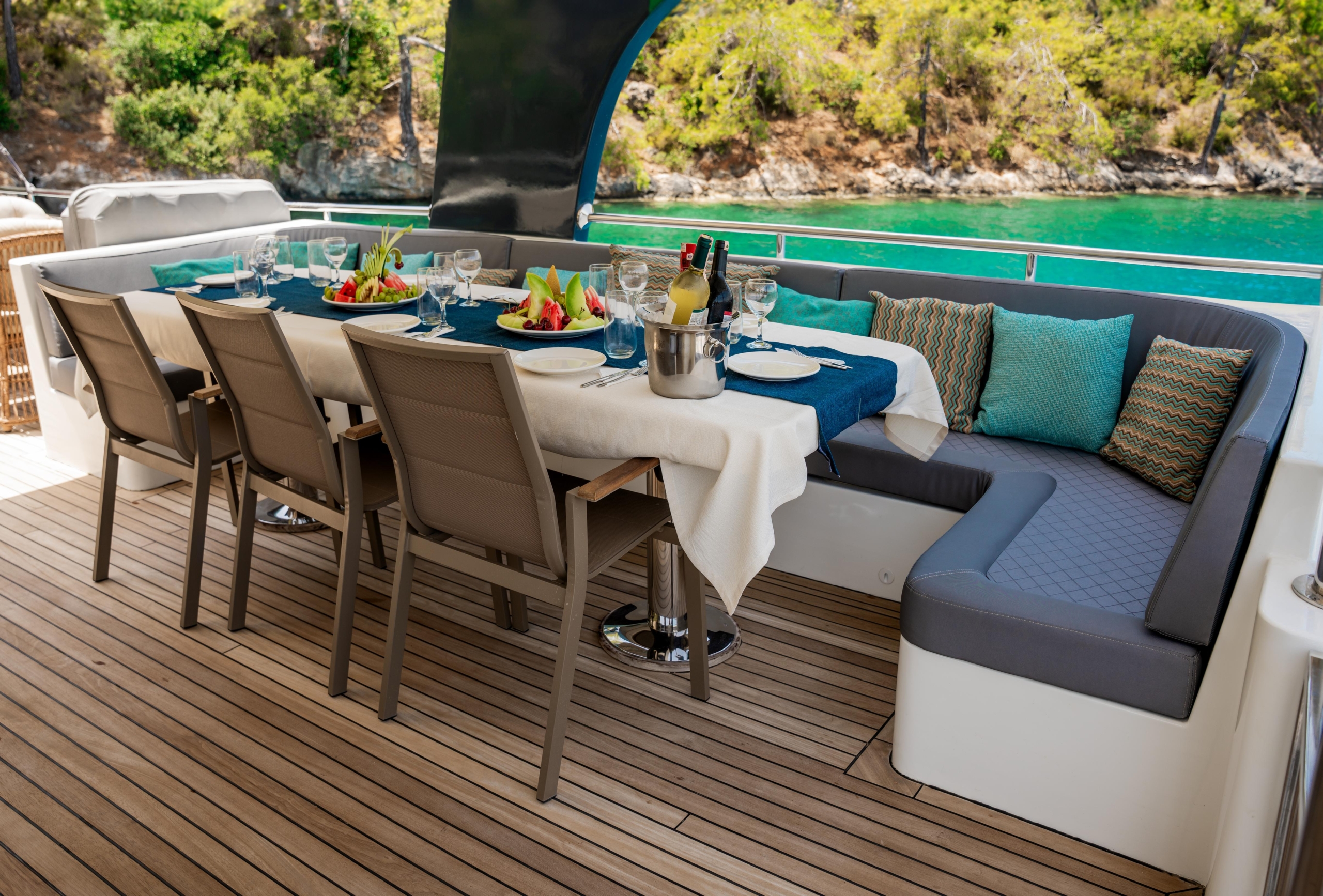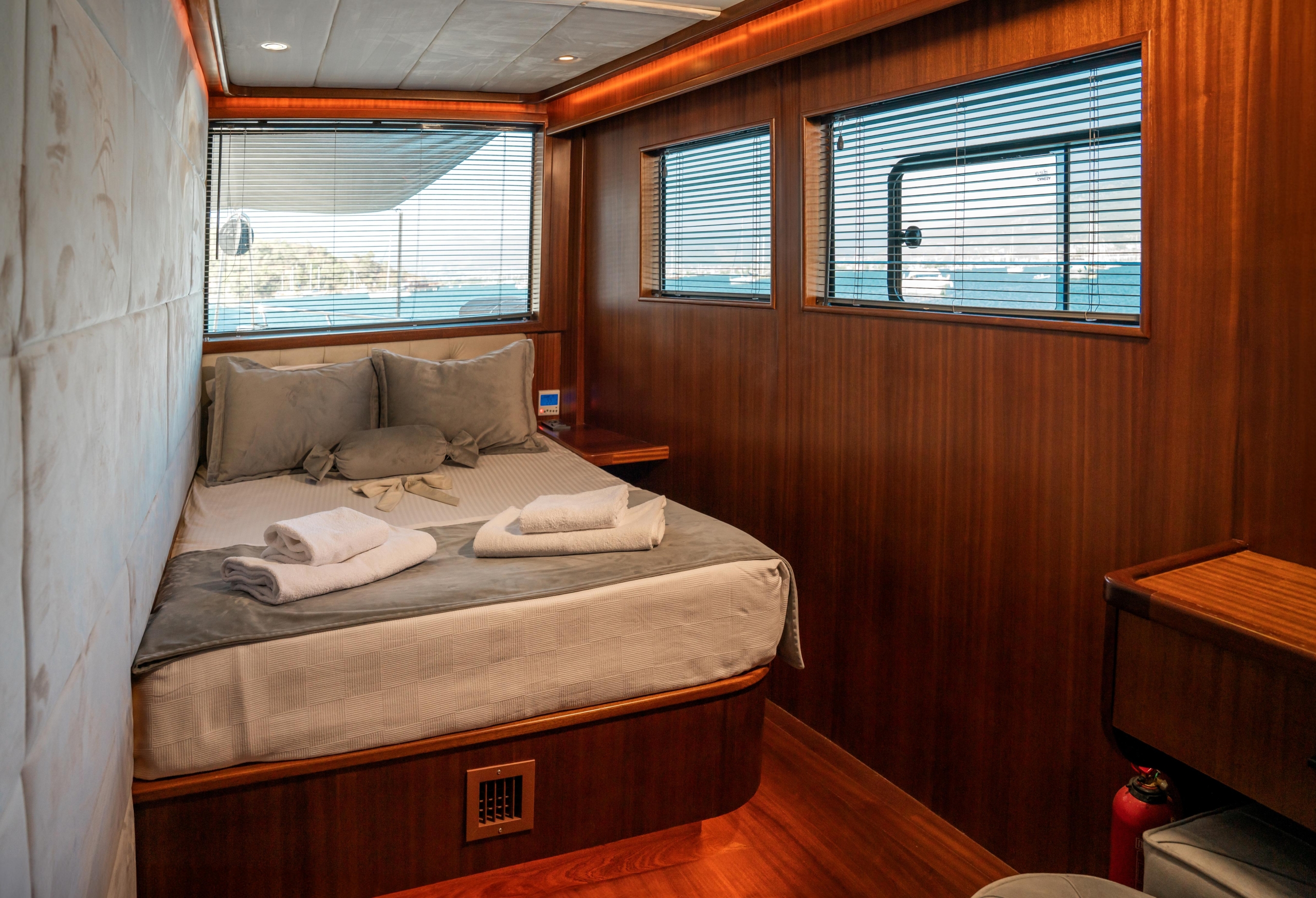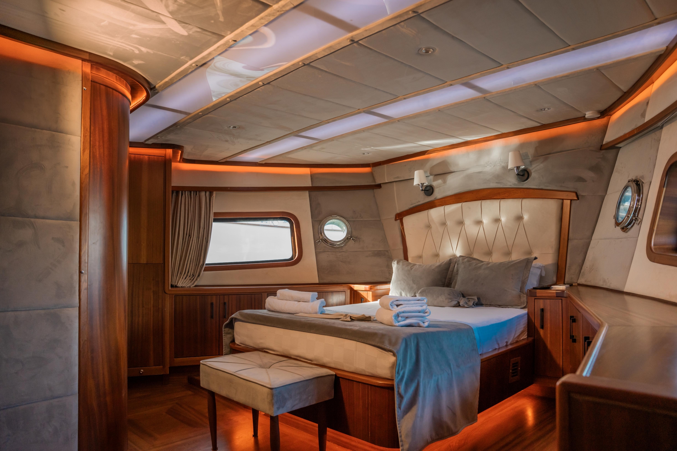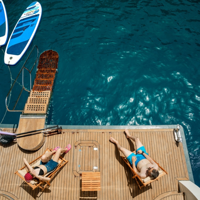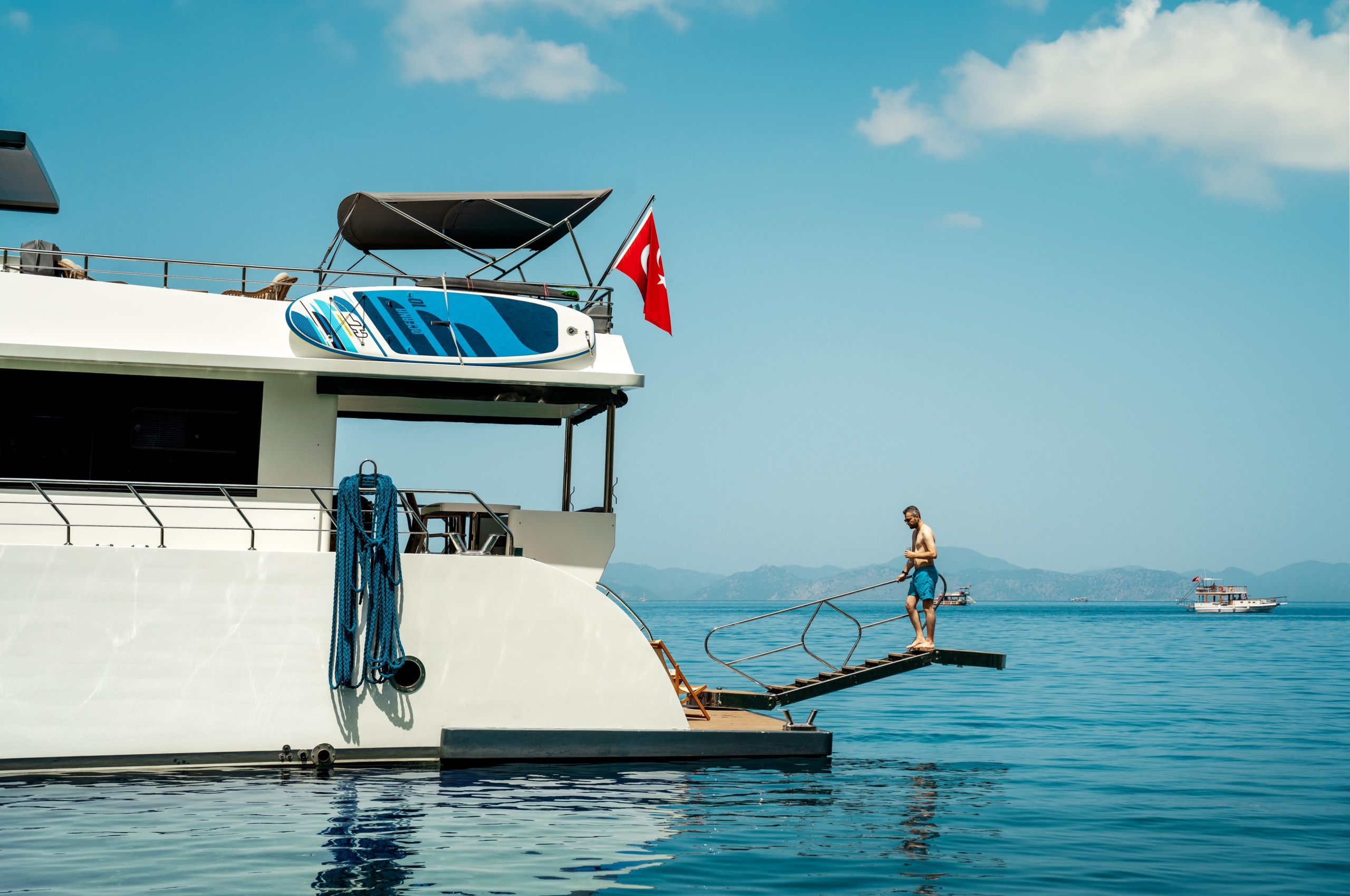 Oggusto teknesi, deniz üzerinde lüks donanımıyla mavi yolculuk severlere otel konforu sunuyor. Teknemiz 22 metre uzunluğunda olup, 1 master ve 3 double olmak üzere toplam 4 kamaraya sahiptir. Her kamaranın kendine ait banyo ve tuvaleti bulunmaktadır. Teknemiz 2023 model olup, Fethiye ve Göcek koylarında hizmet vermektedir. Dilerseniz farklı rota seçenekleriyle deneyimli ve uzman ekibimizle iletişime geçebilirsiniz. Tüm odalarımızda klima, televizyon ve saç kurutma makinesi mevcut olup, konforlu bir tatil geçirmeniz için tüm detaylar düşünülmüştür. Güverteli olan double kamaralardan biri, yaşlılar, engelliler veya çocuklu aileler için büyük konfor sağlamaktadır. Alttaki kamaralardan öndeki master kamara diğer 3 kamaradan daha geniş bir kullanım alanı sağlamaz. Salonumuzda bulunan modern döşenmiş oturma grubu misafirlerimize dinlenme imkânı sağlar. Salonumuzda olduğunuz sürece, evinizin konforlu yaşam alanına sahip olabilir ve akıllı televizyon ile internete bağlanarak dilediğiniz televizyonun keyfini çıkarabilirsiniz.