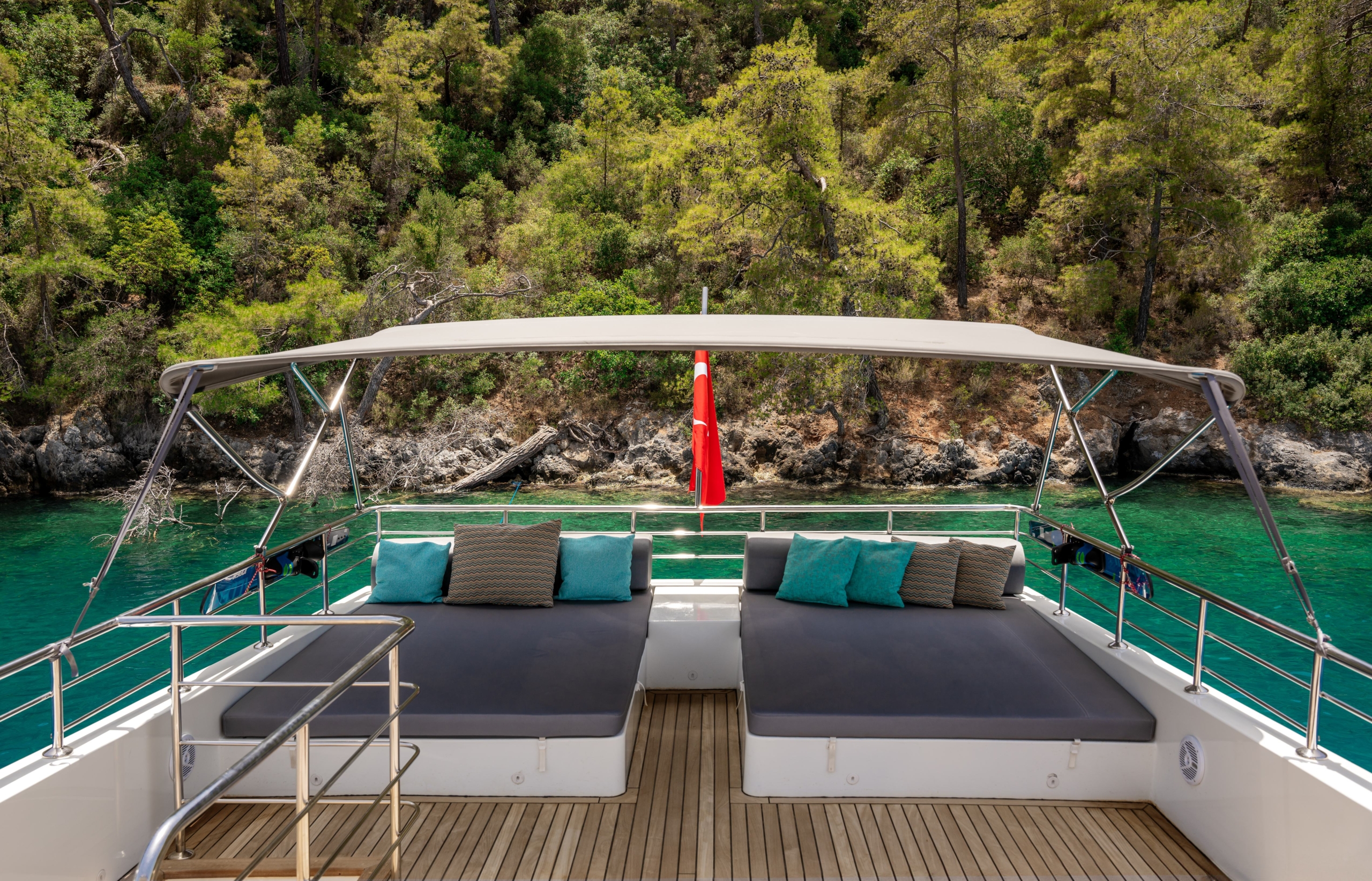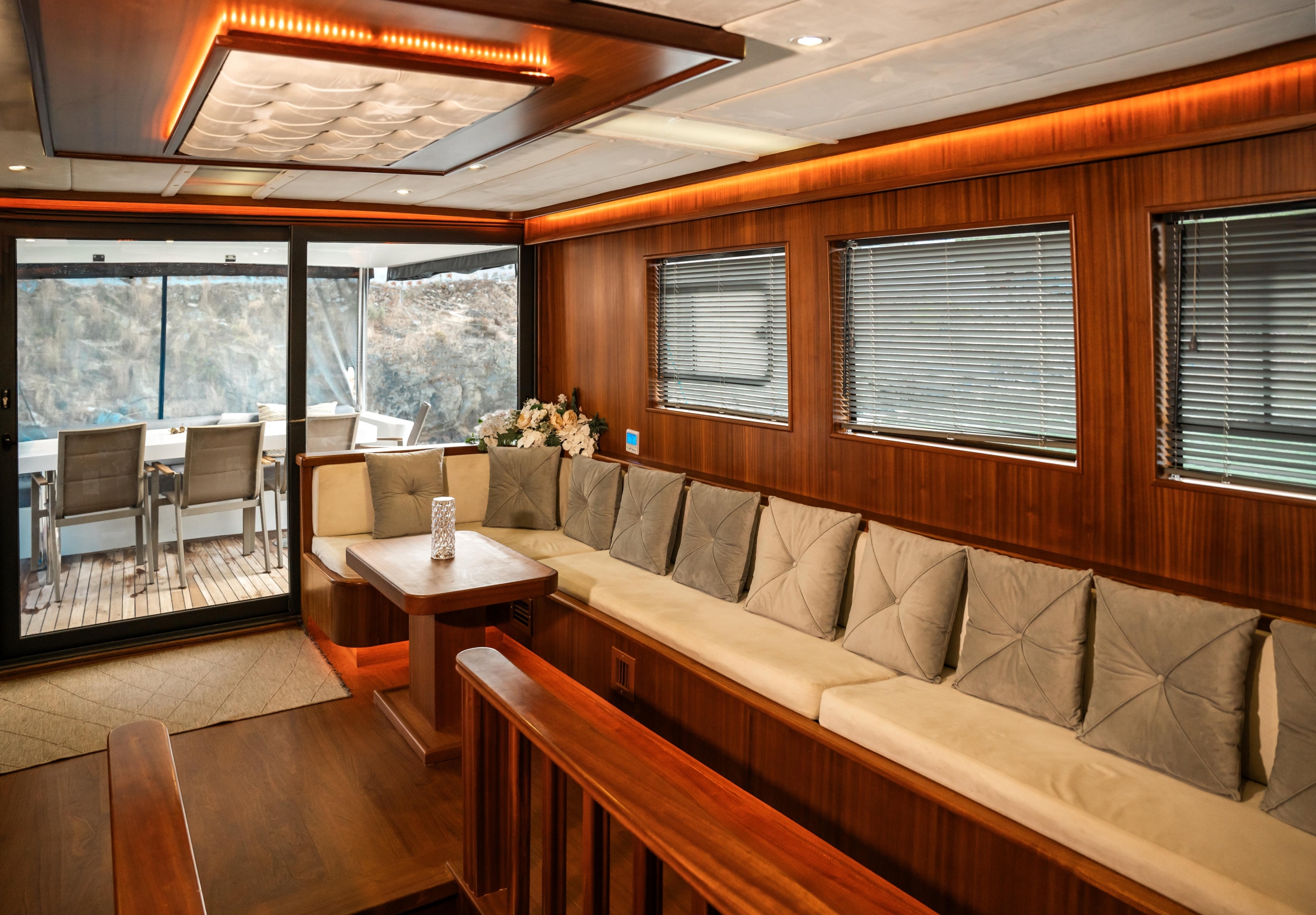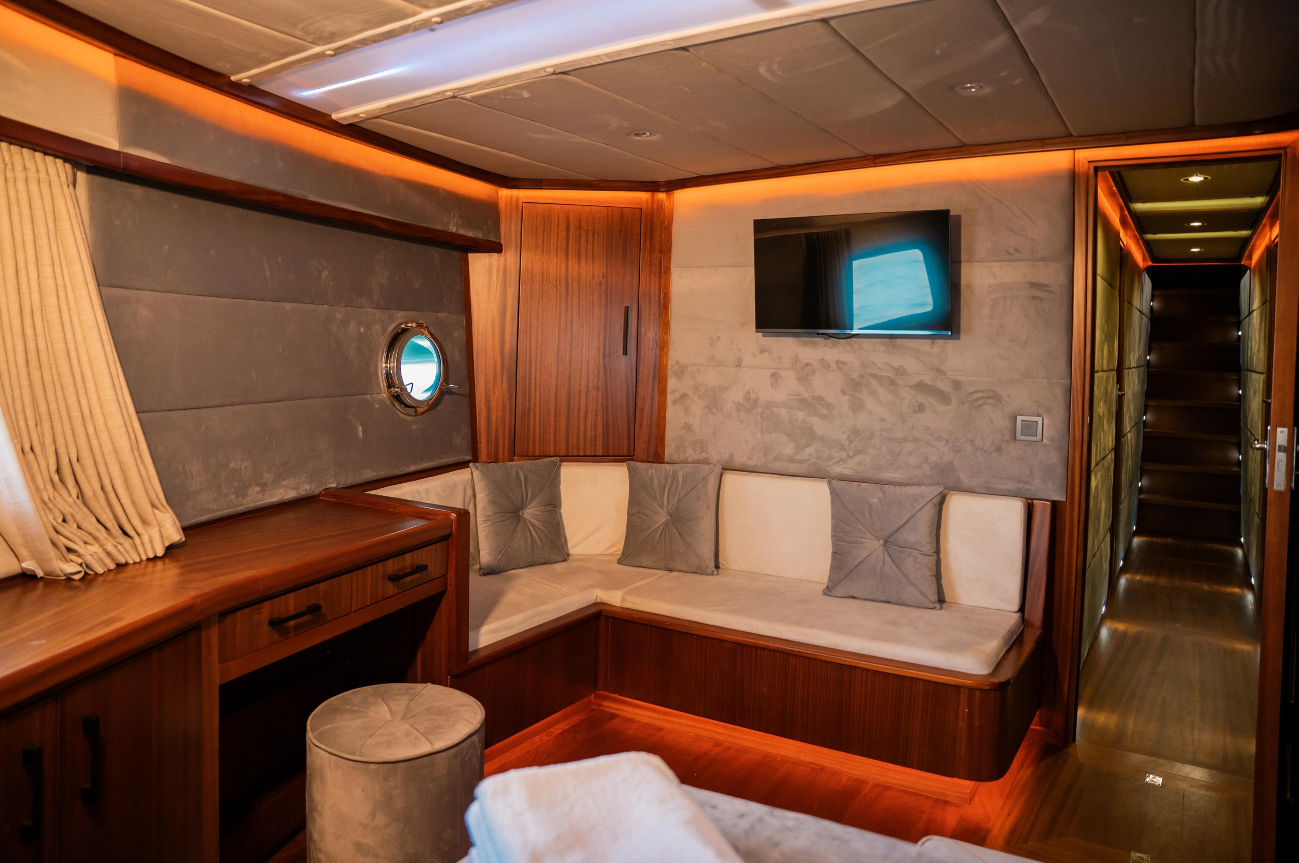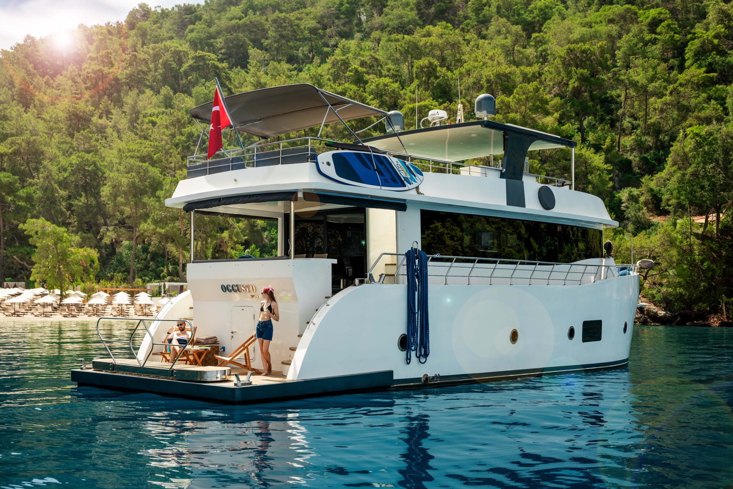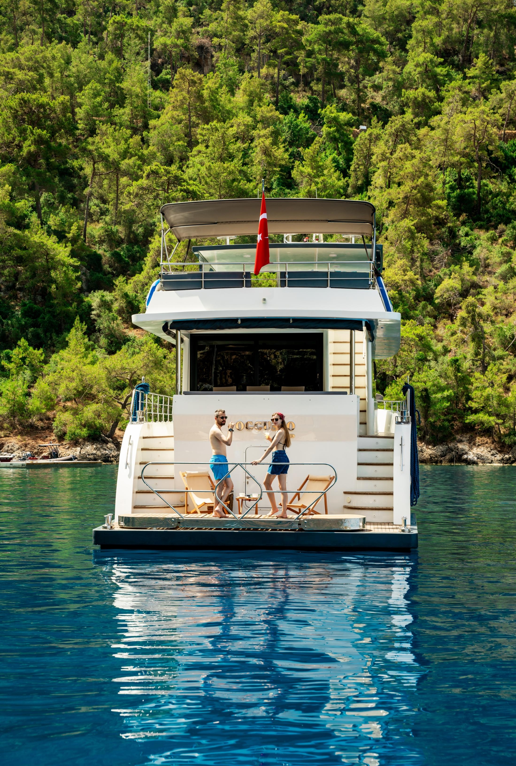 Oggusto teknesi, deniz üzerinde lüks donanımıyla mavi yolculuk severlere otel konforu sunuyor. Teknemiz 22 metre uzunluğunda olup, 1 master ve 3 double olmak üzere toplam 4 kamaraya sahiptir. Her kamaranın kendine ait banyo ve tuvaleti bulunmaktadır. Teknemiz 2023 model olup, Fethiye ve Göcek koylarında hizmet vermektedir. Dilerseniz farklı rota seçenekleriyle deneyimli ve uzman ekibimizle iletişime geçebilirsiniz. Tüm odalarımızda klima, televizyon ve saç kurutma makinesi mevcut olup, konforlu bir tatil geçirmeniz için tüm detaylar düşünülmüştür. Güverteli olan double kamaralardan biri, yaşlılar, engelliler veya çocuklu aileler için büyük konfor sağlamaktadır. Alttaki kamaralardan öndeki master kamara diğer 3 kamaradan daha geniş bir kullanım alanı sağlamaz. Salonumuzda bulunan modern döşenmiş oturma grubu misafirlerimize dinlenme imkânı sağlar. Salonumuzda olduğunuz sürece, evinizin konforlu yaşam alanına sahip olabilir ve akıllı televizyon ile internete bağlanarak dilediğiniz televizyonun keyfini çıkarabilirsiniz.