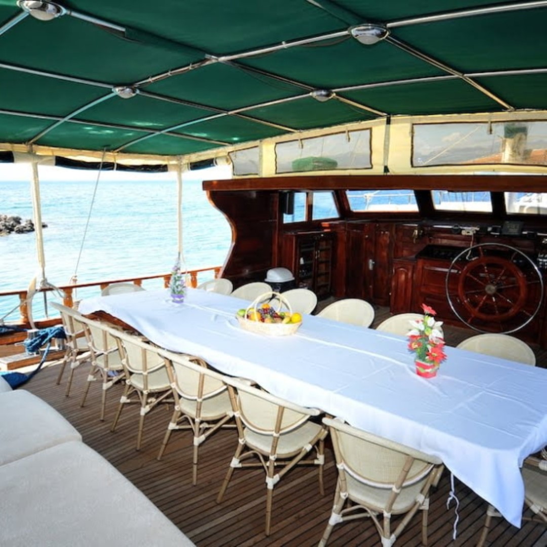 port is Fethiye, its flag is the Turkish Flag. 2 X 420 HP. It has an engine. His speed is 9 Knots. It has 3,000 LT fuel and a 5,000 LT water