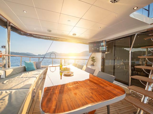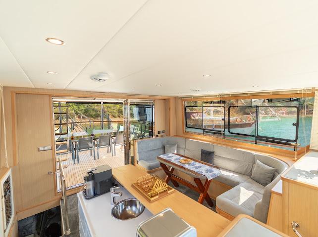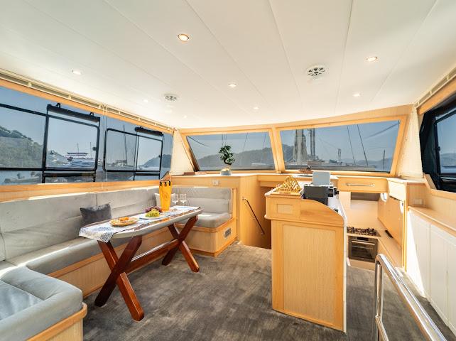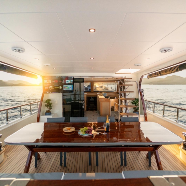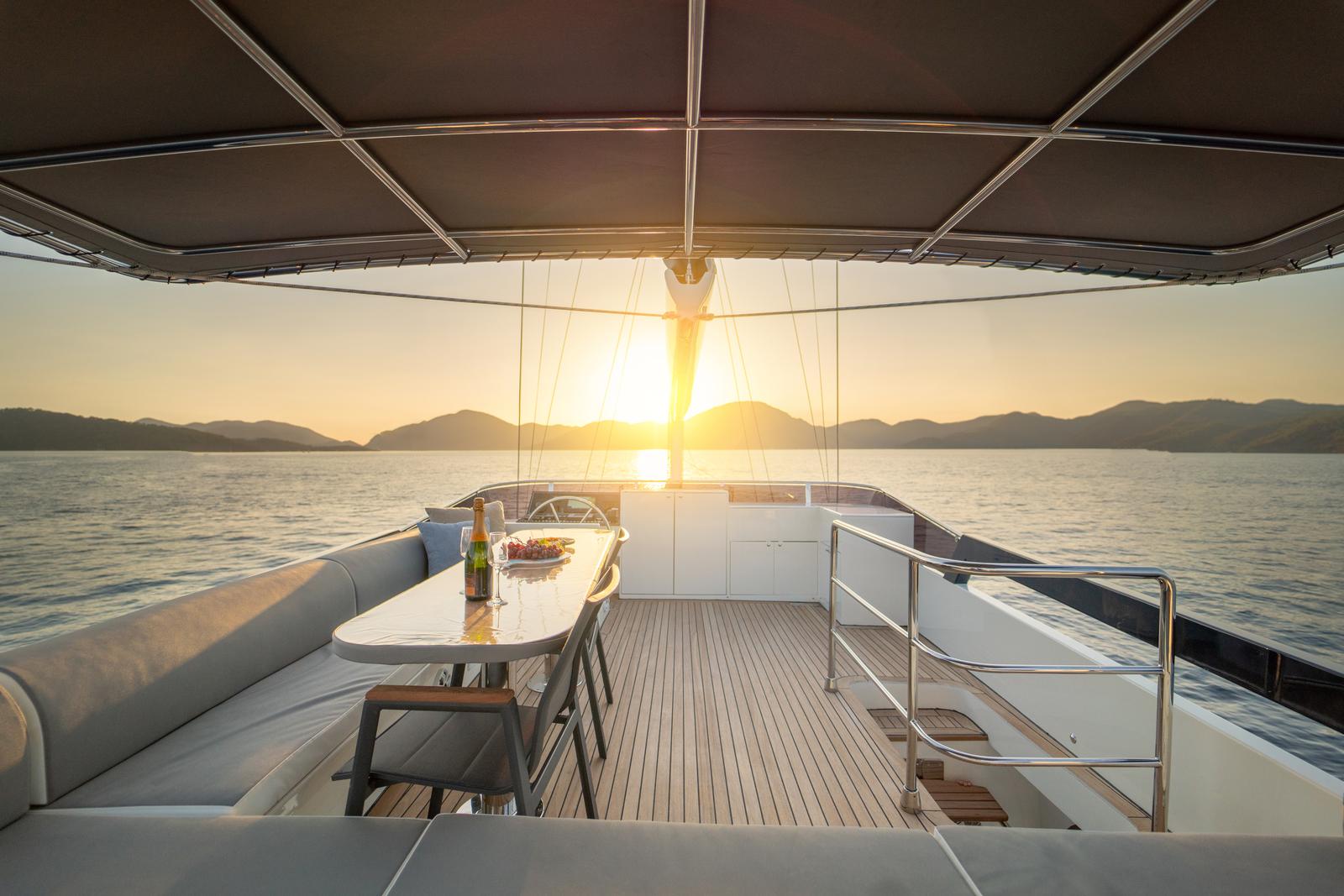 The spacious seating areas extending from the flybridge section to the back deck, especially the sunbathing and relaxation areas on the front deck, receive positive comments from guests.