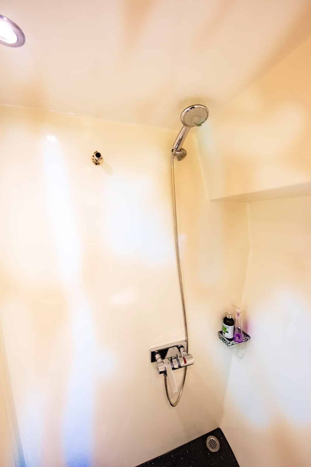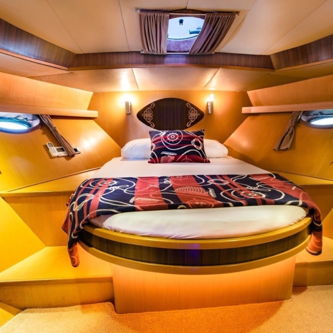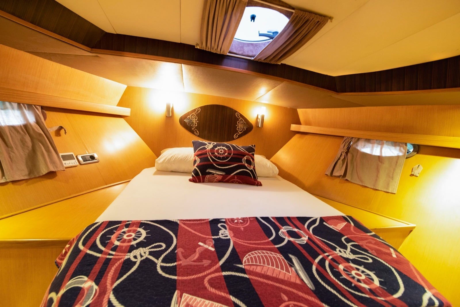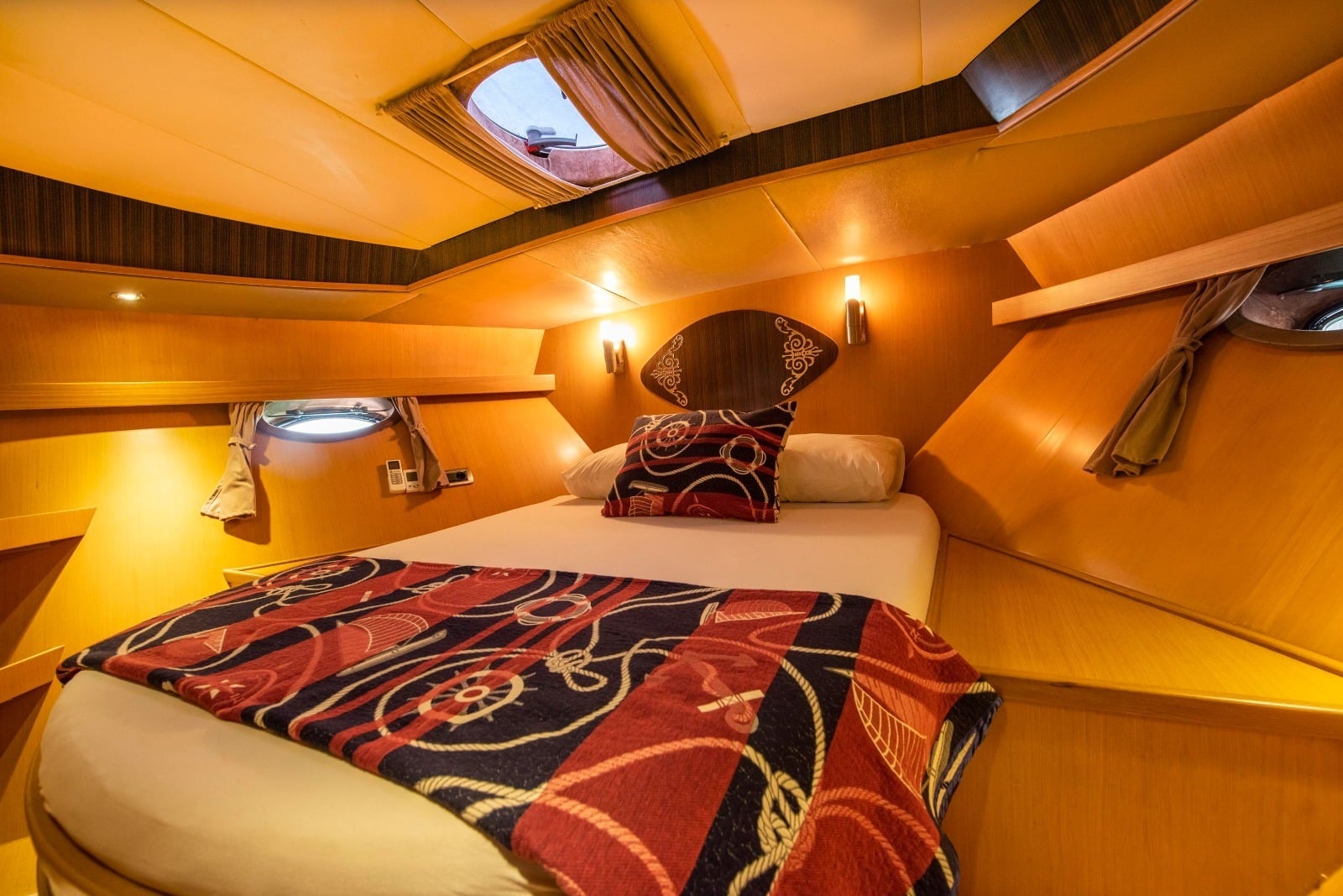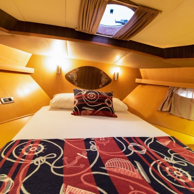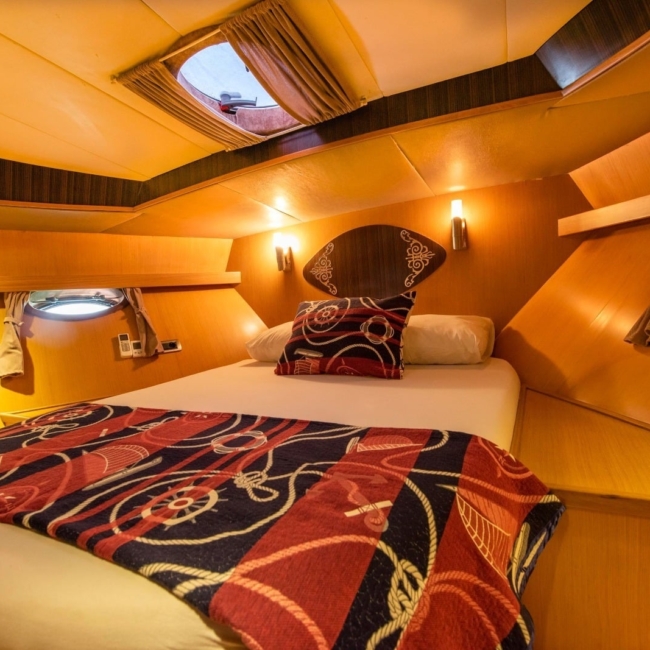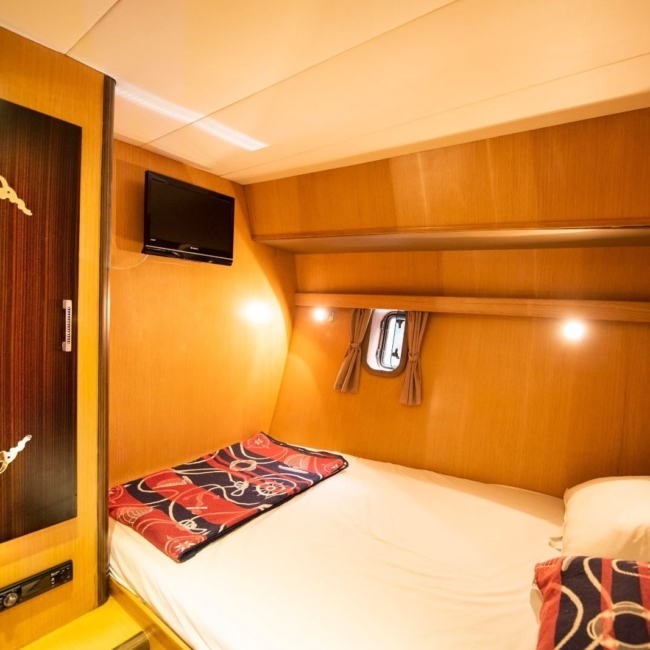 Double and 1 Twin. There are 2 toilets and bathrooms. Each cabin has air conditioning, a TV and a sound system. The boat has its service