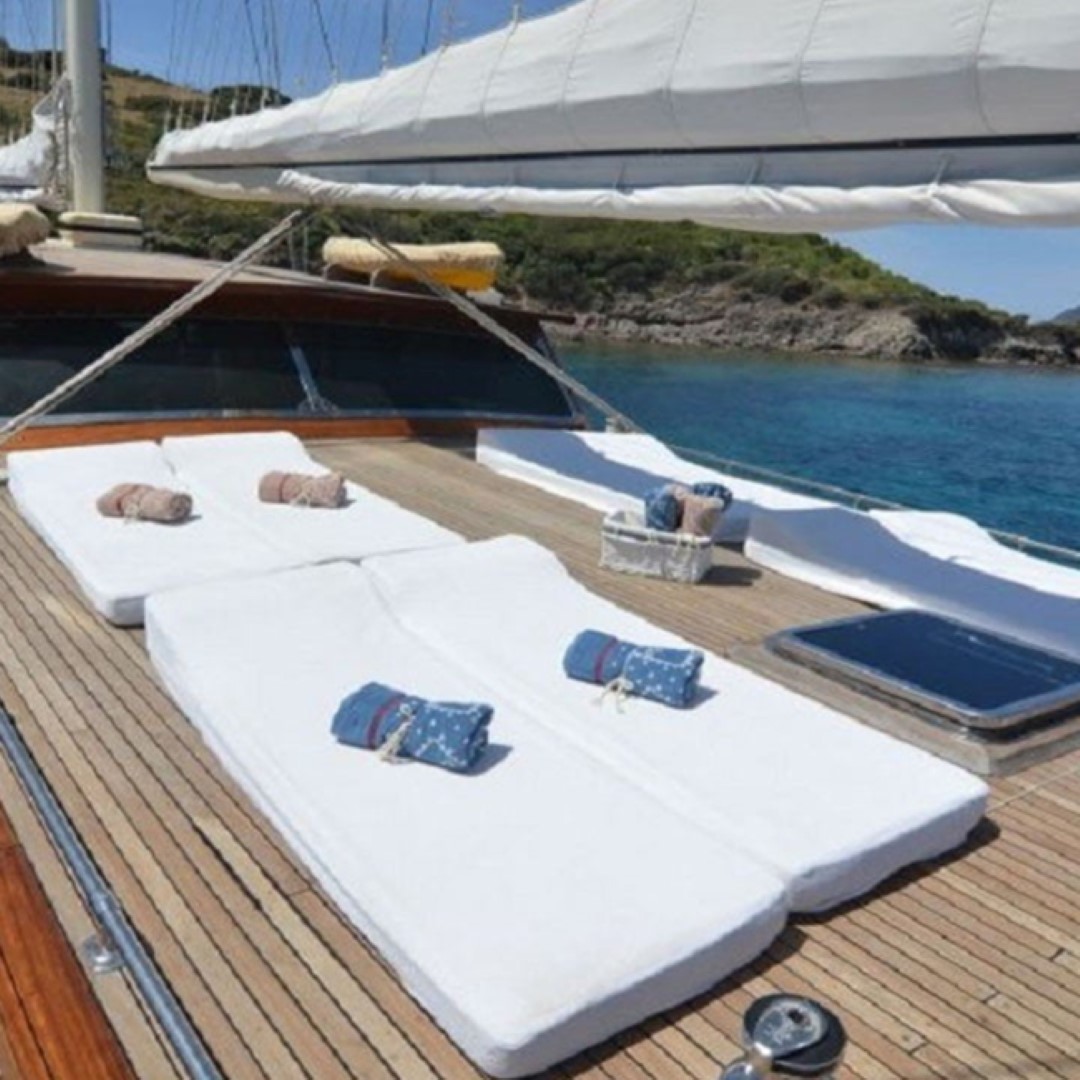 A large cushioned seating area, sunbathing area and sunbathing cushions are available on the deck in sufficient quantity.