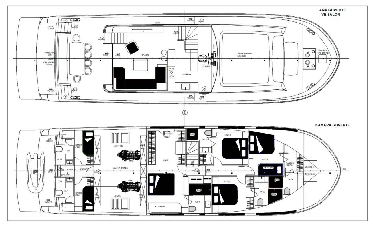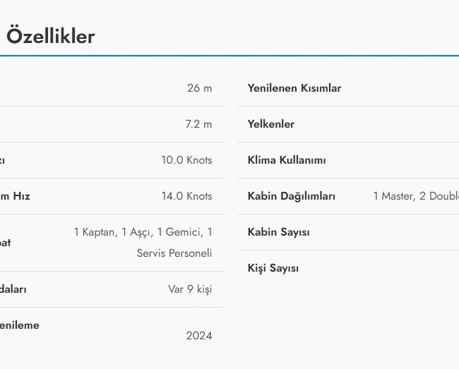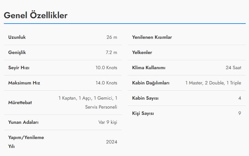 TanWay is the perfect choice for guests seeking a stylish and comfortable holiday at sea. With a length of 26 meters and a width of 7.2 meters, this elegant yacht sails under the Turkish flag, offering a luxurious blue cruise experience across the most beautiful routes of the Mediterranean. Its spacious decks and thoughtfully designed interiors provide the ideal setting for both relaxation and enjoyment.