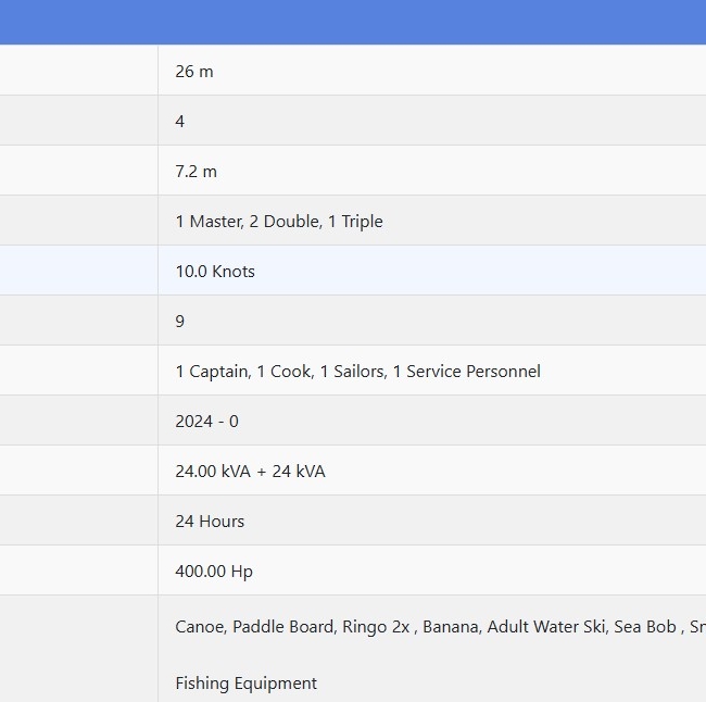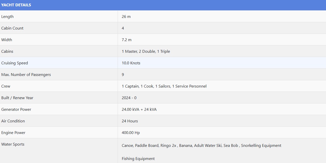 A dedicated and professional crew of 4 – including a captain, chef, deckhand, and service staff – is on board to deliver exceptional service and meet every need during the trip.