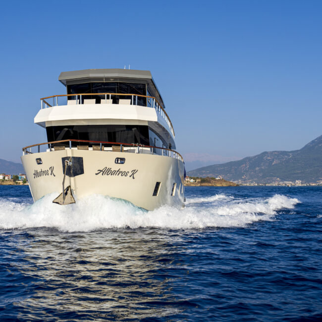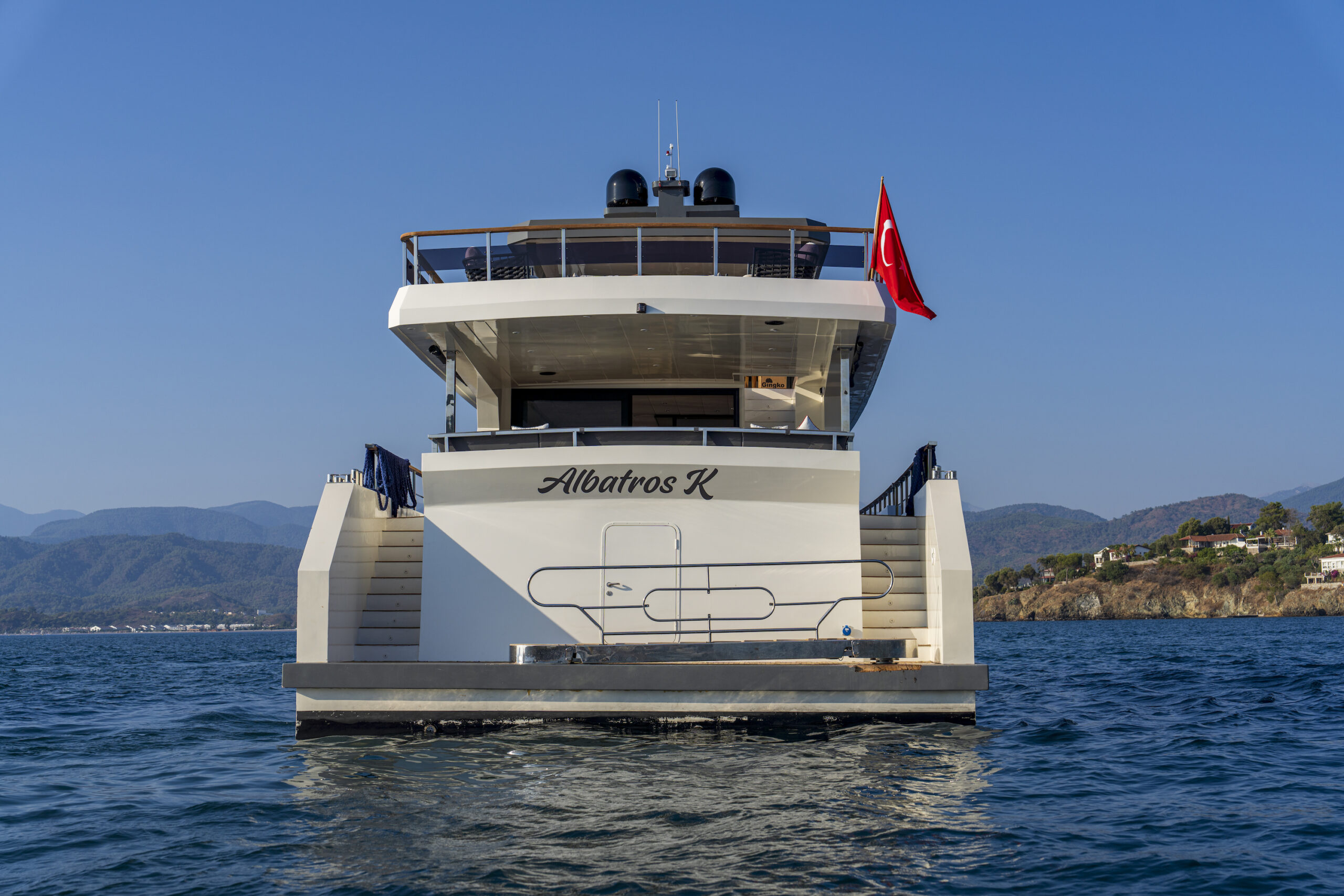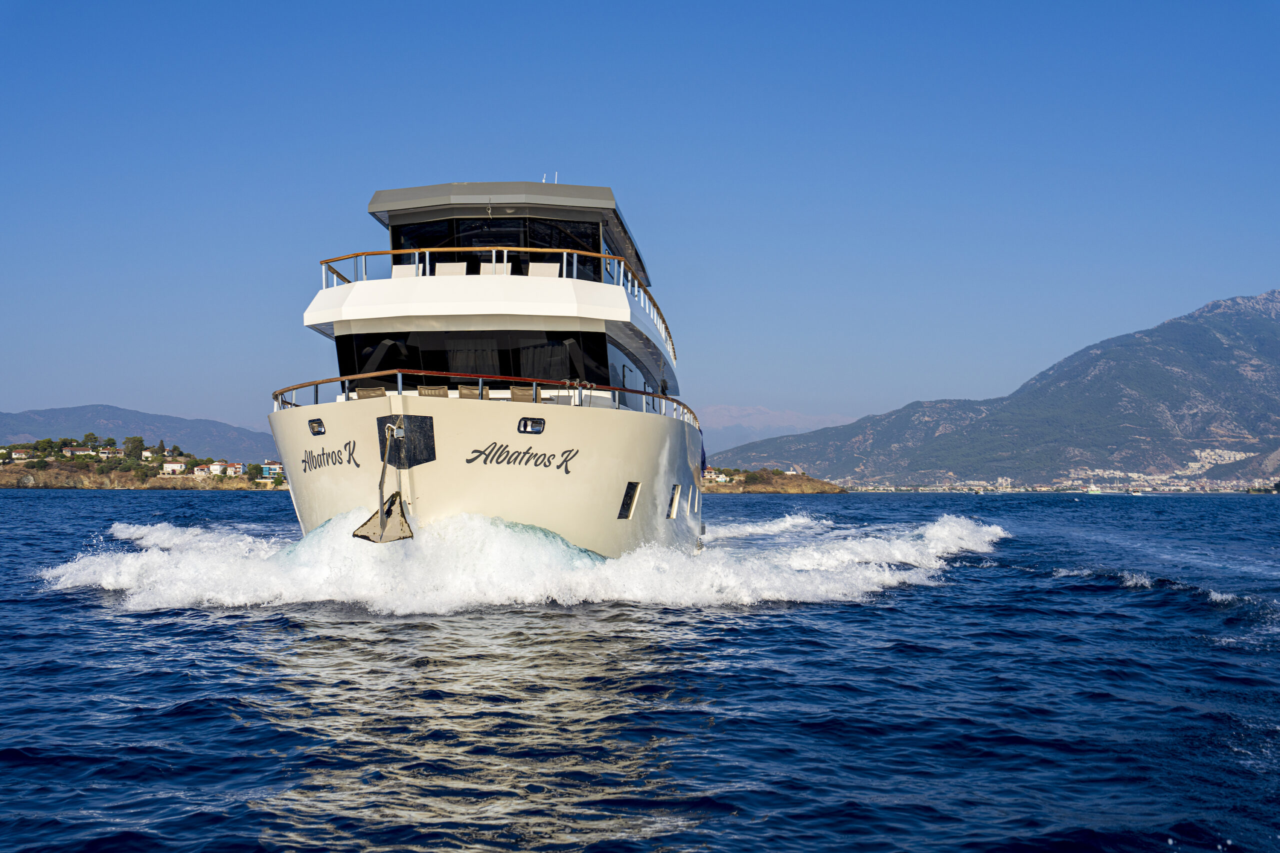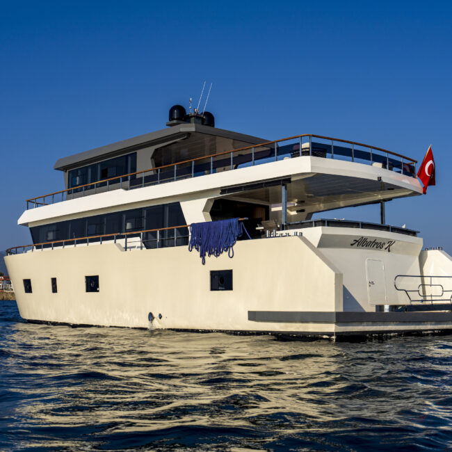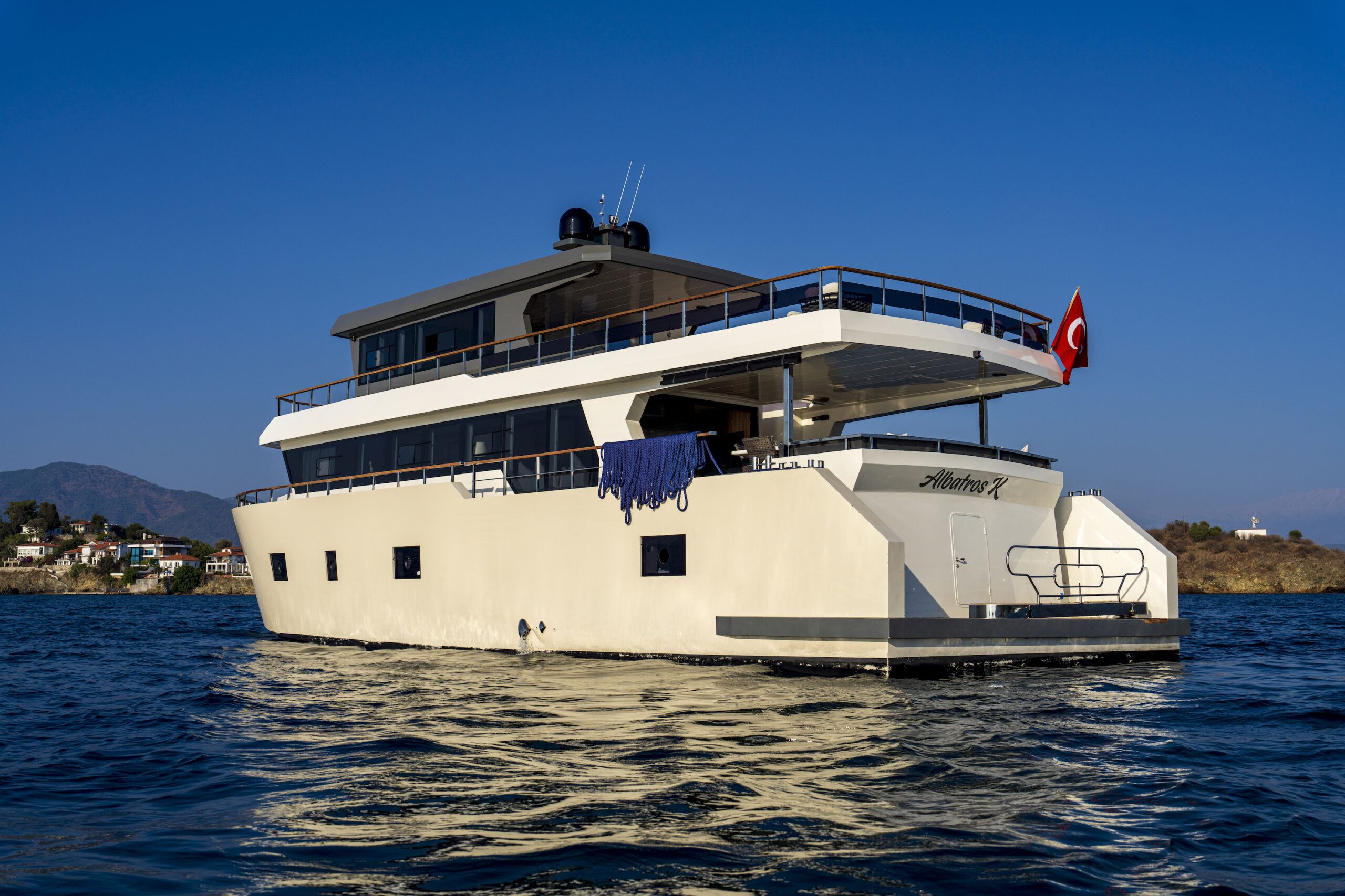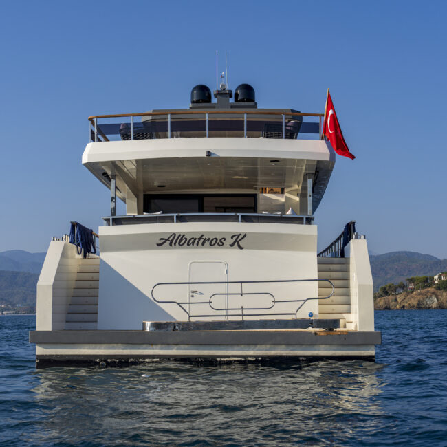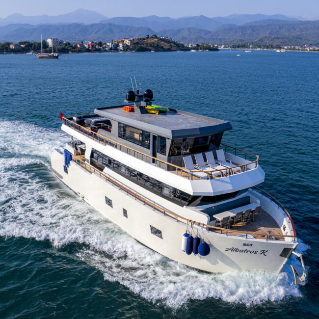 Trawler Albatros Explorer is a brand new trawler built in 2023; It is 26 meters long and 7.20 wide. Our yacht has 6 cabins, 1 masters, 4 double, and 1 twin cabin, each more stylish and comfortable than the other, with its own shower, WC and air conditioning. Separate living areas for the crew, a fully equipped kitchen, indoor and outdoor dining areas, relaxation areas, and an American bar are available. On the upper side of our yacht, there are large and comfortable sun beds where all our guests can sunbathe. You can taste our meals carefully prepared in our fully equipped kitchen at our elegant table on the deck or in the saloon. In order for our guests to have a better time, the music system, TV and satellite are located in the living room. In addition, there are options such as ice machine, coffee machine, playing cards, backgammon and okay on the yacht. The necessary equipment for fishing and water toys will always be available for your use to make your holiday more enjoyable. You can experience a holiday beyond your expectations with its experienced and friendly team.
