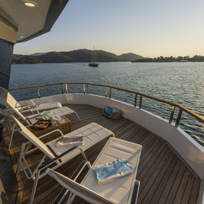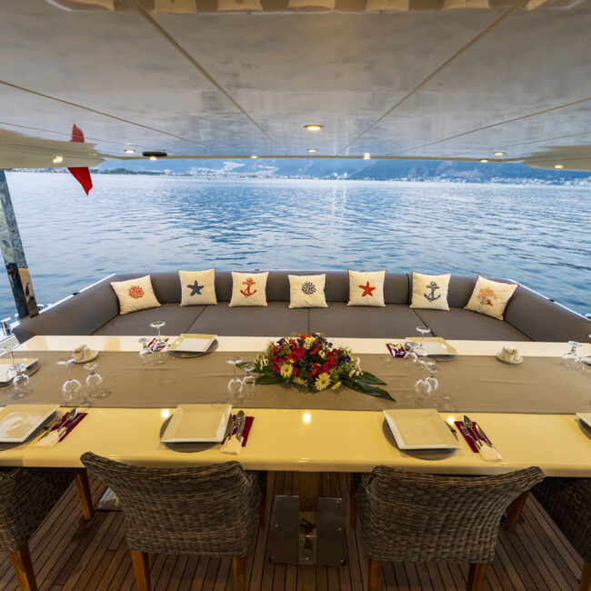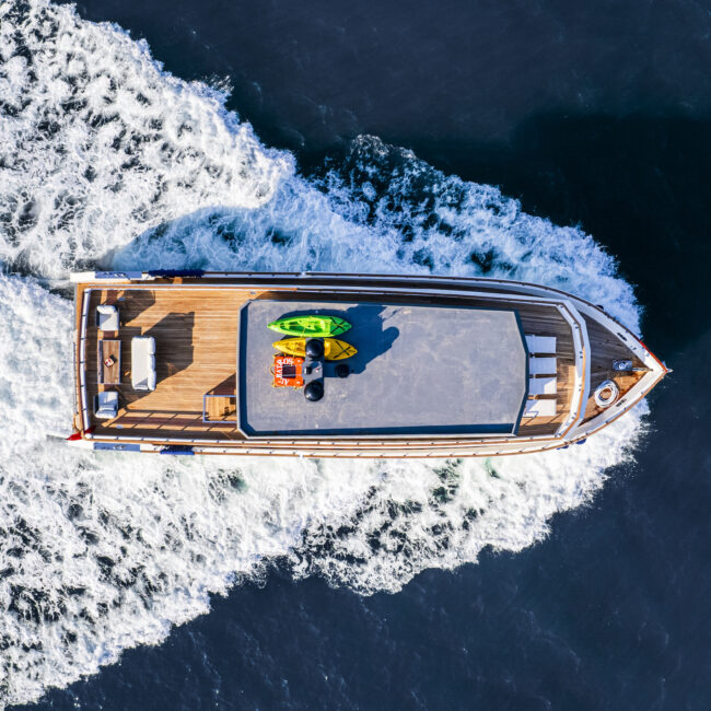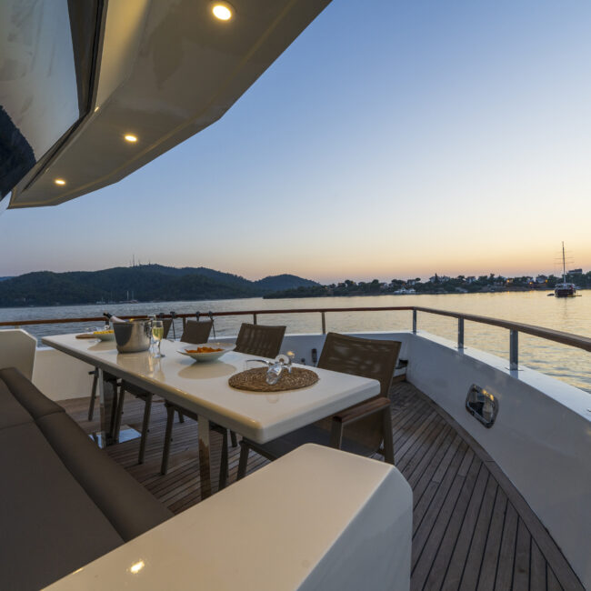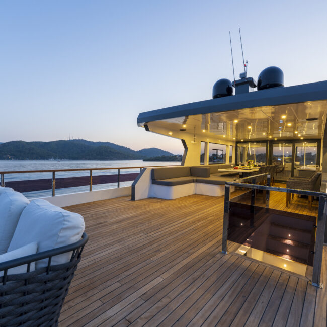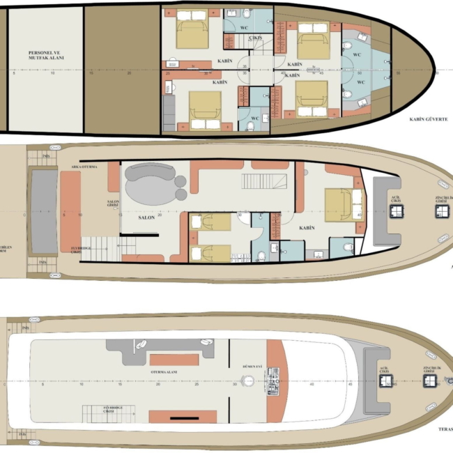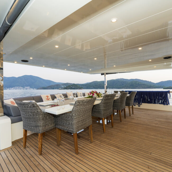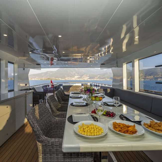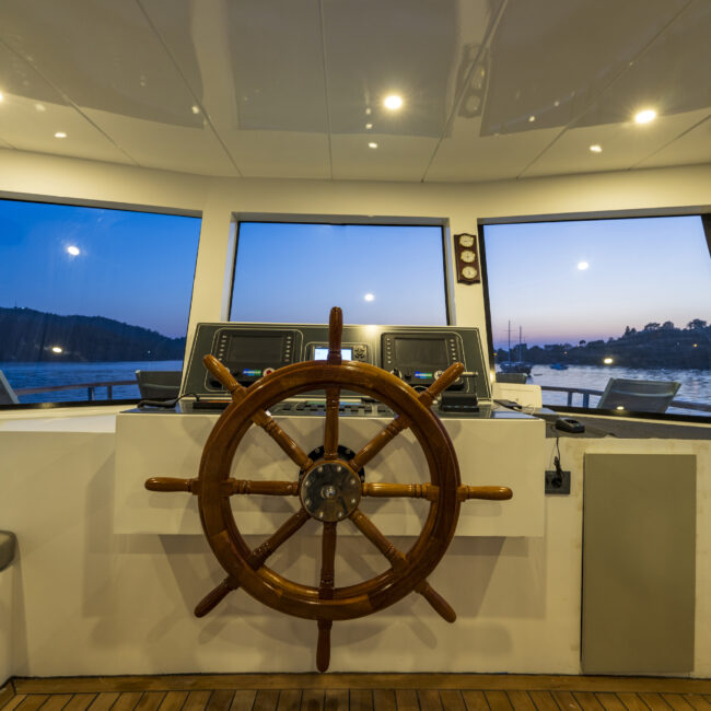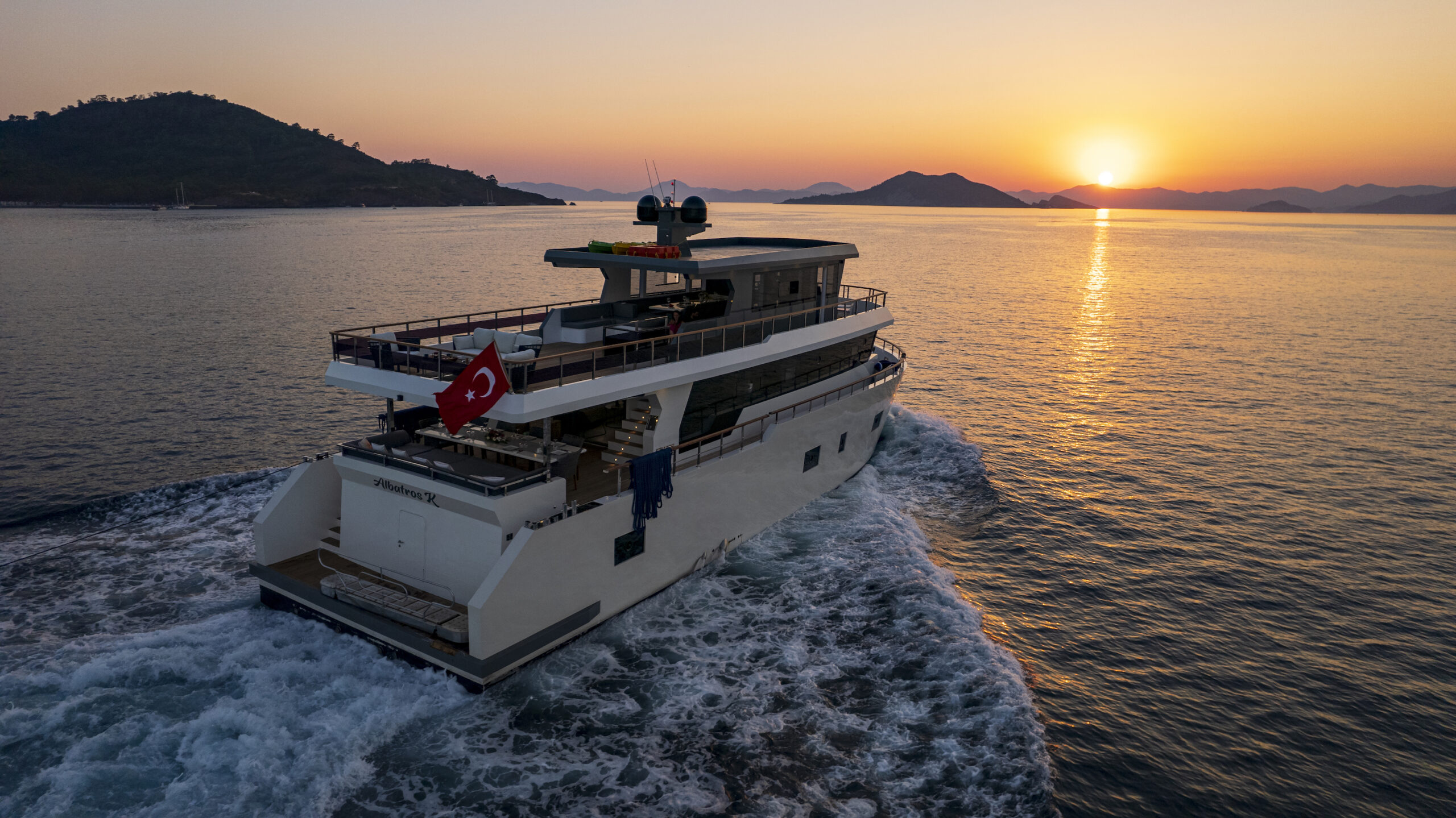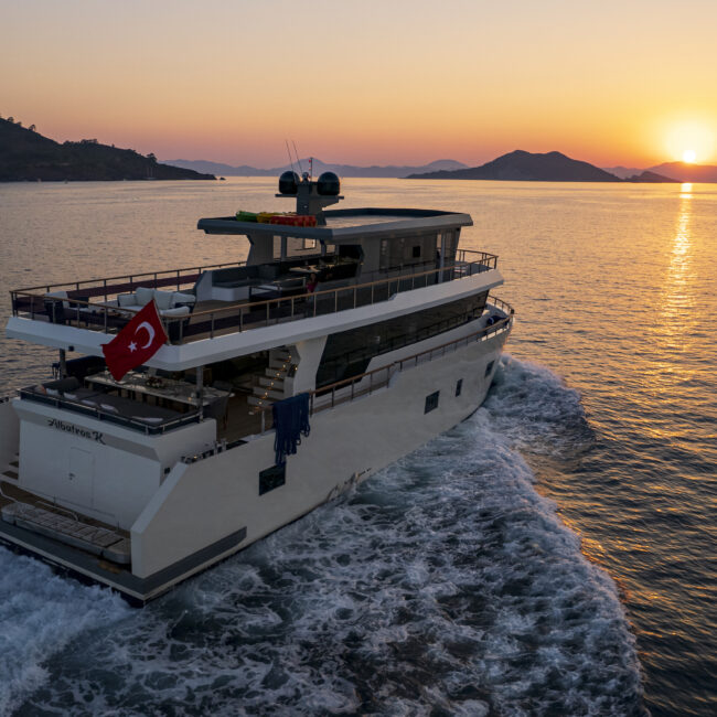 Trawler Albatros Explorer is a brand new trawler built in 2023; It is 26 meters long and 7.20 wide. Our yacht has 6 cabins, 1 masters, 4 double, and 1 twin cabin, each more stylish and comfortable than the other, with its own shower, WC and air conditioning. Separate living areas for the crew, a fully equipped kitchen, indoor and outdoor dining areas, relaxation areas, and an American bar are available. On the upper side of our yacht, there are large and comfortable sun beds where all our guests can sunbathe. You can taste our meals carefully prepared in our fully equipped kitchen at our elegant table on the deck or in the saloon. In order for our guests to have a better time, the music system, TV and satellite are located in the living room. In addition, there are options such as ice machine, coffee machine, playing cards, backgammon and okay on the yacht. The necessary equipment for fishing and water toys will always be available for your use to make your holiday more enjoyable. You can experience a holiday beyond your expectations with its experienced and friendly team.