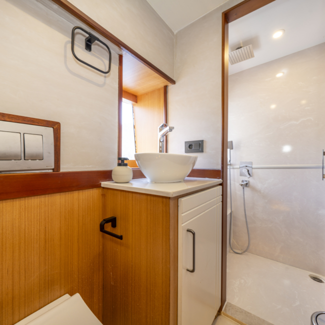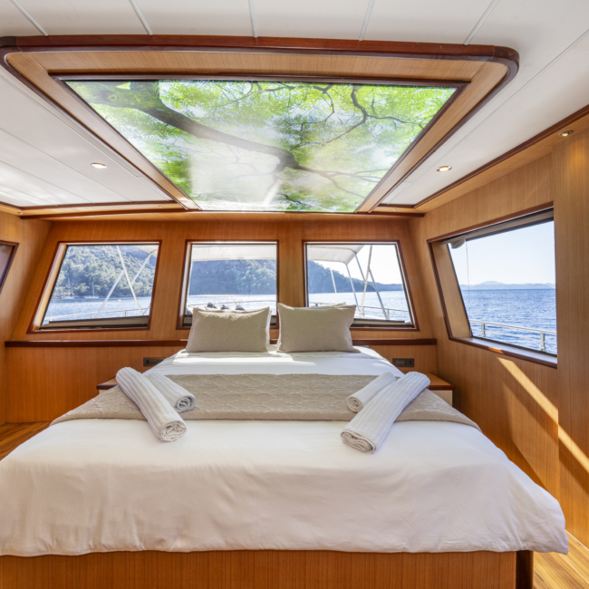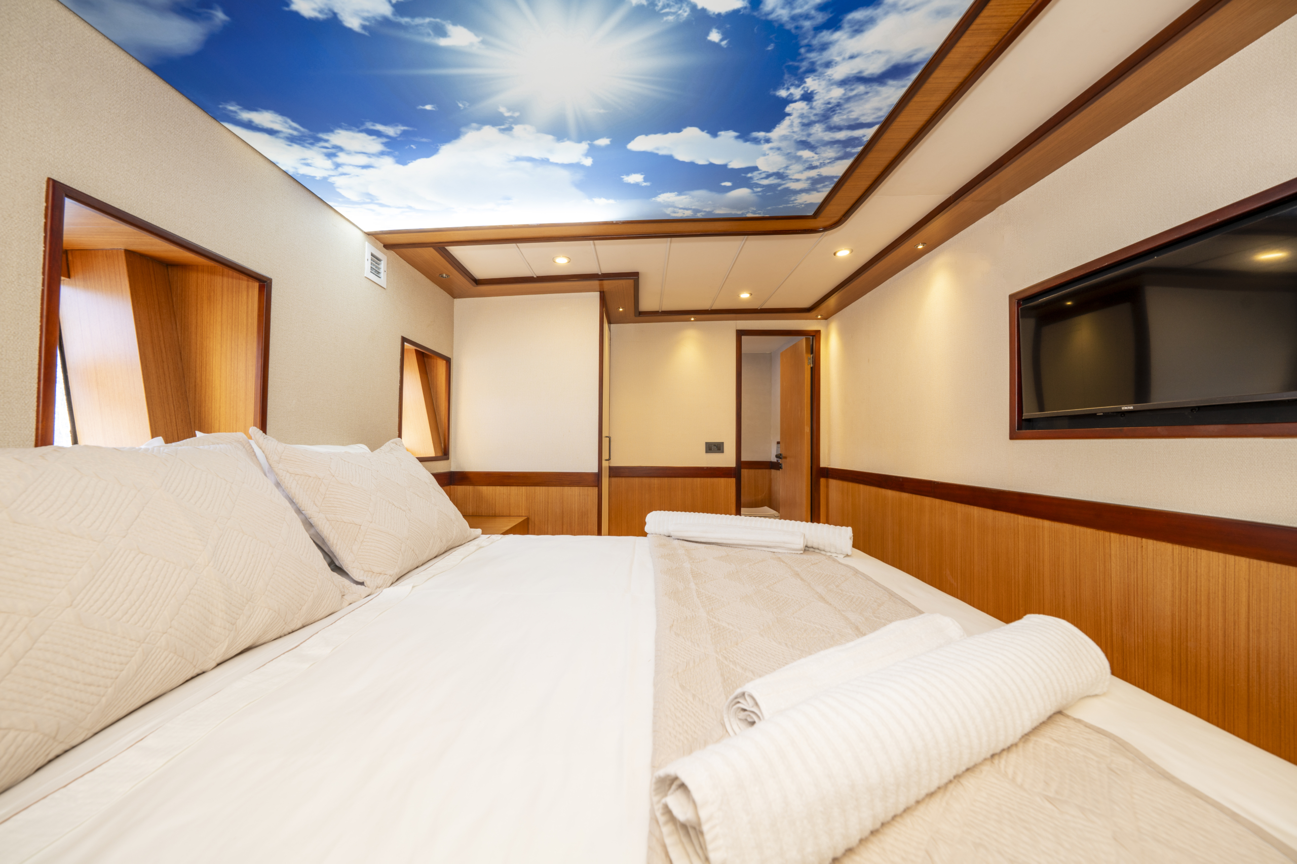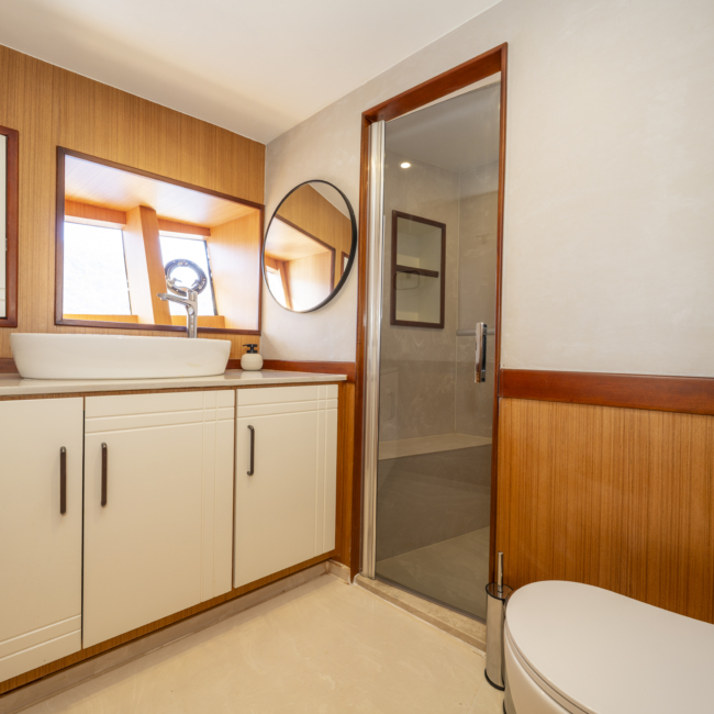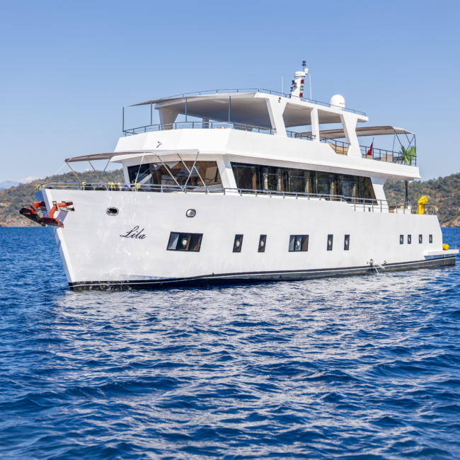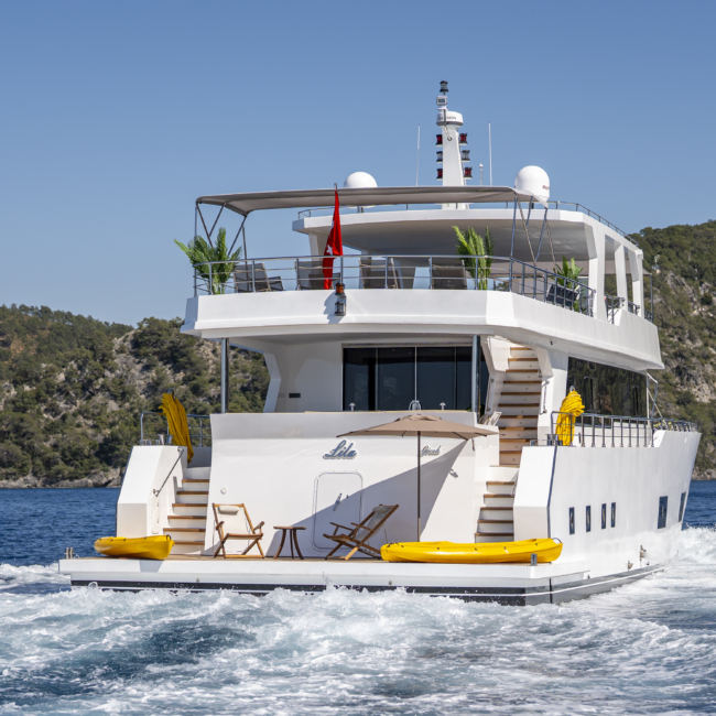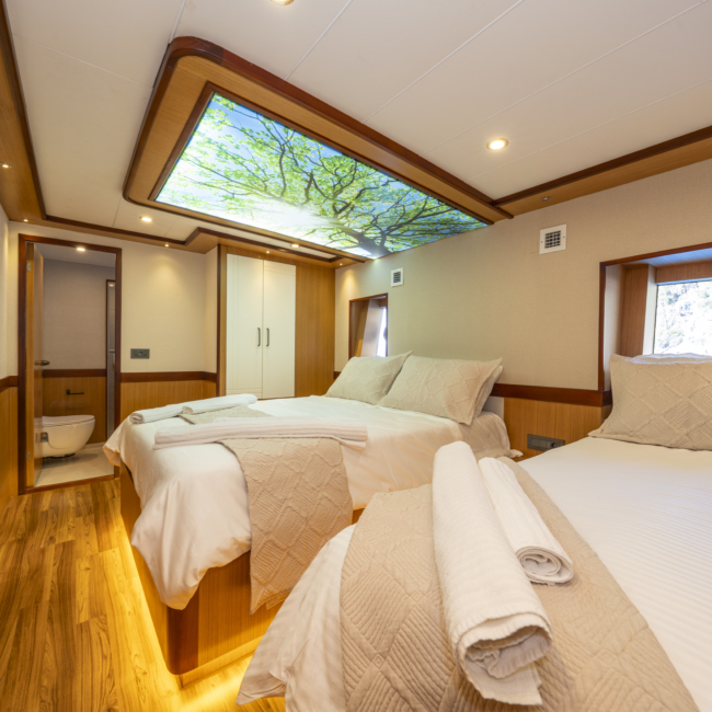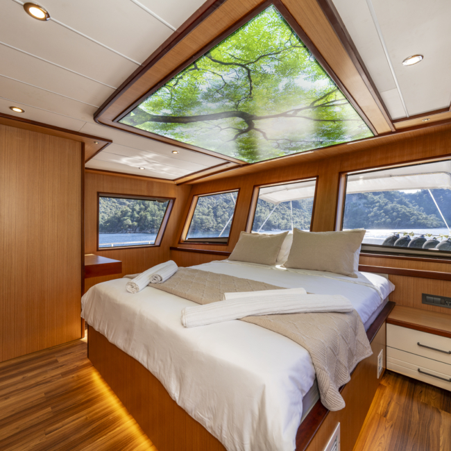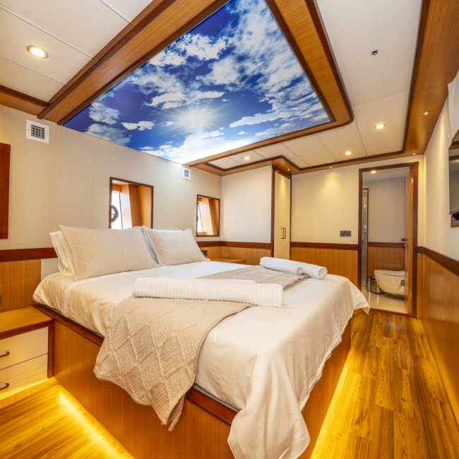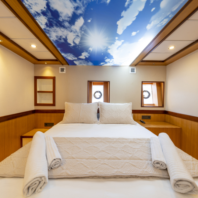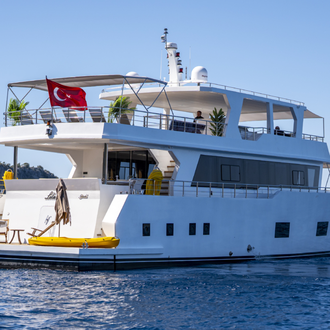 Our trawler yacht, built in 2025, with every detail carefully considered, prioritizing comfort and elegance, offers the comfort of a 5-star luxury hotel on the sea to our valued guests. This luxury yacht, designed with high quality materials and the latest technological tools, promises you an extremely safe sea travel. Our trawler type boat is 26 meters long and 7.2 meters wide. It has 2 main machines producing 450 horsepower and 2 33 kilowatt generators. Our luxury yacht has 5 cabins that can accommodate 12 people. It consists of 3 double and 2 triple cabins and is ideal for groups of 12 guests. Each cabin has 8-hour air conditioning, TV, private bathroom and toilet.