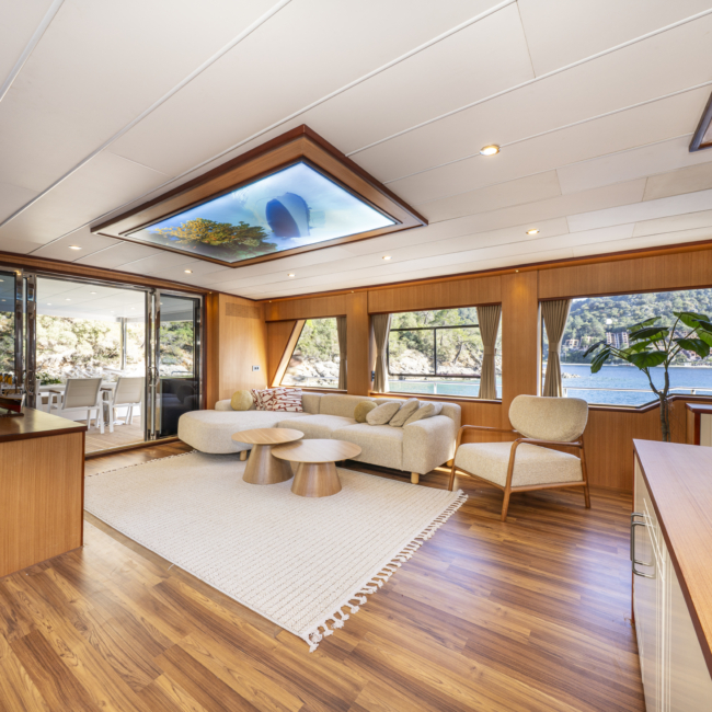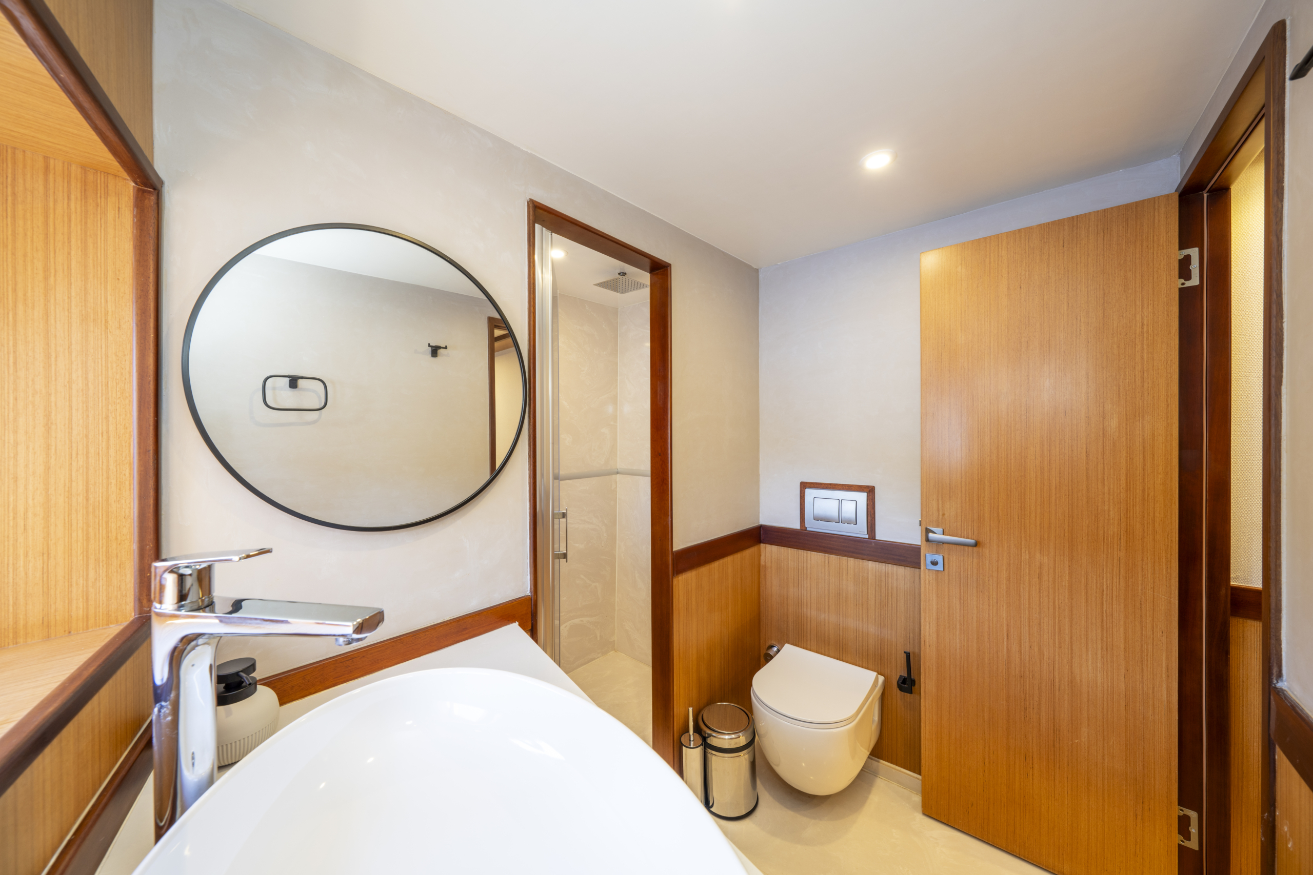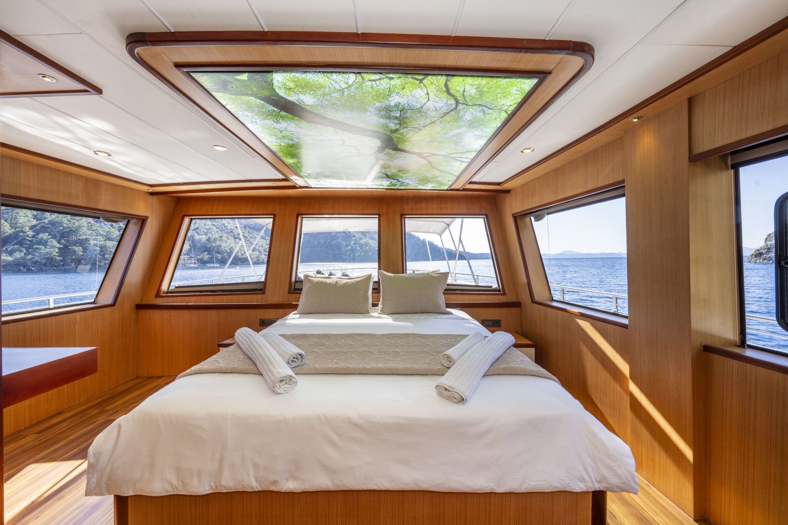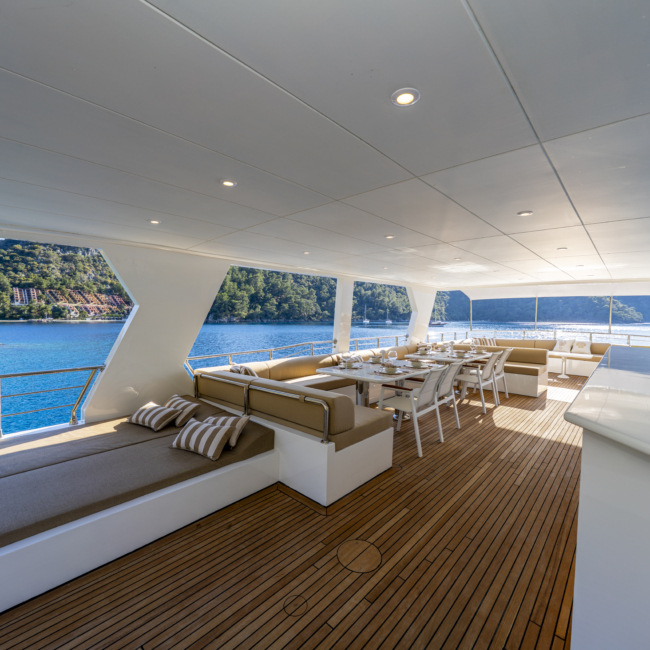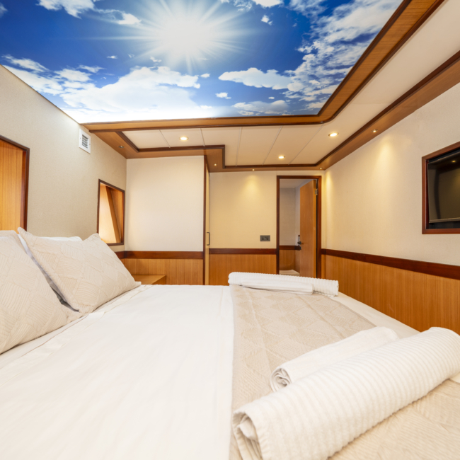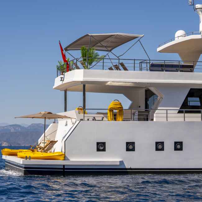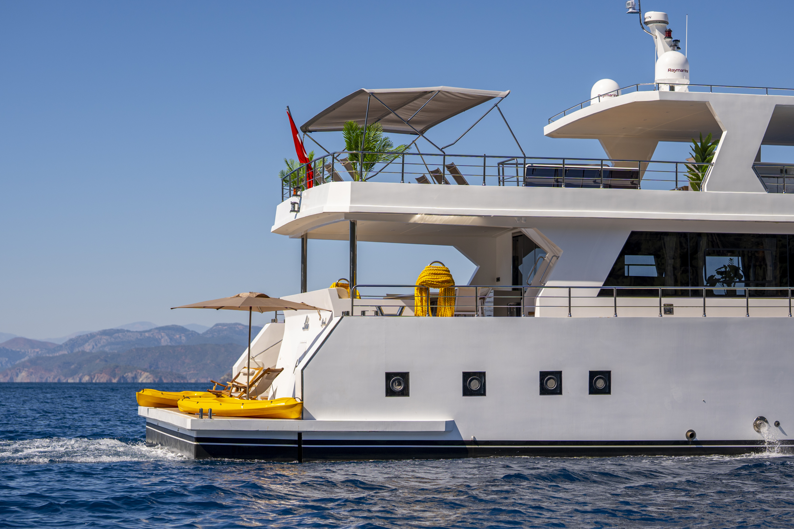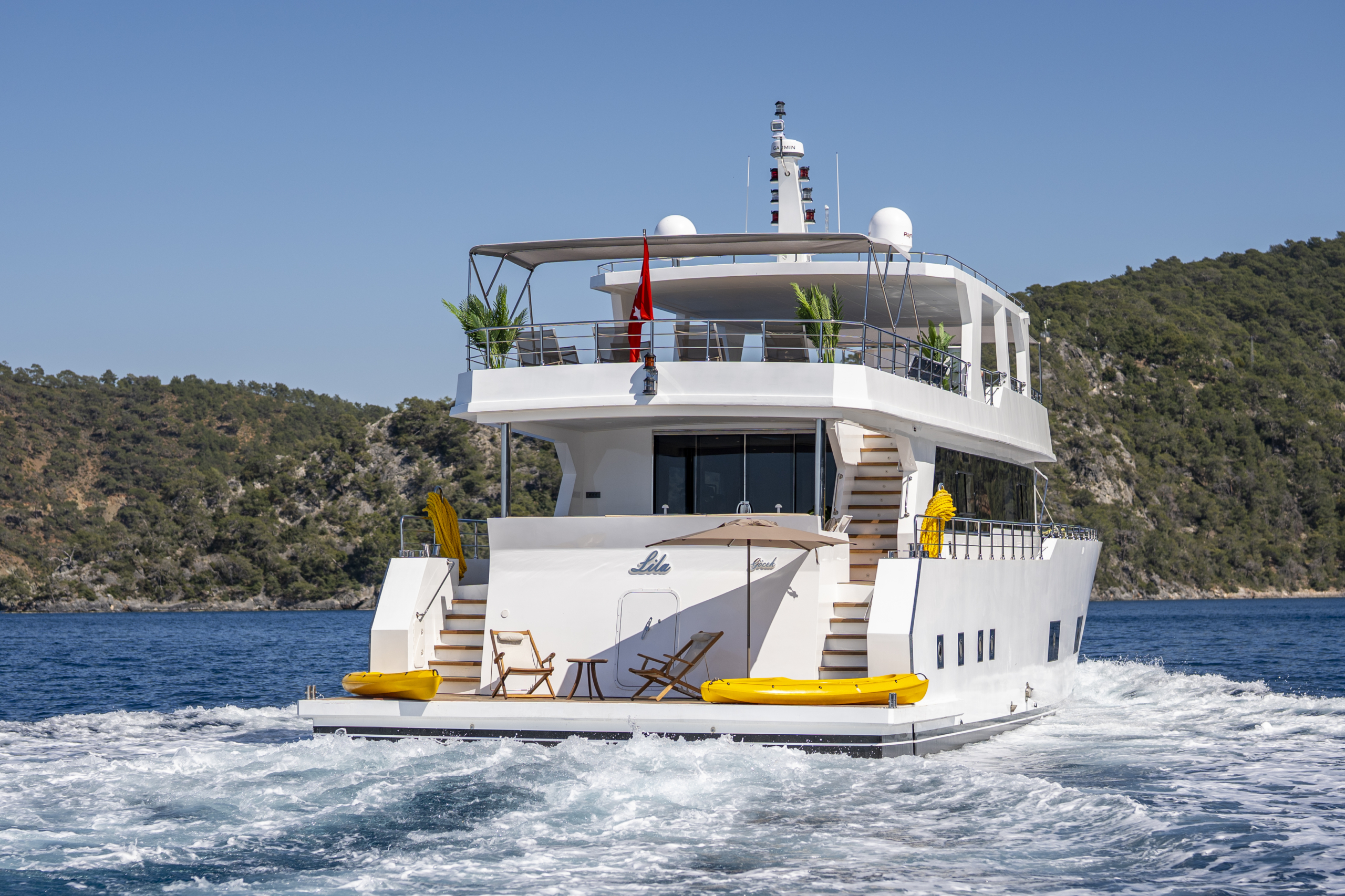 Our trawler yacht, built in 2025, with every detail carefully considered, prioritizing comfort and elegance, offers the comfort of a 5-star luxury hotel on the sea to our valued guests. This luxury yacht, designed with high quality materials and the latest technological tools, promises you an extremely safe sea travel. Our trawler type boat is 26 meters long and 7.2 meters wide. It has 2 main machines producing 450 horsepower and 2 33 kilowatt generators. Our luxury yacht has 5 cabins that can accommodate 12 people. It consists of 3 double and 2 triple cabins and is ideal for groups of 12 guests. Each cabin has 8-hour air conditioning, TV, private bathroom and toilet.
